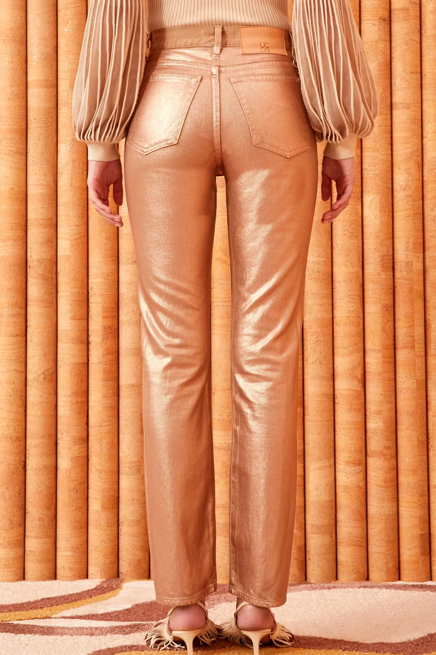 Our Forever Favorite Agnes Jean Returns For Pre-Spring ’24 In A Copper Foiled Wash–The Denim Is Dyed Our Light Pink Rosewood Wash, Then Foil Is Hand-Applied On Top To Create A Lovely Metallic Finish. This Straight-Leg Silhouette Is Handmade In Los Angeles And Features A High-Waist And Elegant, Clean Lines, Along With A Logo-Embossed Leather Patch And A Hand-Hammered Ring Attached To The Back Belt Loop.