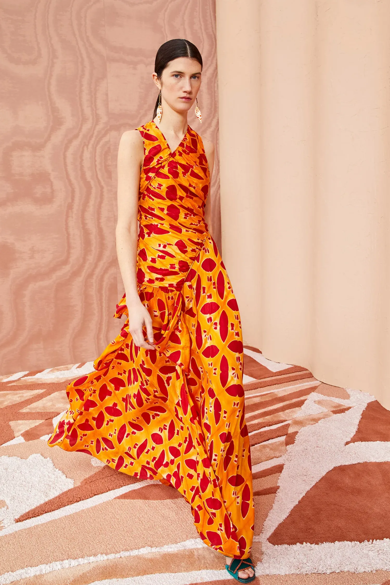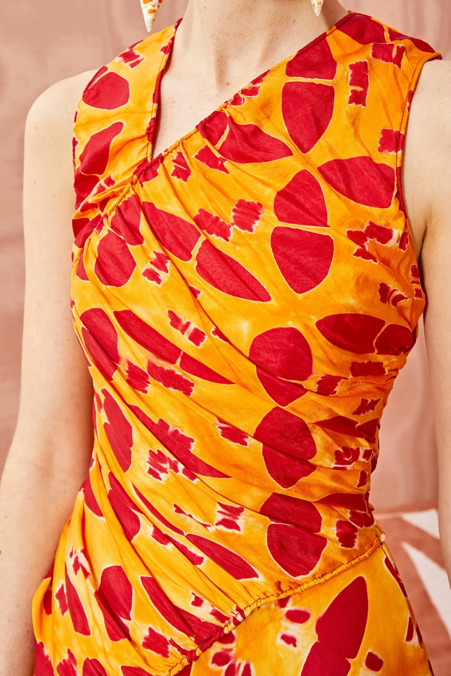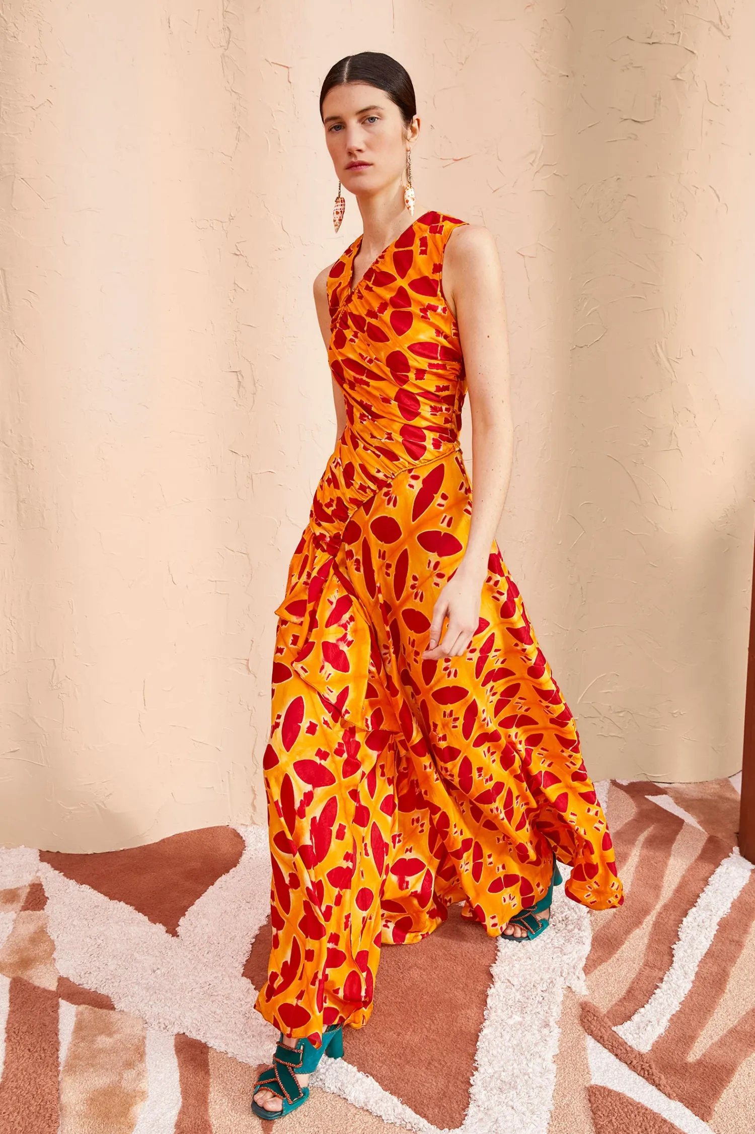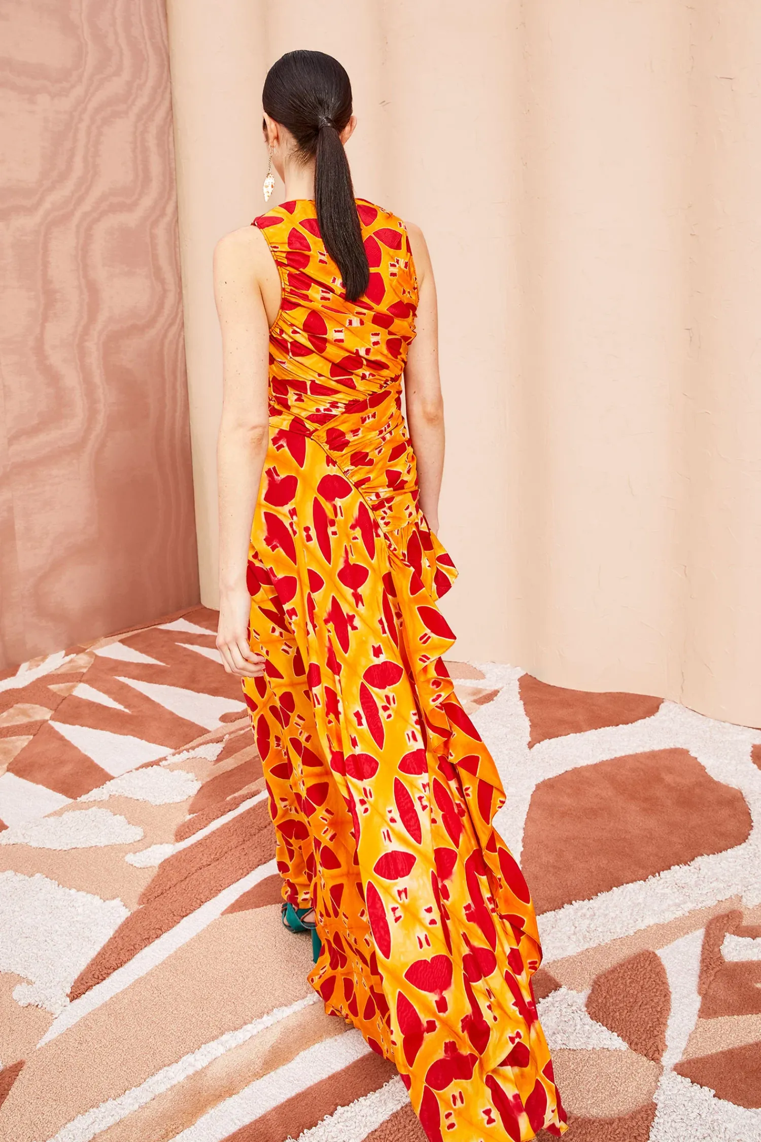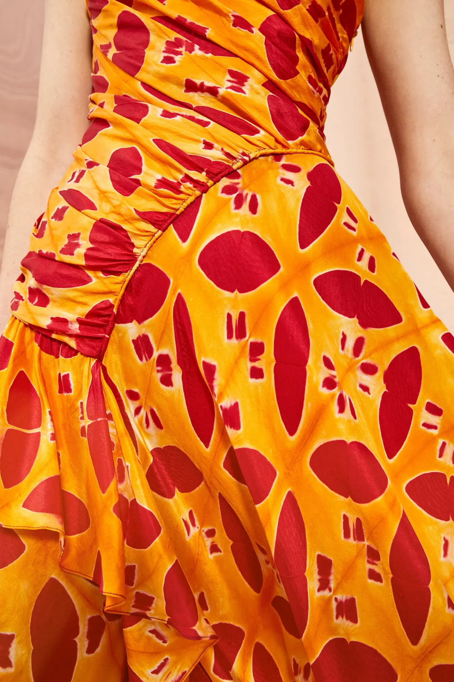An Ulla Johnson Exclusive Only Available In Our Stores Or On Our Website, The Alani Gown Is Handcrafted From A Fabric Made By A Collective Of Women In Bangalore, Using An Intricate Technique Known As Clamp Dyeing That Creates Beautifully Prismatic Patterns. No Two Pieces Are Alike. This Red And Orange Full-Length Gown Features A Densely Ruched Bodice, Asymmetrical Curved Front Seam, And A Cascading Ruffle That Defines Its Full Skirt. Finished With A Side-Seam Zipper Closure.