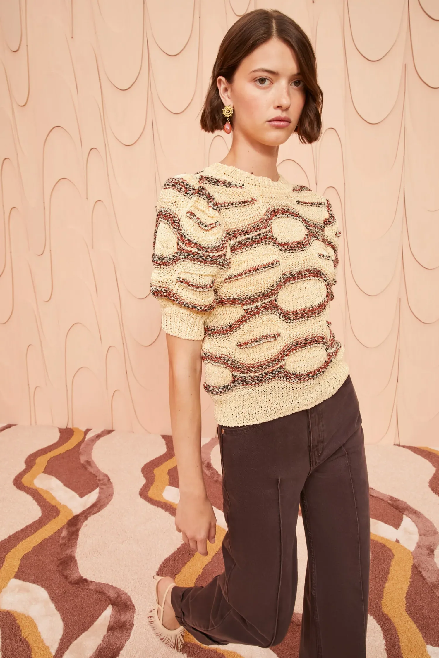 A Best-Loved Silhouette, The Alba Top Is A Cream, Brown, And Red Beauty Spun Using A Tuck Stitch Technique That Creates An Intricate, Three-Dimensional Finish. This Crewneck Style Is Defined By Puff Short Sleeves And Is Finished With Ribbed Trims For Definition.