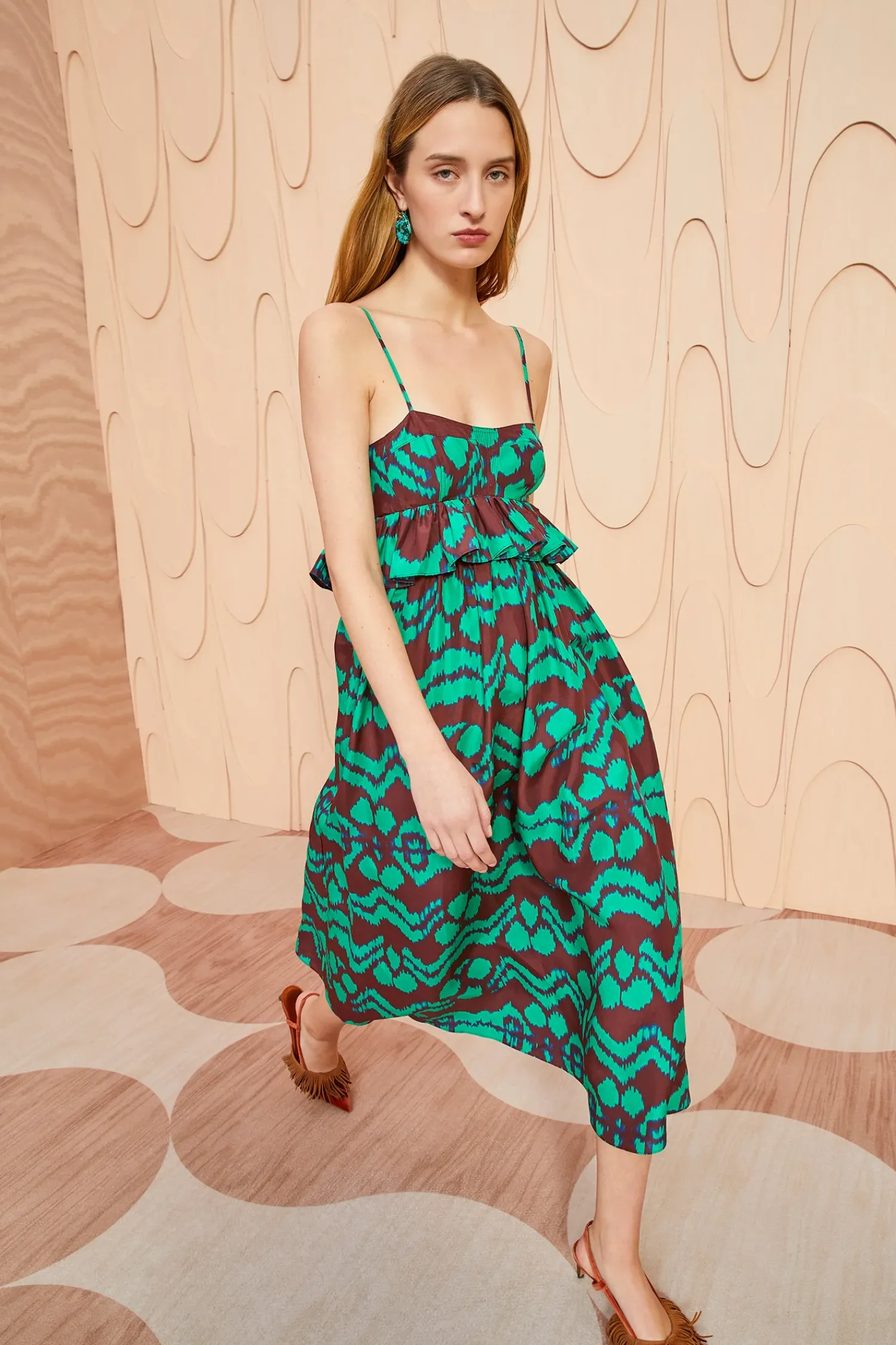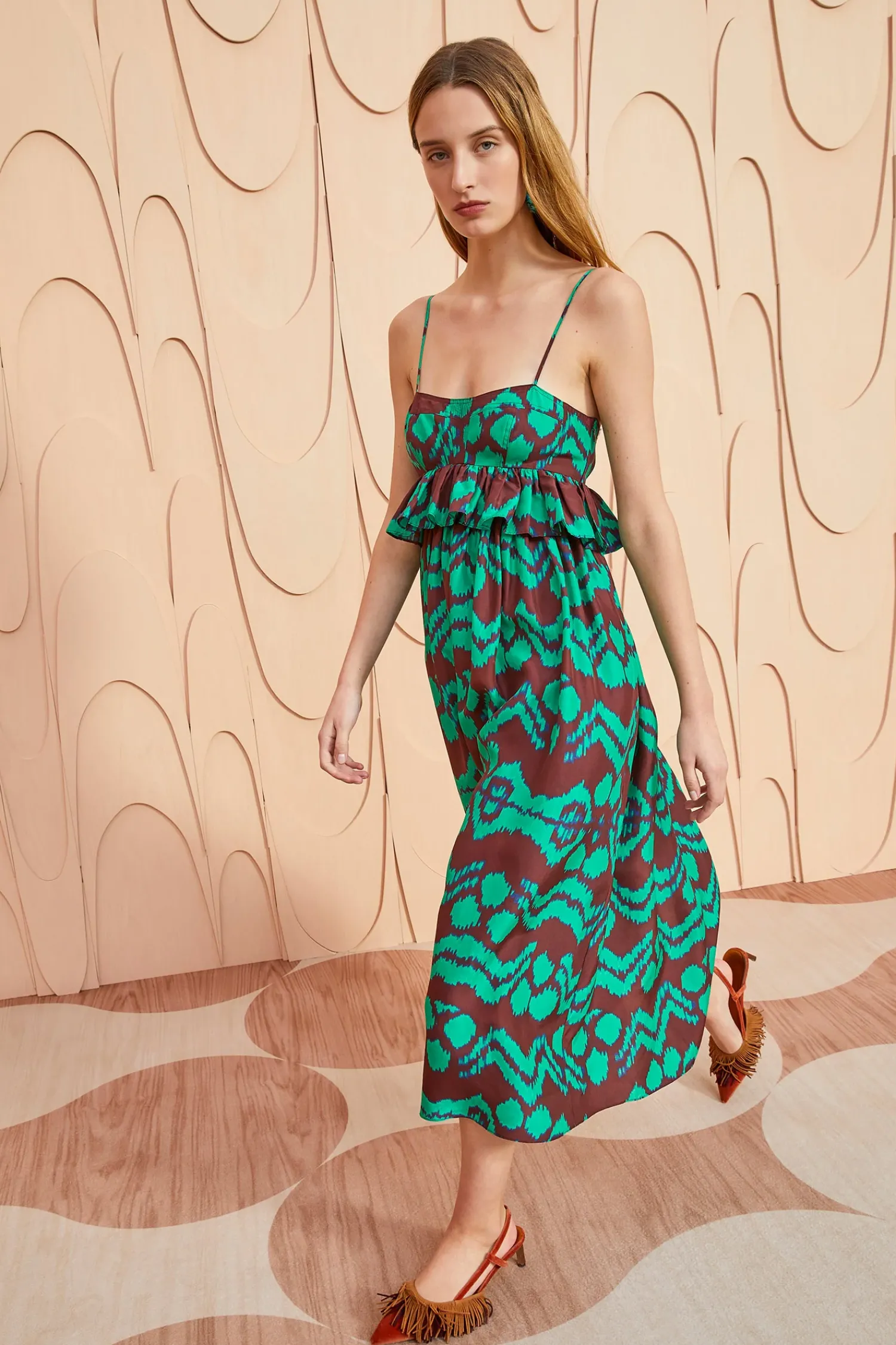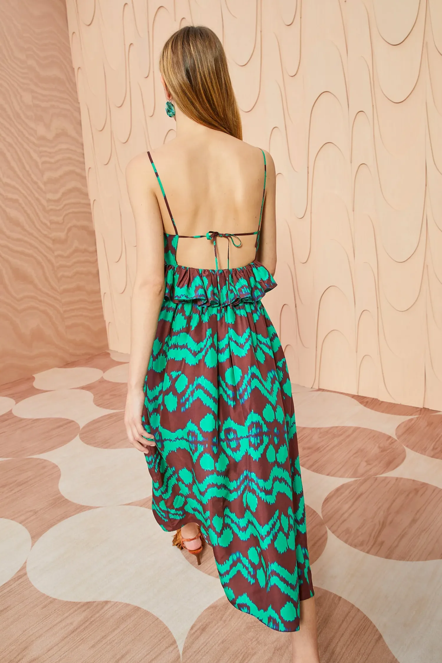 A Richly Patterned Beauty, The Amaliya Dress Is Made From Taffeta That’S Saturated In Our Painted Ikat Motif In Vivid Green And Mahogany. Suspended From Pin-Thin Straps, This Sleeveless Midi Dress Is Traced With Fluttering Ruffles At The Empire Waist And Turns To Reveal Delicate Ties That Fasten At The Back.