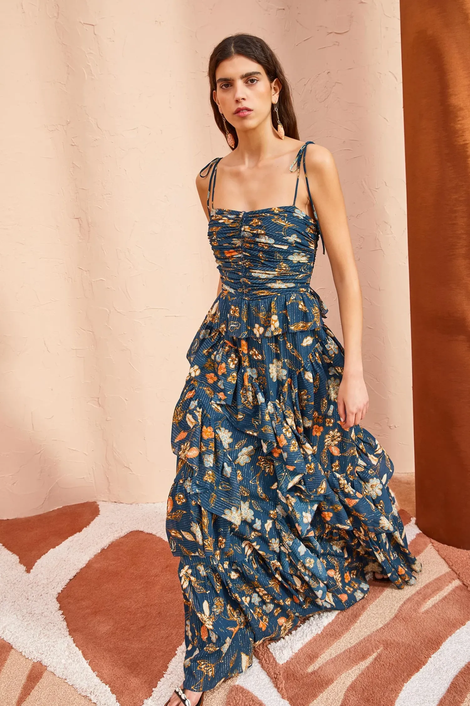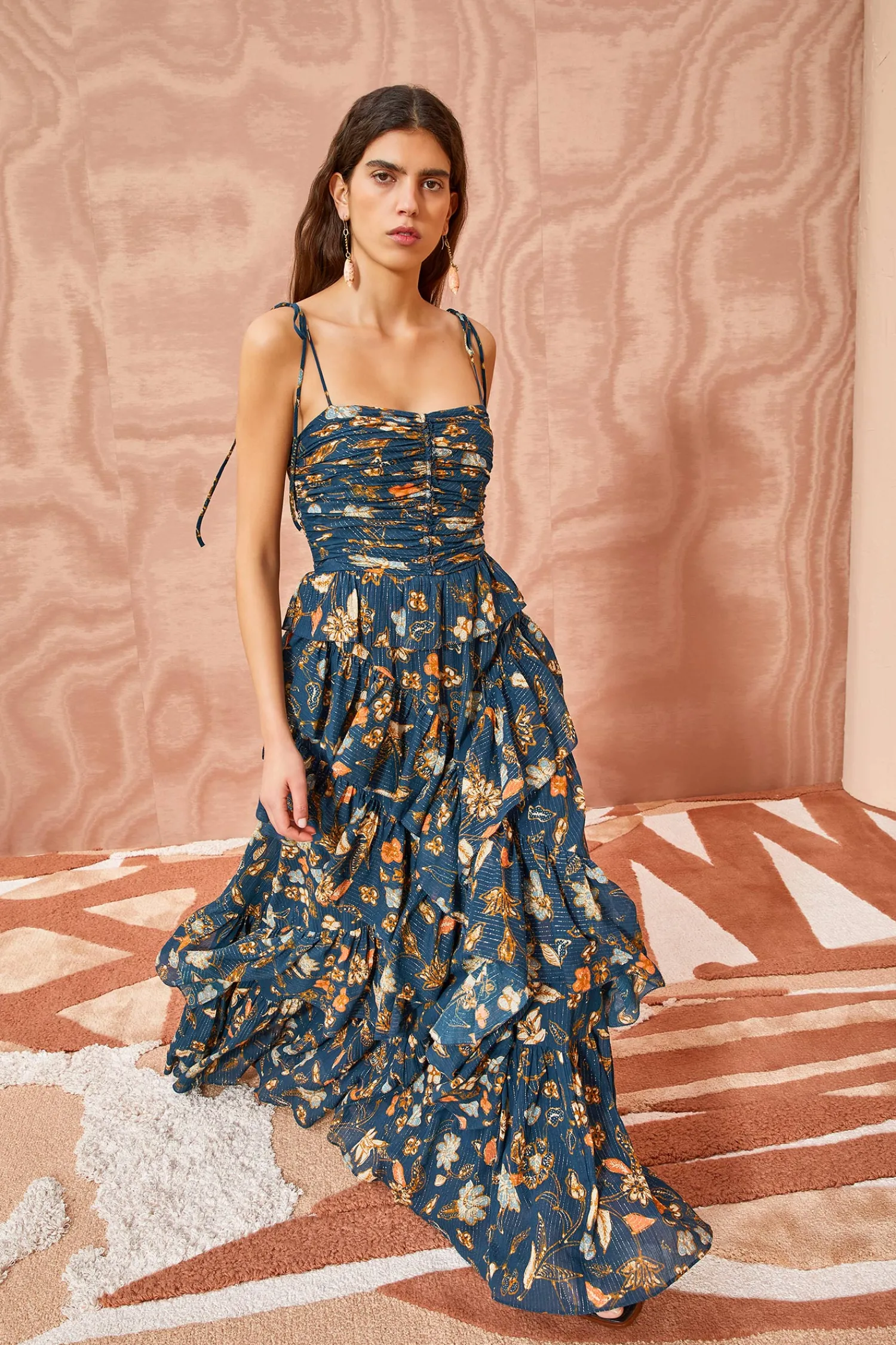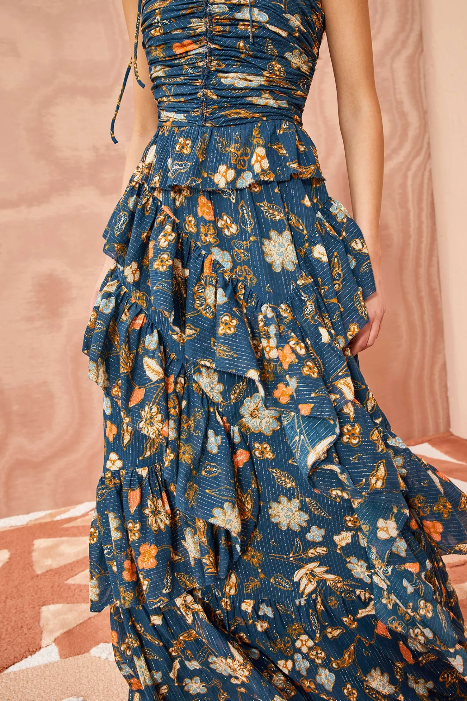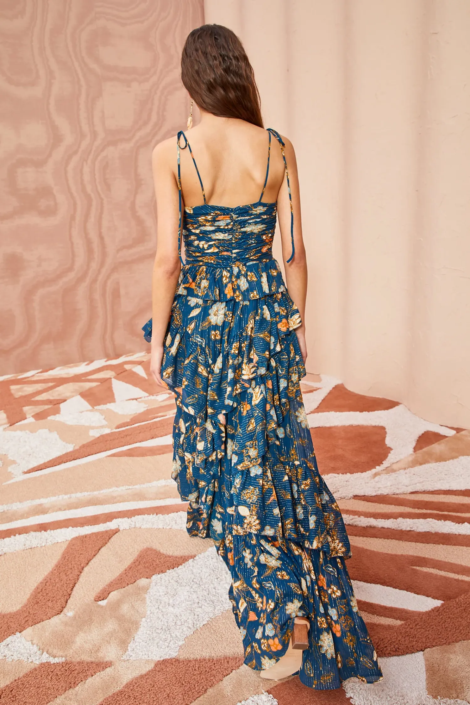 The Aveline Gown Is A Stunning Floor-Length Silhouette, Cut In Our Lurex Striped Silk Crinkle Chiffon. This Ulla Johnson Bestseller Is Defined By Its Smocked, Fitted Bodice And Delicate Spaghetti Straps That Tie At The Shoulders. This Rich Blue Floral Printed Maxi Dress Features Cascading Ruffles Down To The Hemline.