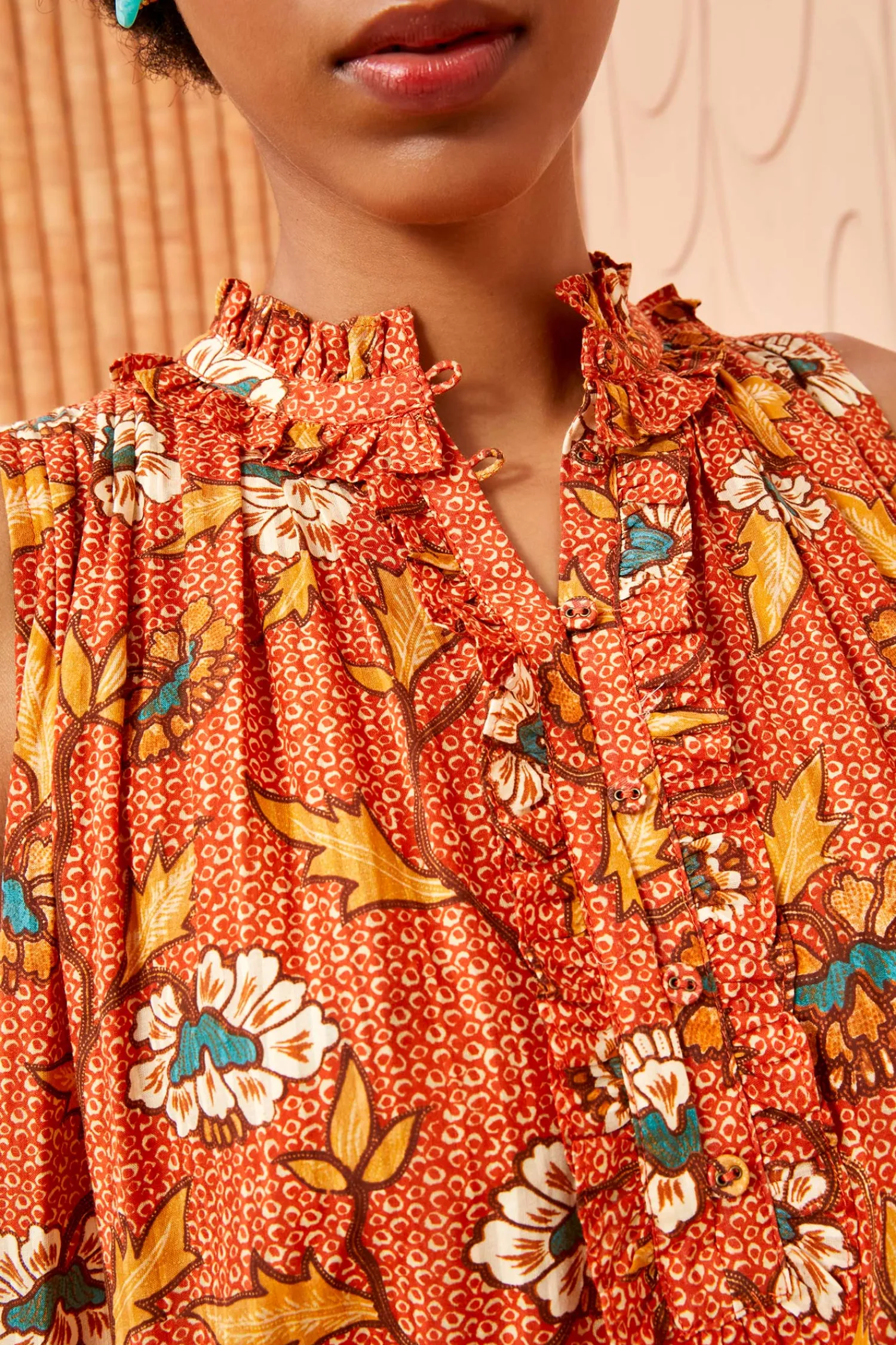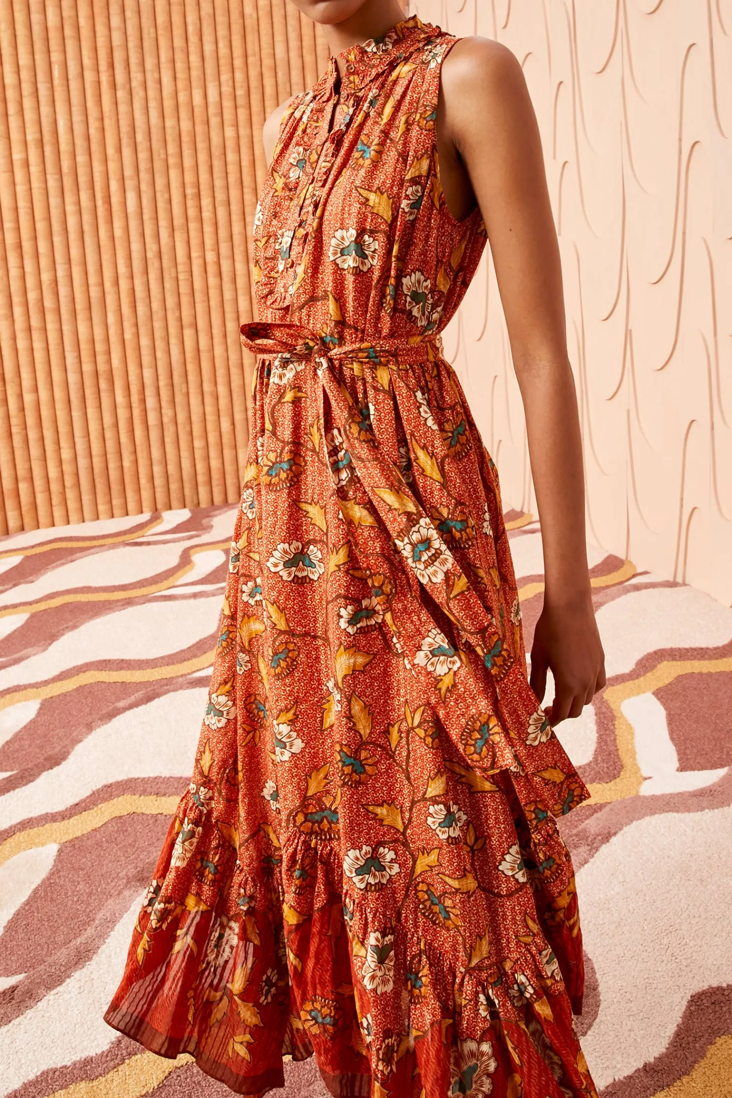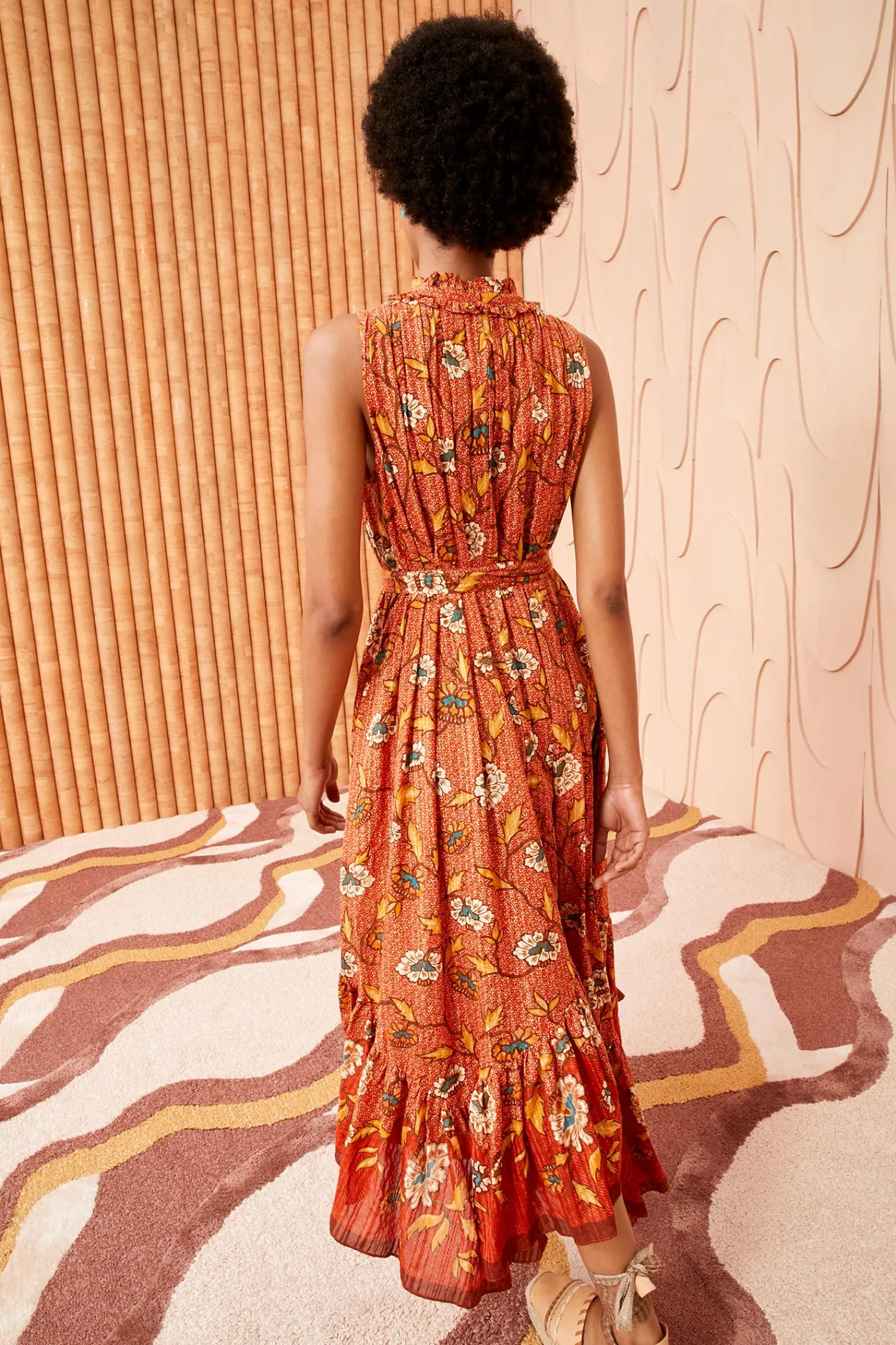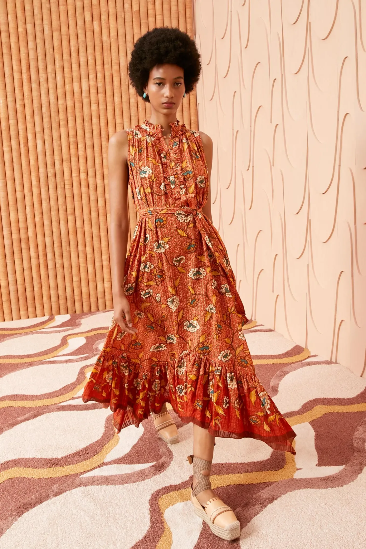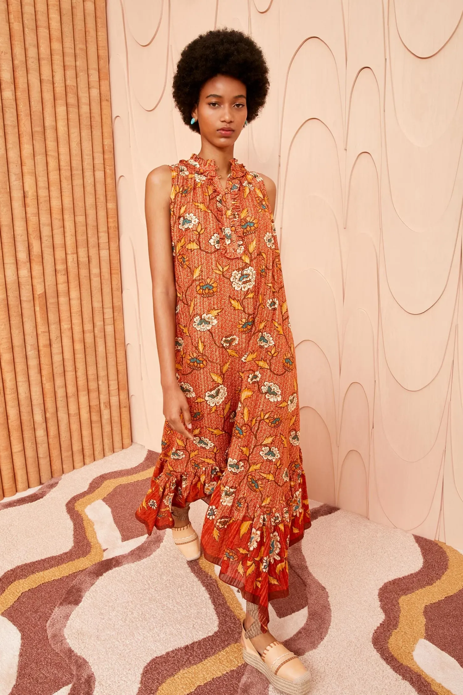 The Beverly Dress Is Made From Our Shadow Stripe Cotton-Blend That’S Patterned With Vintage, Batik-Inspired Botanicals With Notes Of Red. Traced With Subtle Ruffles, This Sleeveless Dress Floats To A Midi Silhouette That You Can Temper With A Belt And Has A Handkerchief Hem. It Fastens With A Button Front Placket.
