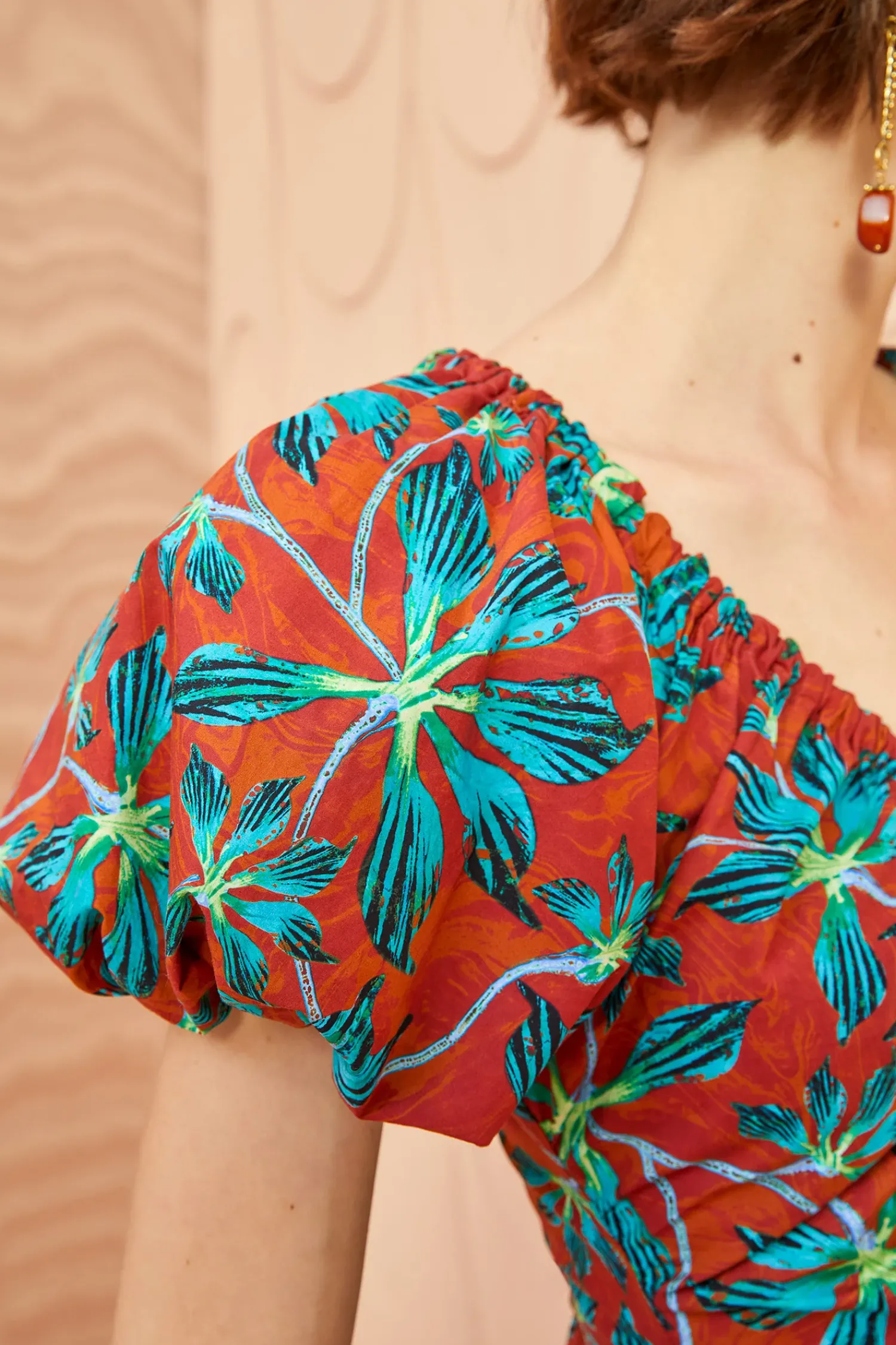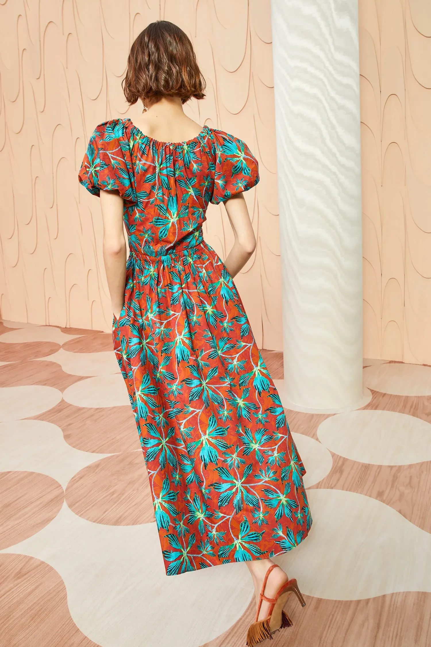 A Classic Ulla Johnson Silhouette, The Cecile Dress Is Cut From Our Signature Cotton Poplin Adorned With Wildly Surreal Blooms Set Against A Swirling Deep Red Background. This Floral Dress Features Vivid Pigments Of Turquoise And Lime, A Smocked Bodice With Architectural Puff Sleeves, And A Voluminous A-Line Skirt.