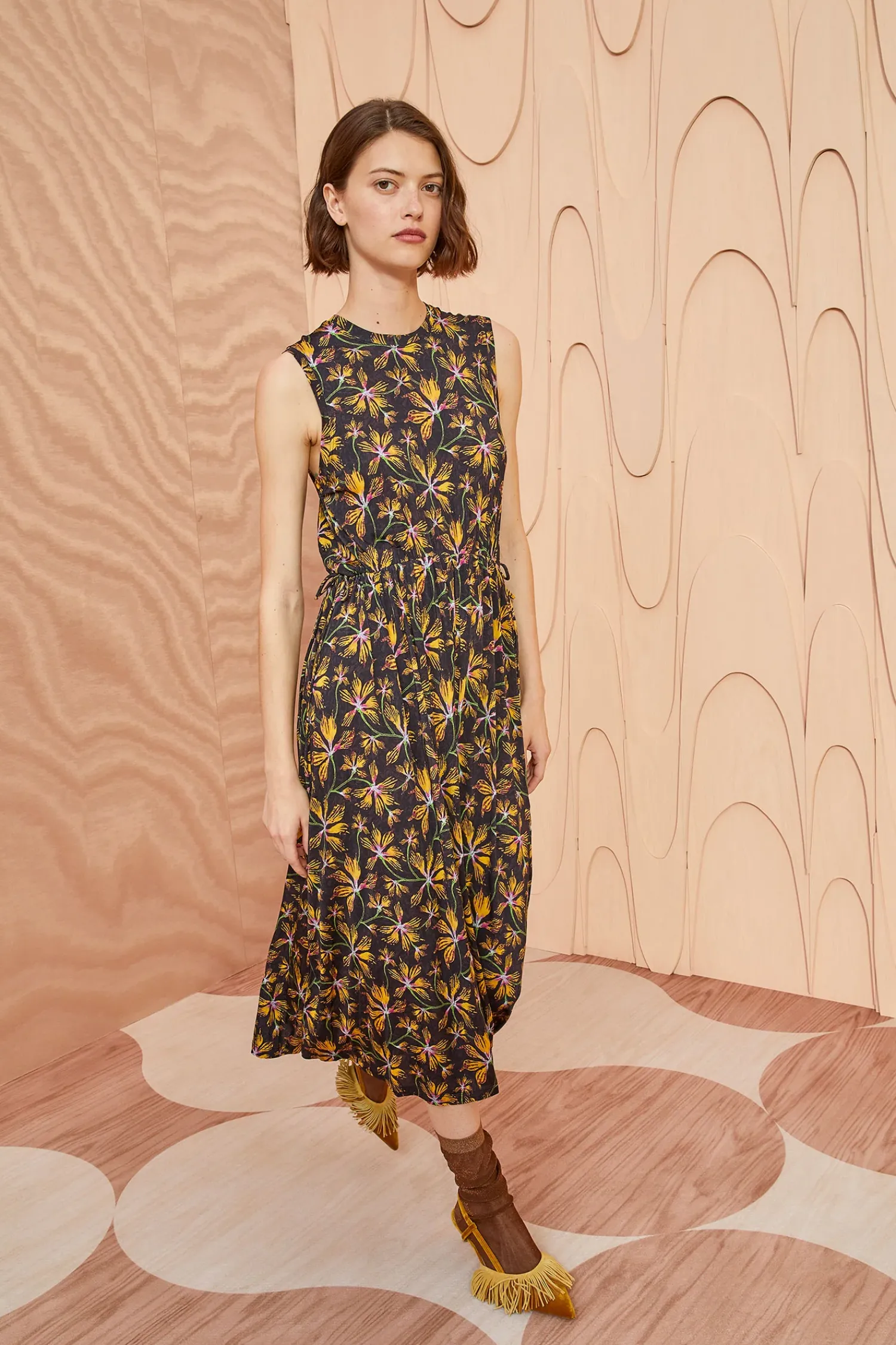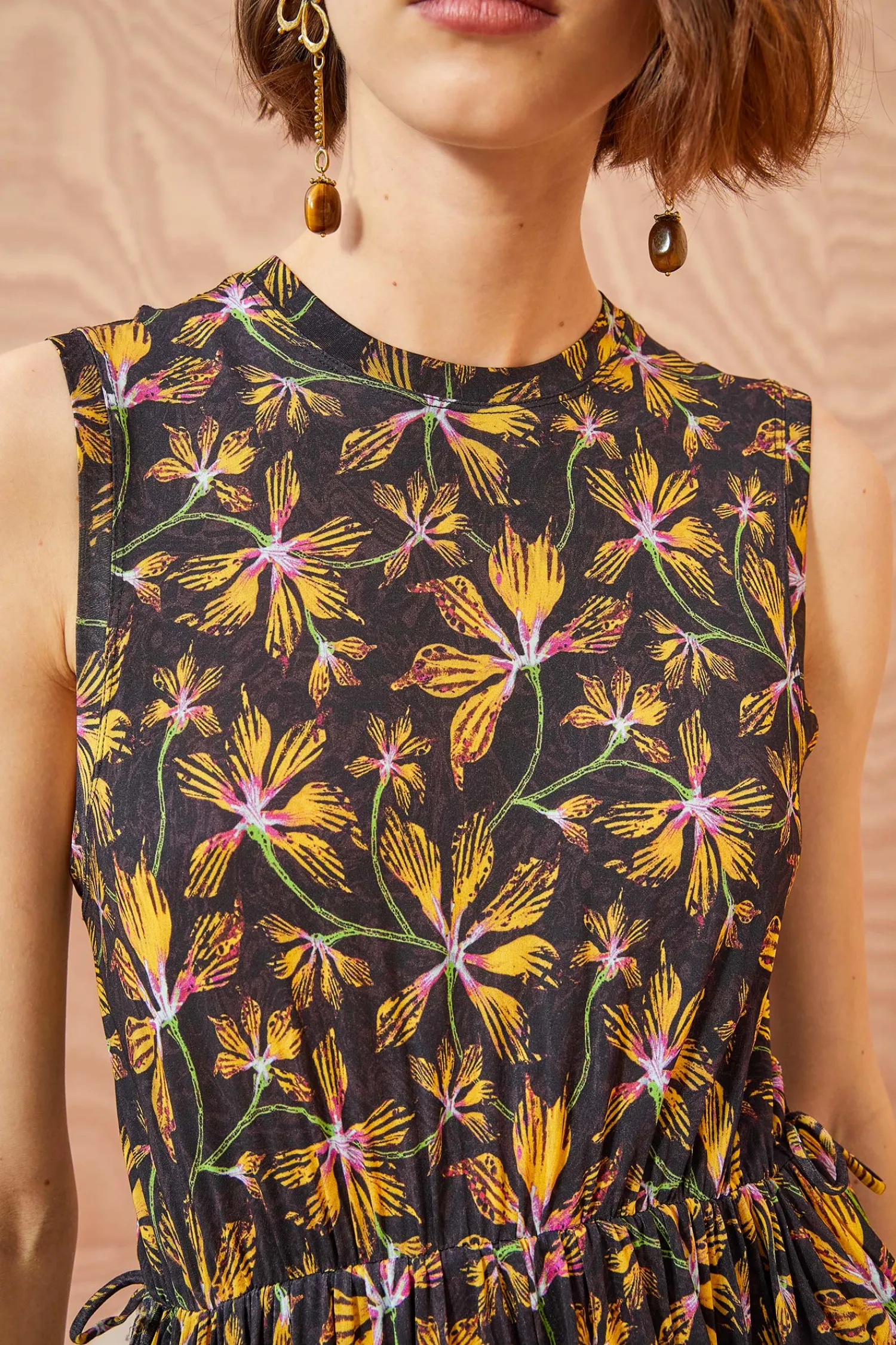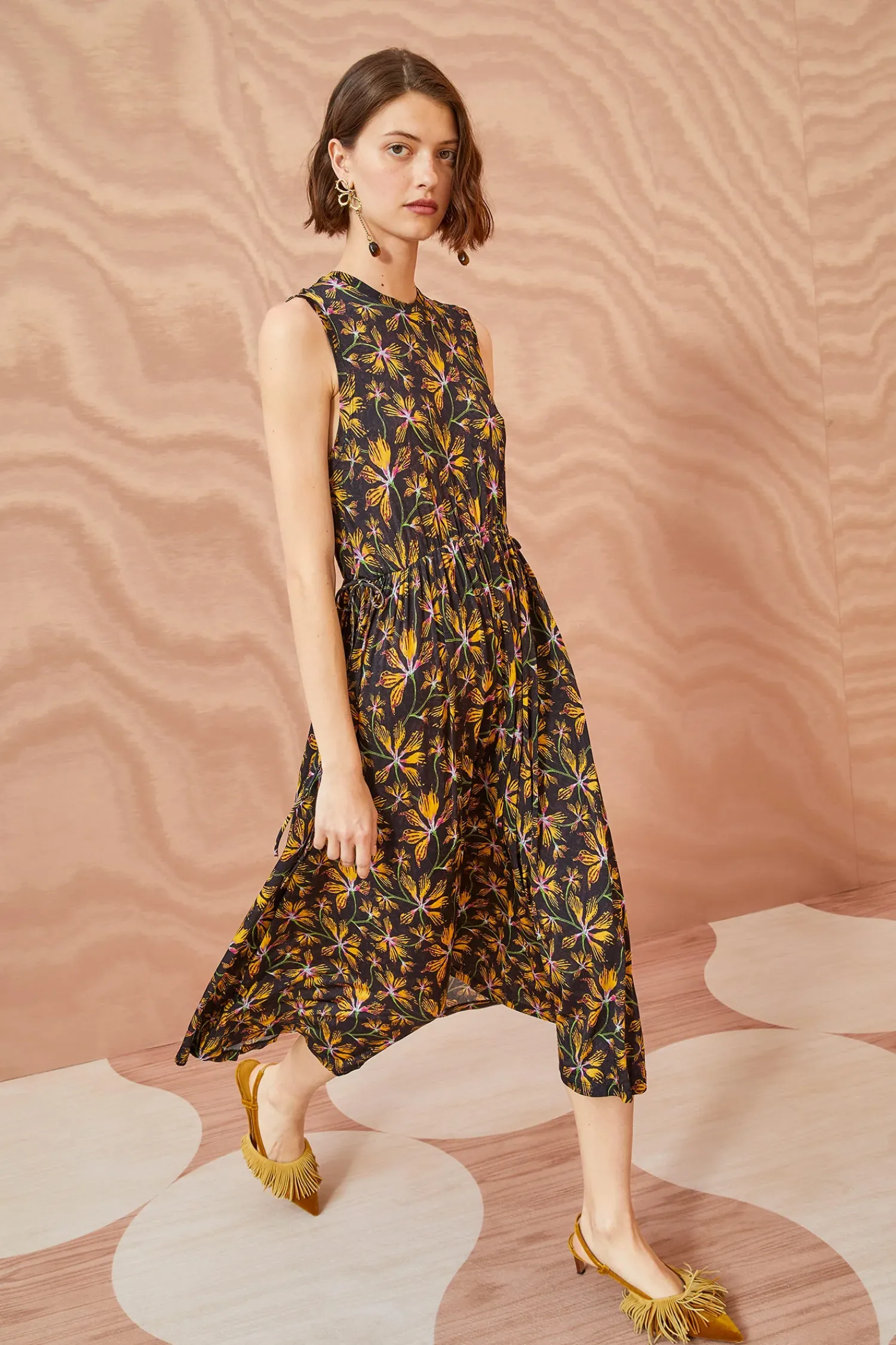 The Clea Dress Is Crafted From Our Lightweight Tricot Jersey And Adorned With Lively Yellow And Pink Blossoms Against A Black Backdrop. This Sleeveless Midi Dress Features A Crewneck And Falls To An Elegant Midi Silhouette With Delicate Adjustable Ties For Definition.