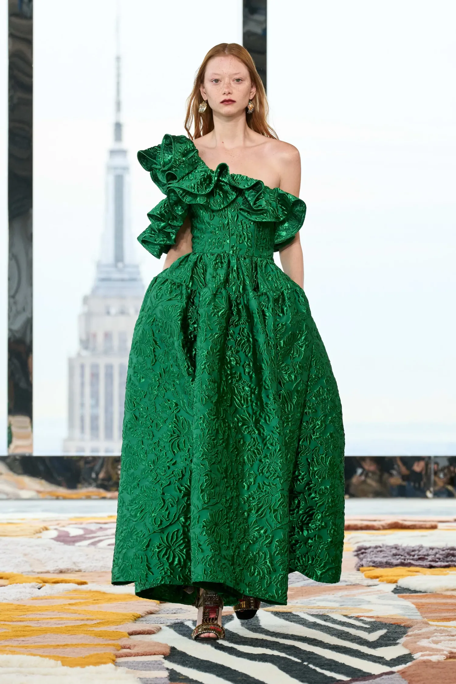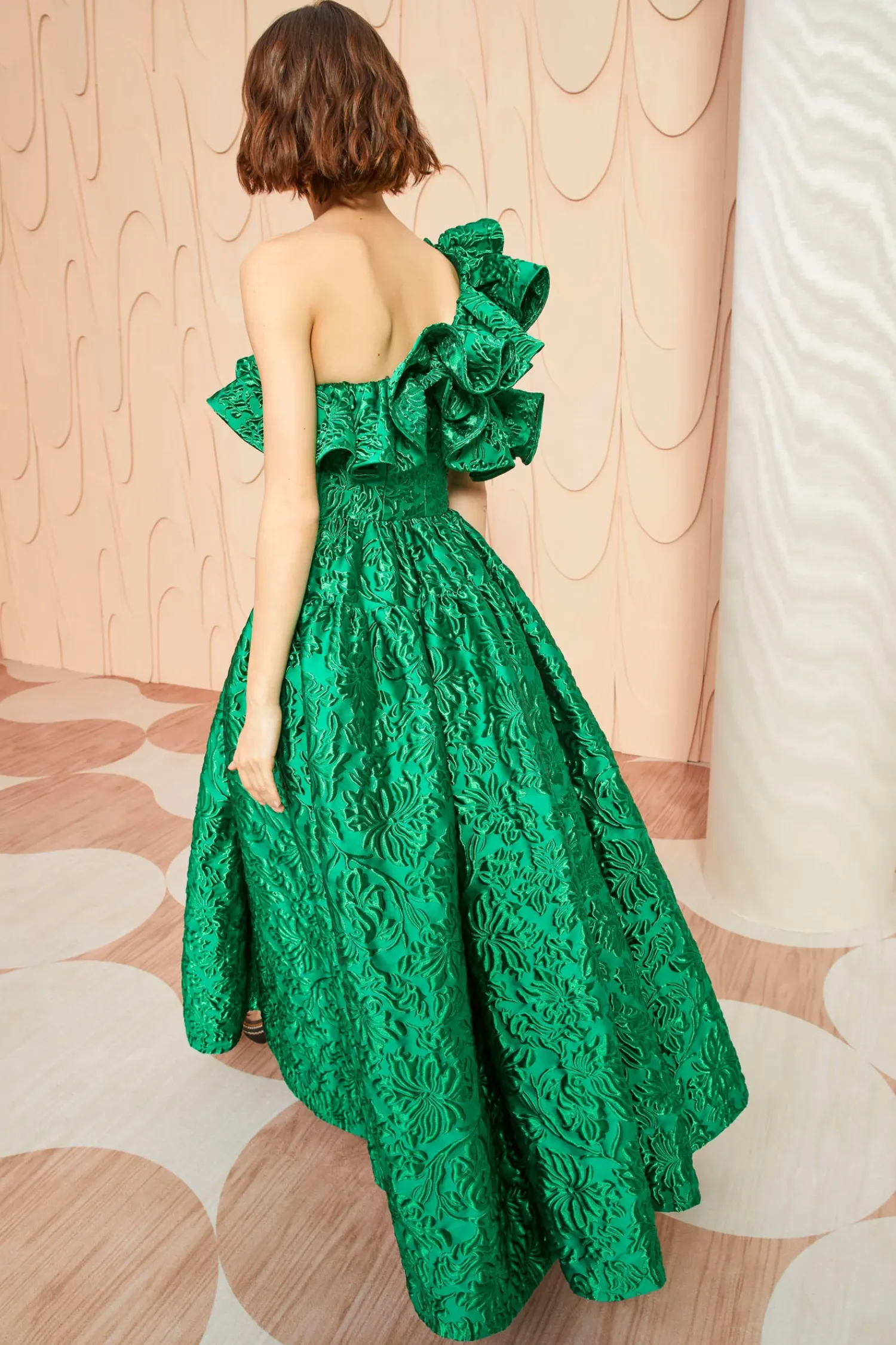 As Featured In Look 52 Of Our Autumn/Winter ’23 Runway Show, The Cosima Dress Is Made From Our Italian Lurex Cloque Jacquard Which Arrives In An Ethereal Yet Striking Monochrome Emerald Hue. This Impactful Ballgown Features Light Boning Within The Bodice, A Full Gathered Skirt, And Is Adorned With Architectural Ruffles Along The One-Shoulder Silhouette. It Is Finished With A Hidden Side-Seam Zipper.