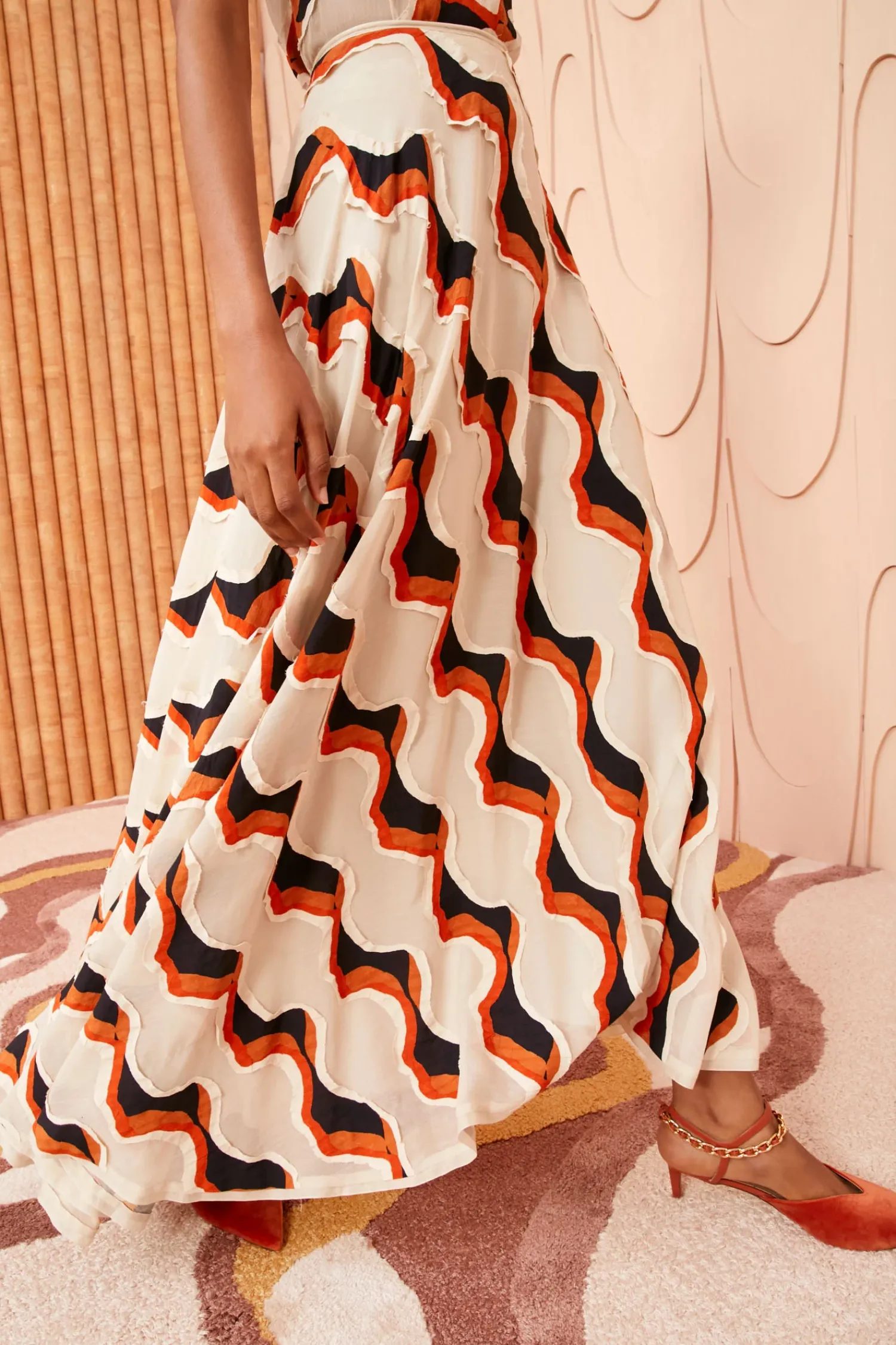 As Featured In Look 20 Of Our Pre-Spring ’24 Lookbook, The Dax Skirt Is Crafted From Our Italian-Made Waving Stripe Devore With Diagonal Graphics That Play Between Sheerness And Opacity. This White, Orange, And Black Maxi Skirt Floats To An Asymmetric Hem And Can Be Easily Paired With Our Leyla Blouse.