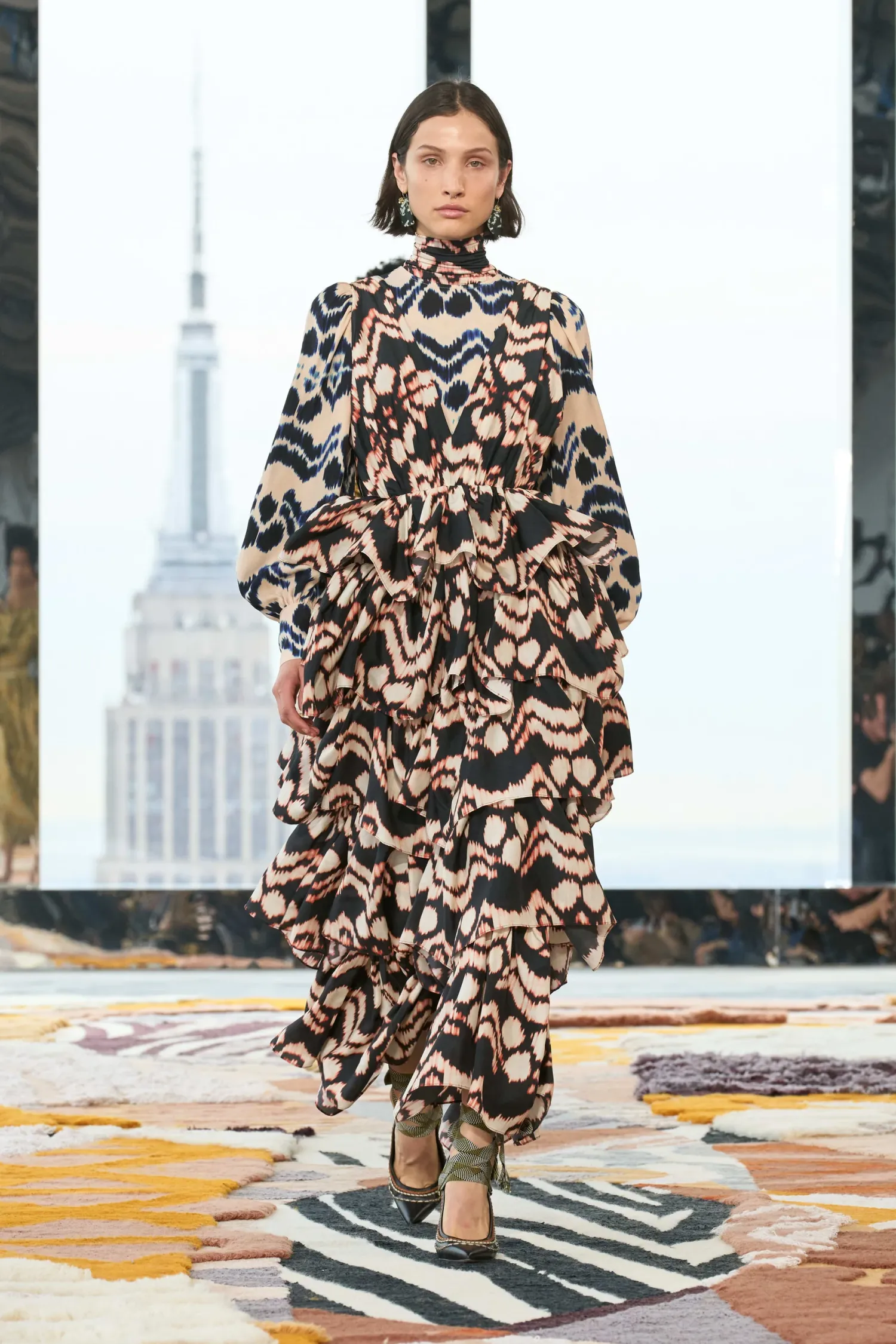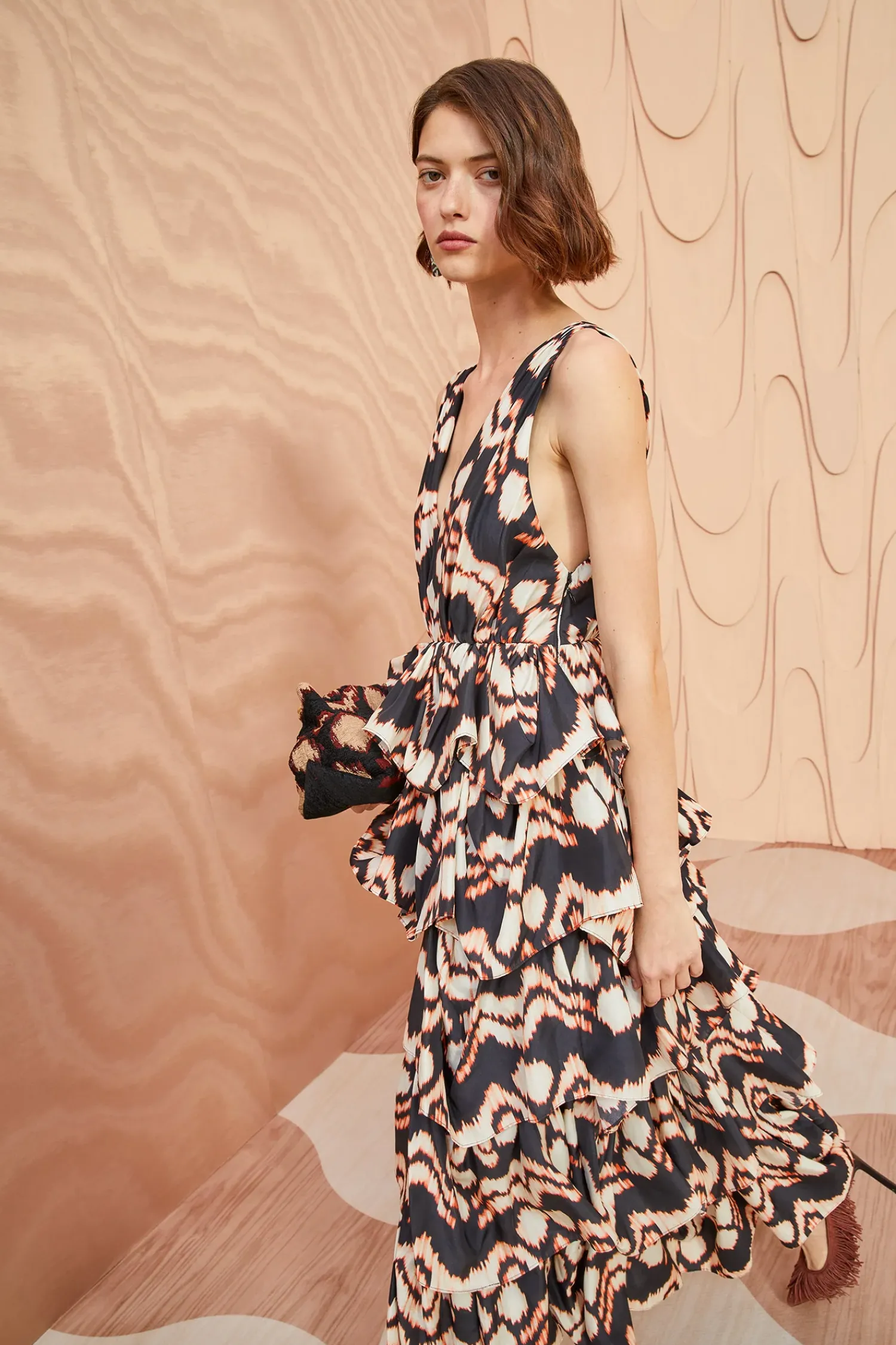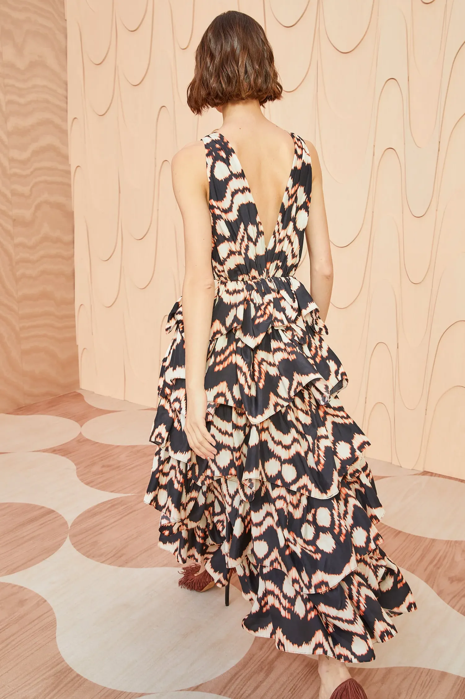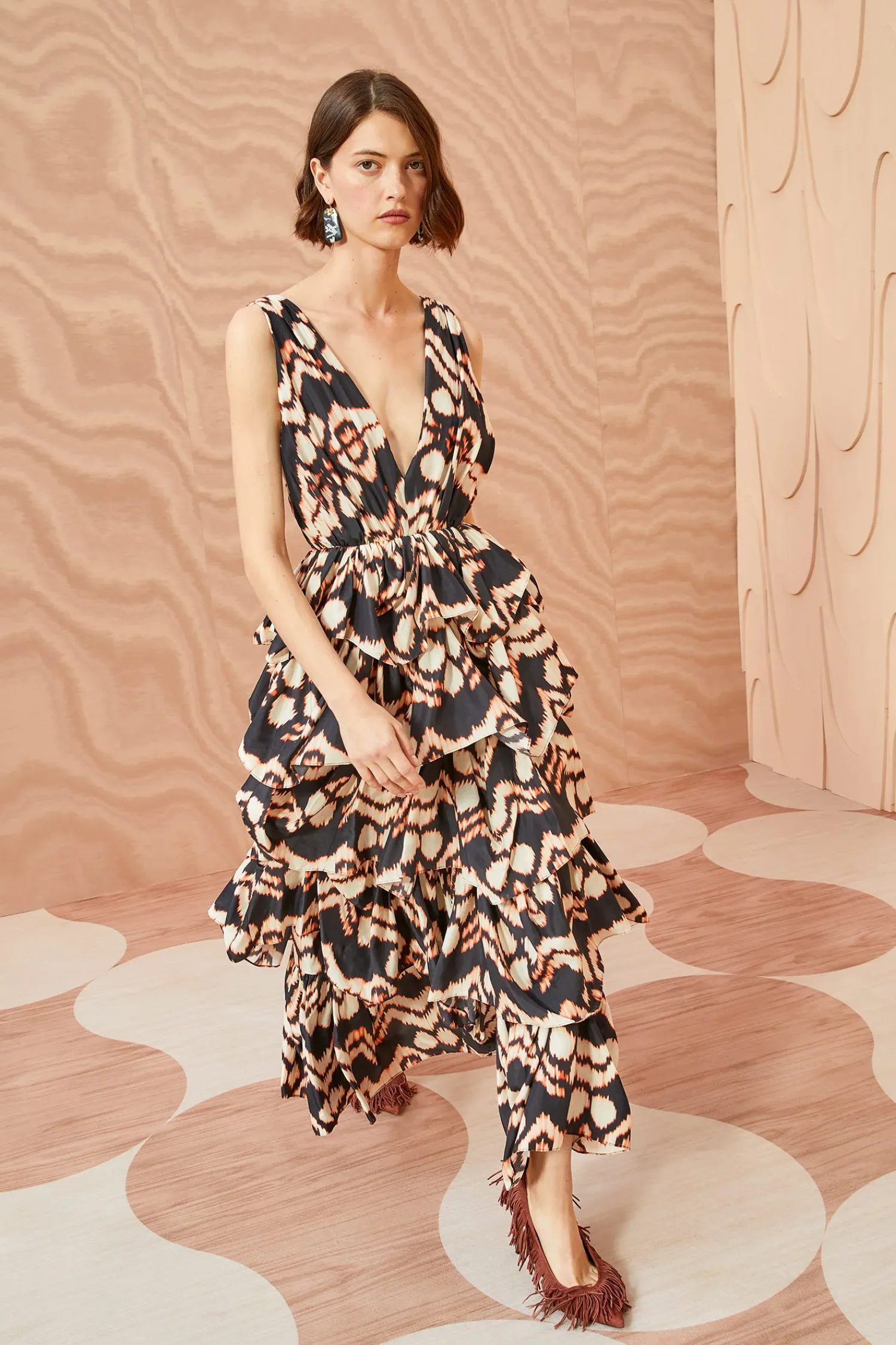 An Ulla Johnson Exclusive Only Available In Our Stores Or On Our Website, The Dephne Dress Is Made From Silk Taffeta Printed In A Graphic Ikat-Inspired Stripe. This Gorgeous Cream And Black Dress Features A Midi-Length Ruffle Skirt With Bubble-Edged Tiers Reminiscent Of Peony Petals. It Has A Deep V-Neckline And Side-Seam Zipper.