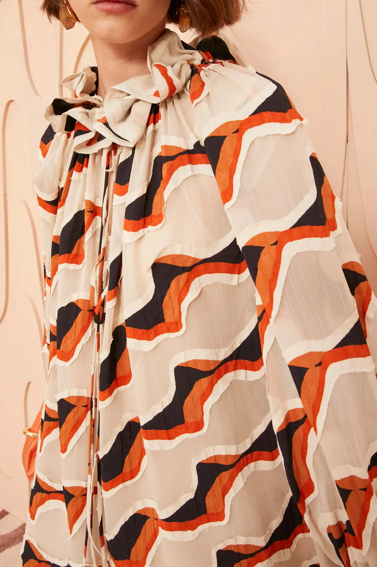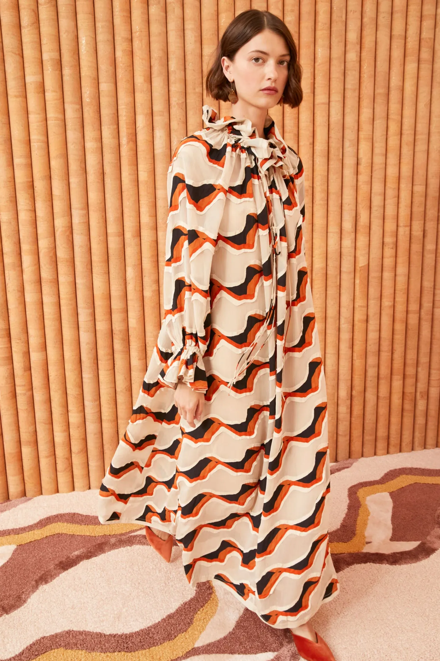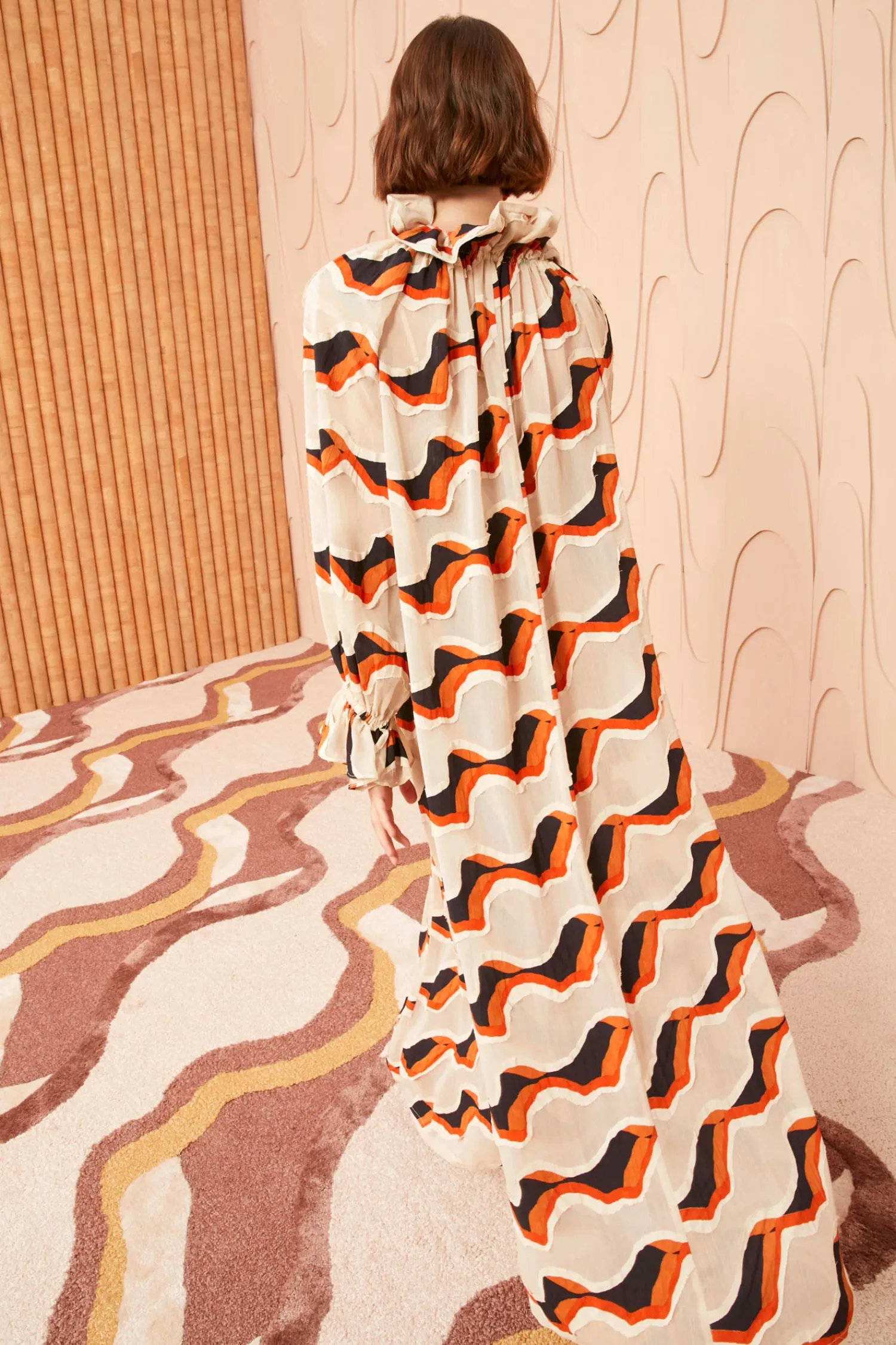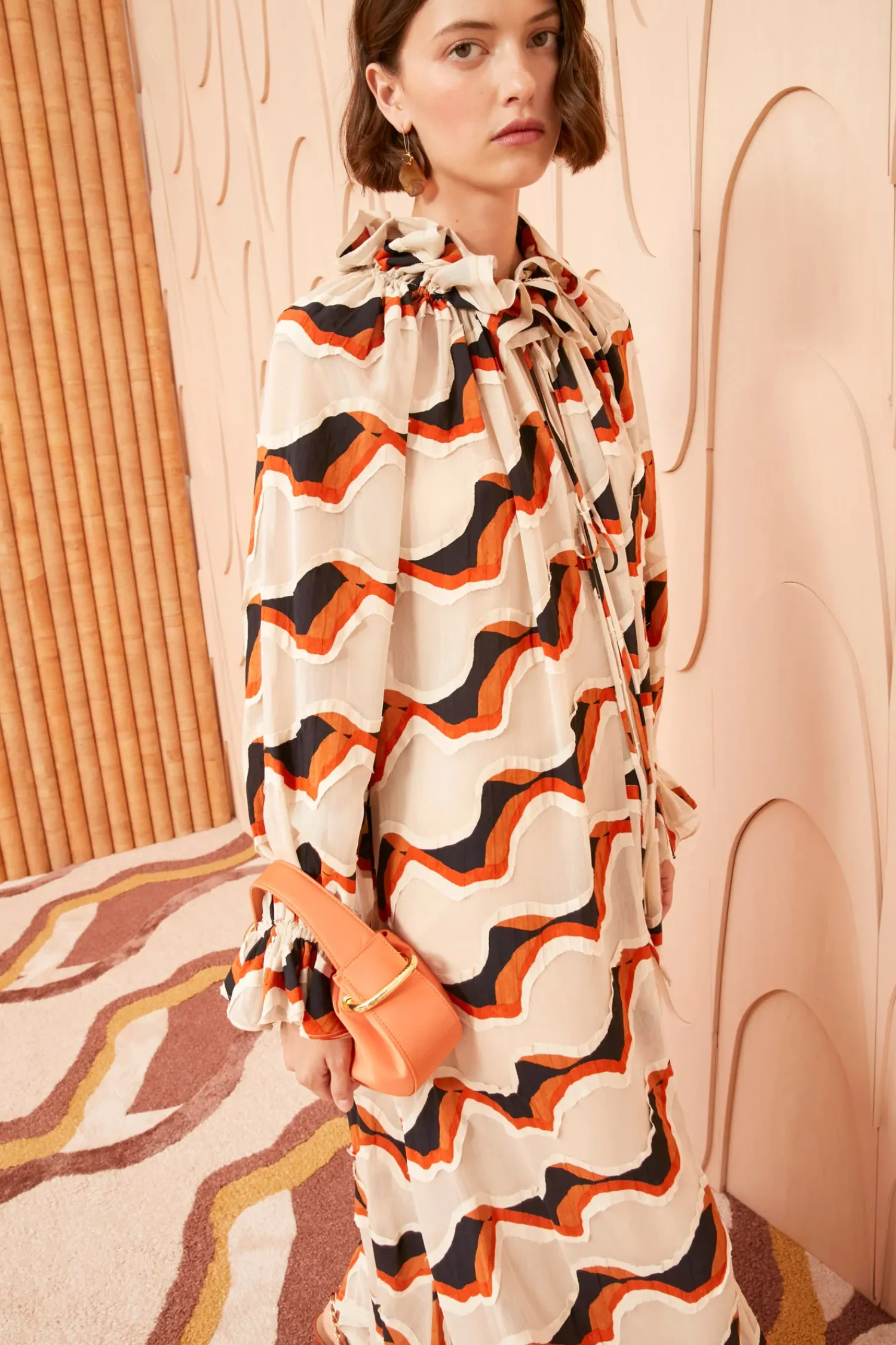 As Featured In Look 5 Of Our Pre-Spring ’24 Lookbook, The Echo Dress Is A White, Black, And Orange Beauty Crafted From Our Italian-Made Waving Stripe Devore With Graphics That Play Between Sheerness And Opacity. This Long-Sleeved Maxi Dress Is Adorned With Ruffles At The Neck And Cuffs And Comes With A Slip Lining.