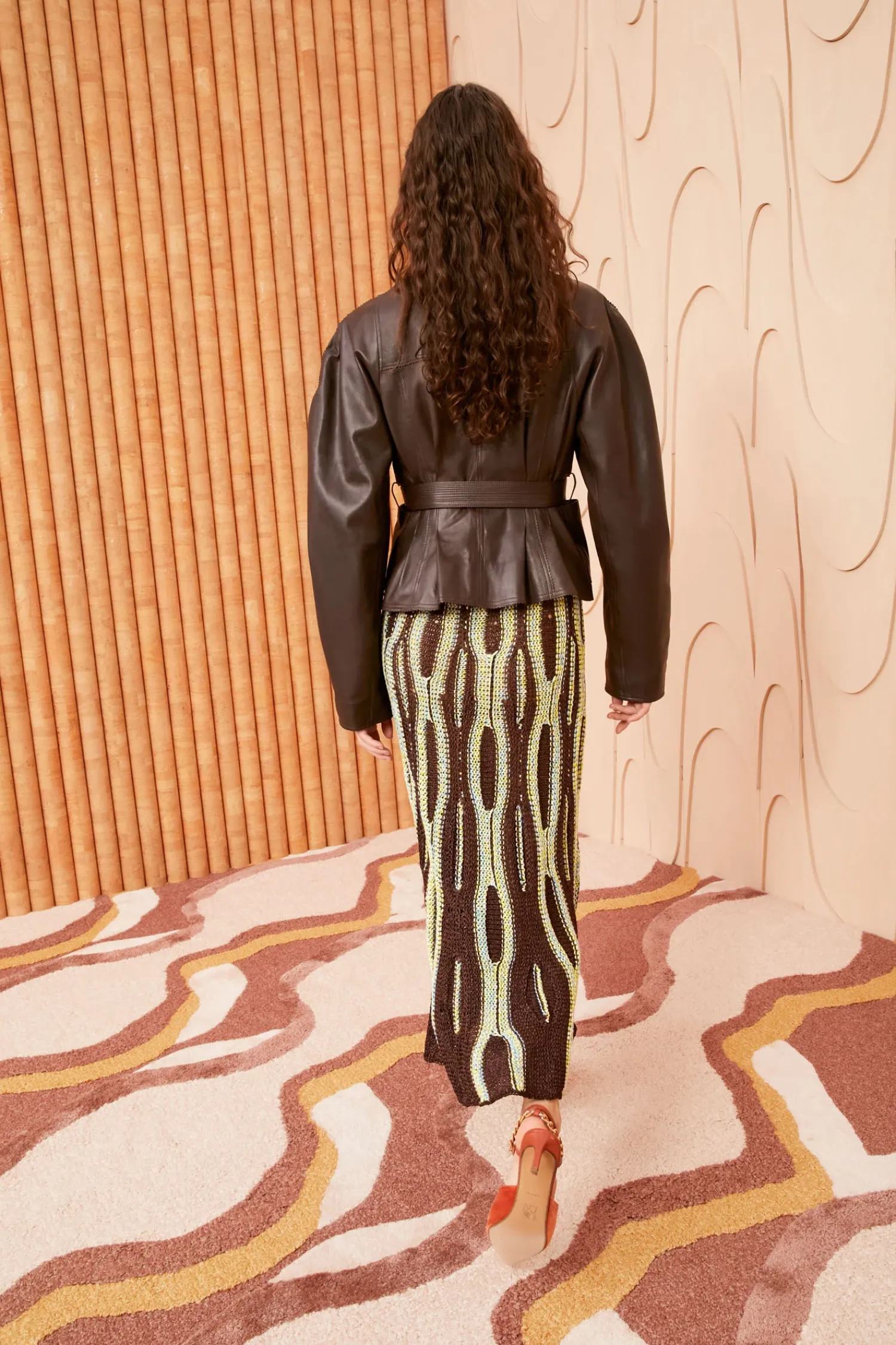 A Best-Loved Silhouette From Previous Seasons, Our Elara Skirt Is A Three-Dimensional Knit Created Using A Tuck Stitch Technique. This Brown, Green, And Blue Style Features A Ribbed Waistband And Unfurls To A Midi-Length Hem.
