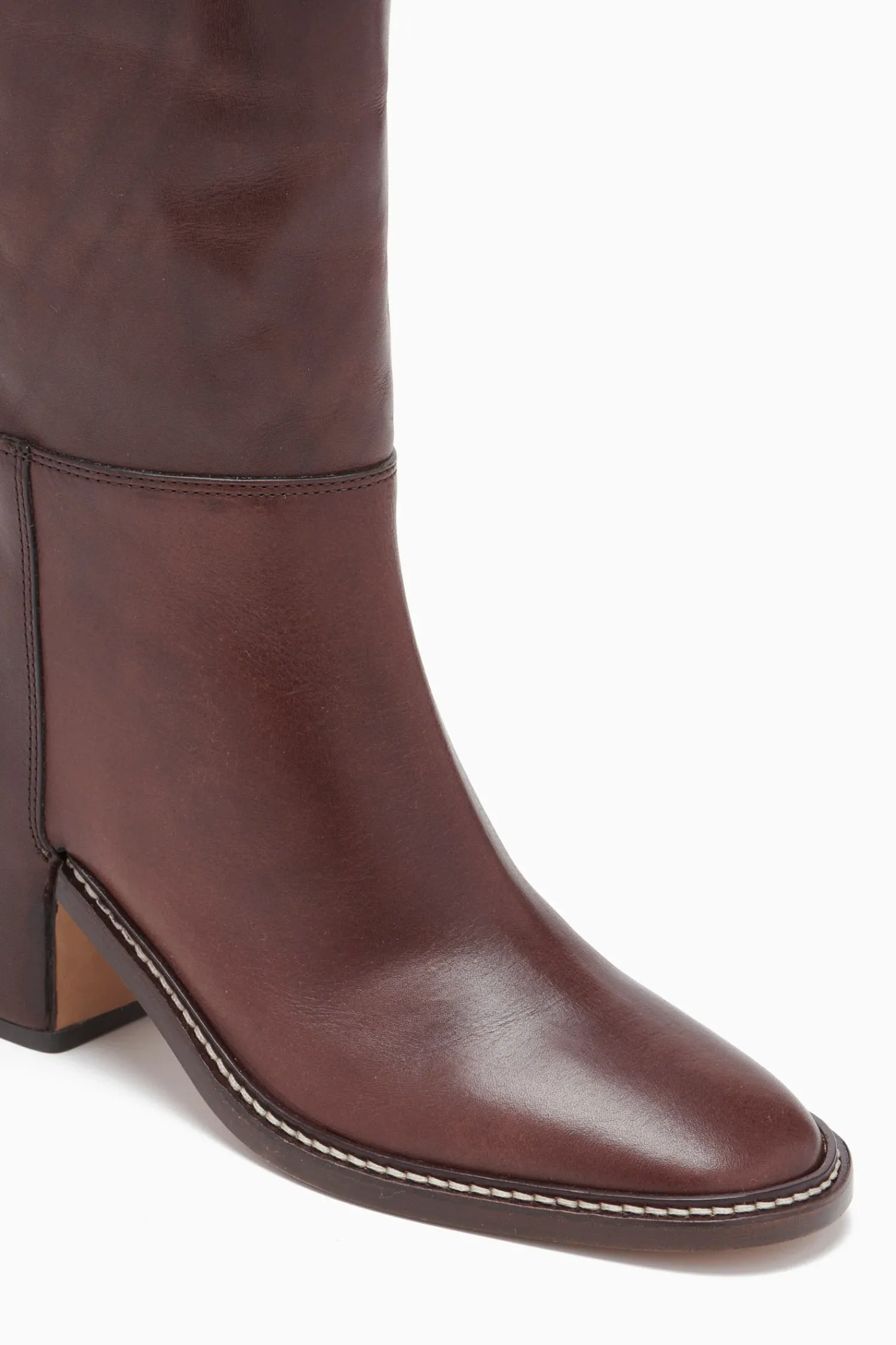 The Elena Riding Boot Is Crafted From Luxurious Calfskin Leather In A Rich Chocolate Brown. This Knee-Length Style Rests On A 65Mm Block Heel, Pulls On For Effortless Wear, And Can Be Easily Worn With A Beloved Dress, Skirt, Or Our Handmade Denim.