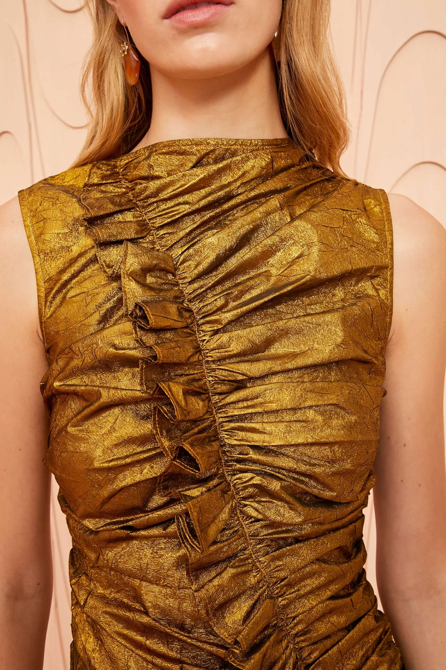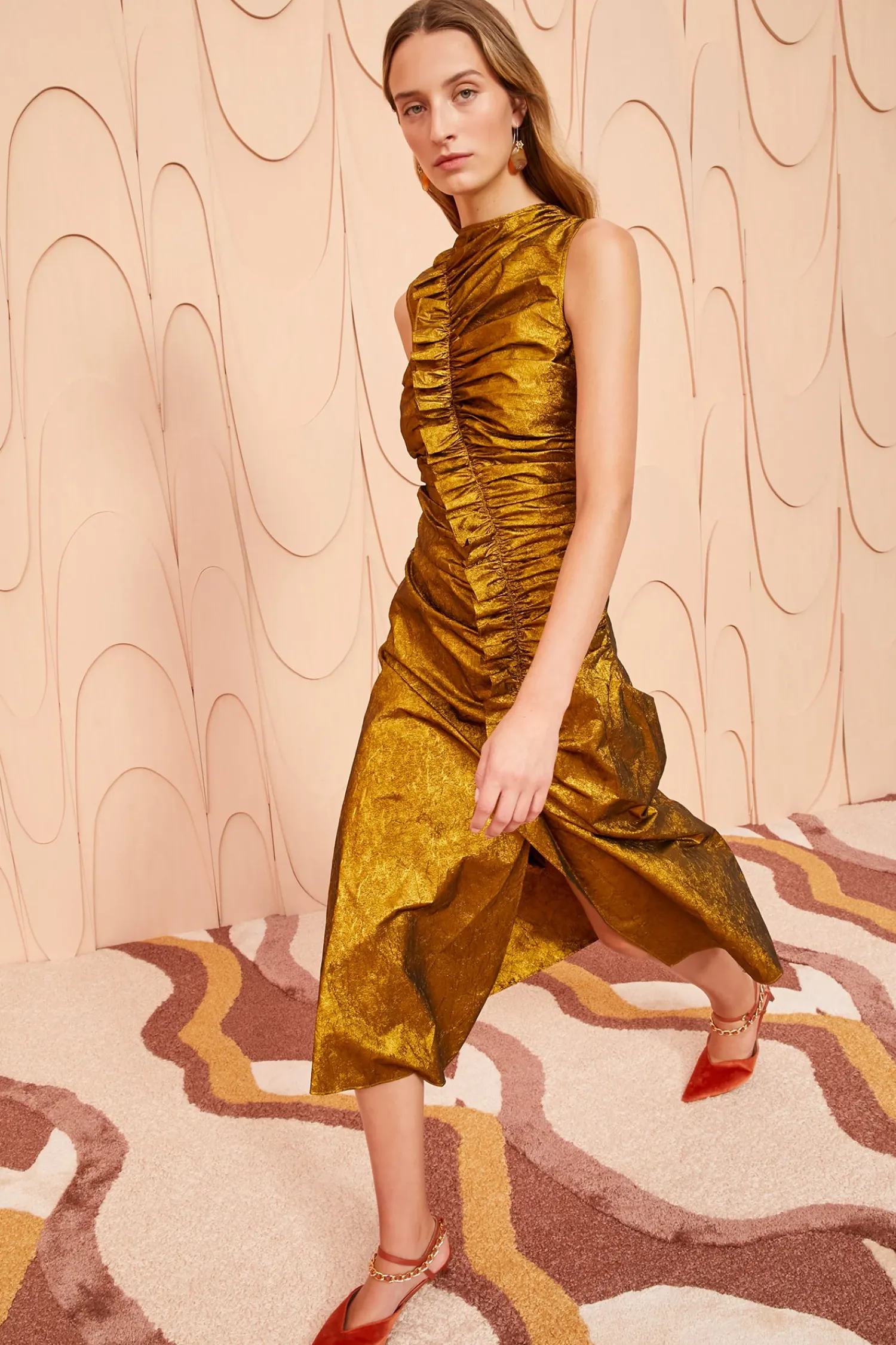 As Featured In Look 22 Of Our Pre-Spring ’24 Lookbook, The Fiorella Dress Is A Standout Beauty Crafted From Our Italian Metallic Taffeta That Has A Crushed, Papery Texture. This Garment Is Designed With A Resilient Stretch That Complements Its Sculptural Finish. This Sleeveless Midi Dress Features Asymmetric Ruching Along The Bodice And A Front Slit.