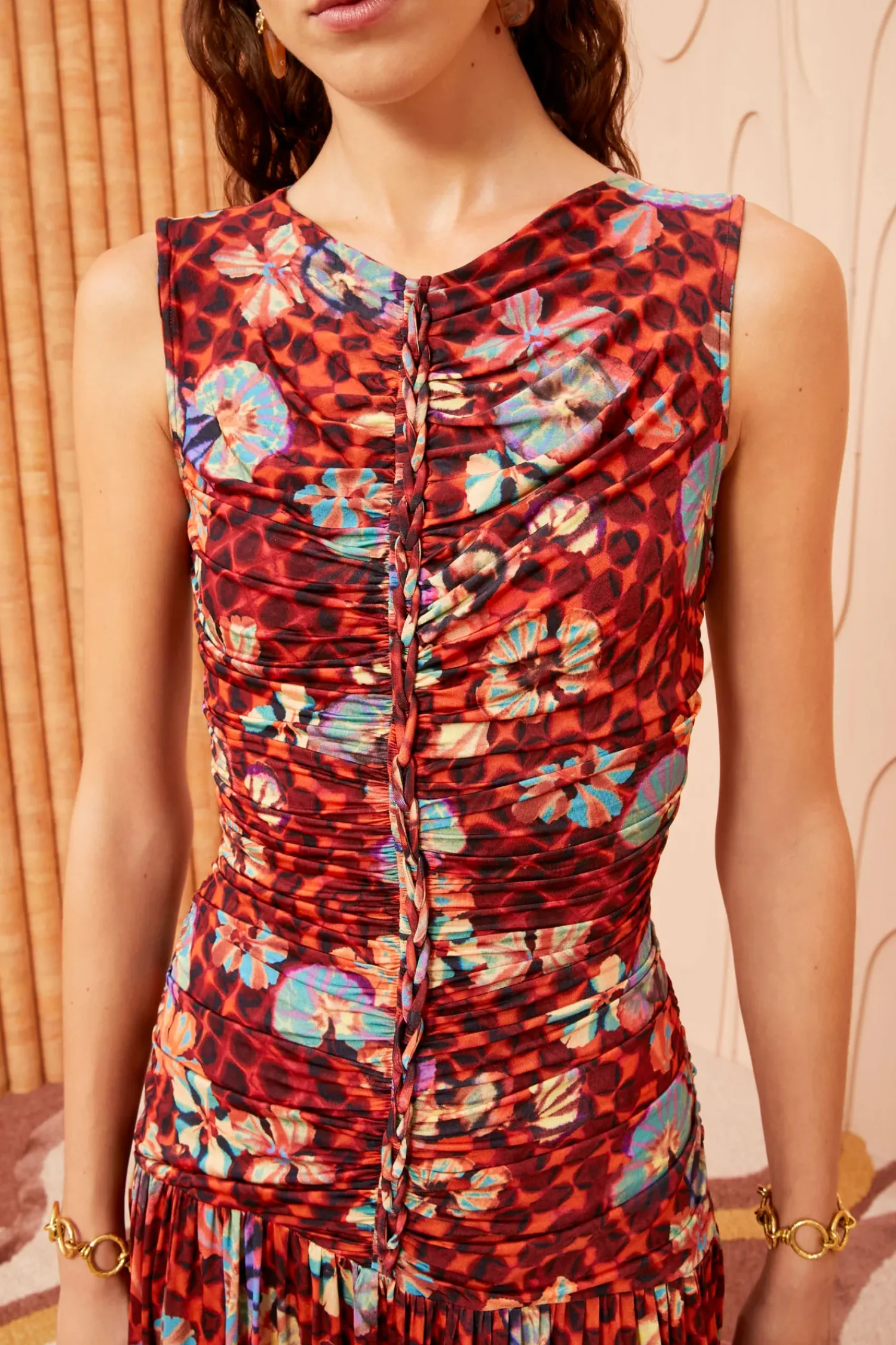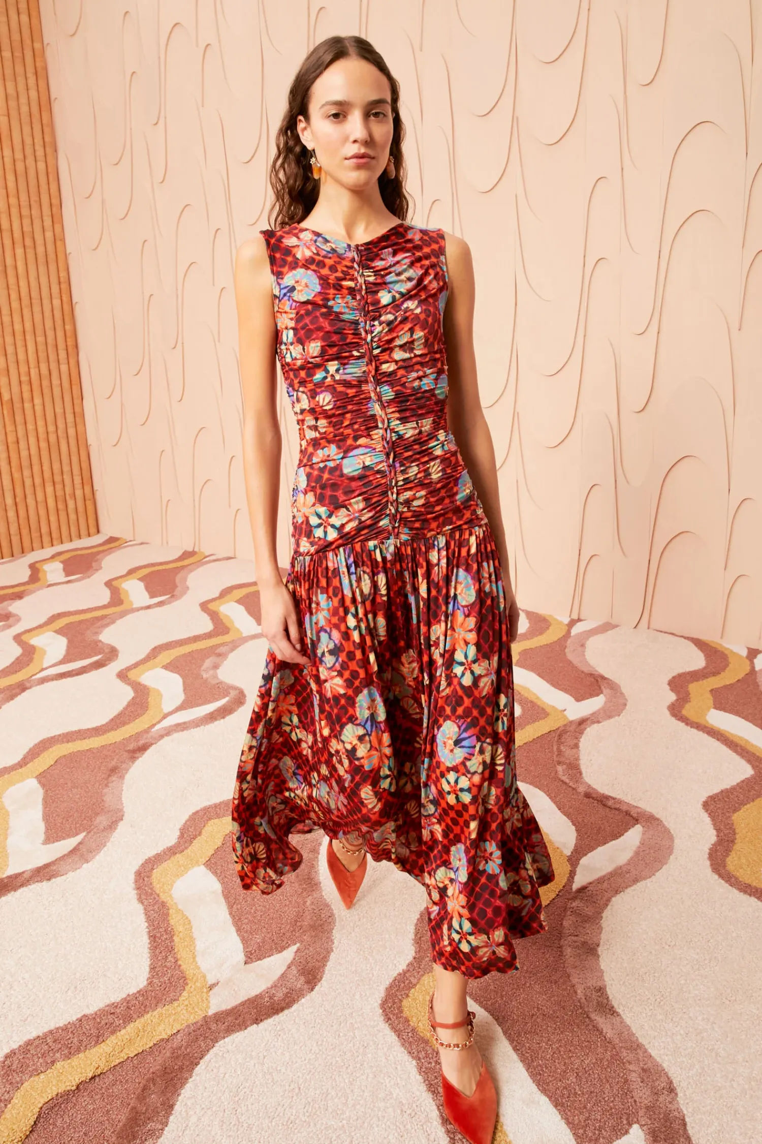 The Flora Dress Is A Ruched Beauty Made From Our Beloved Tricot Jersey With Prismatic Blooms Against A Red Grid Pattern. Defined By A Lovely Braided Trim, This Sleeveless Dress Has A High Round Neckline With A Sculpted Bodice That Falls To A Long Midi Hem With A Gentle Flare. It Fastens With A Center-Back Zipper.