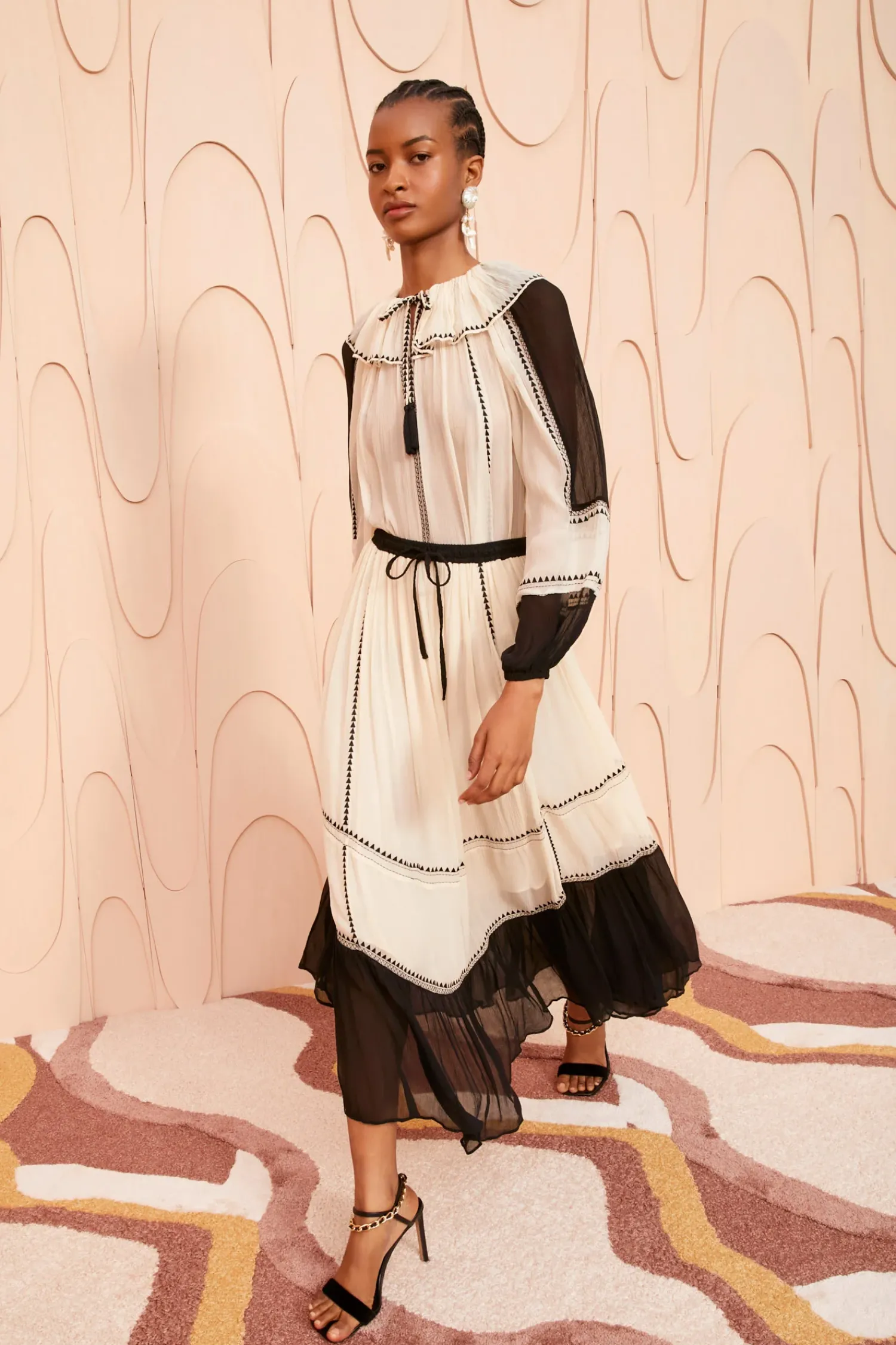 As Featured In Look 27 Of Our Pre-Spring ‘24 Lookbook, The Freida Skirt Is Made From Our Luxurious Crinkle Silk Chiffon In A Color-Blocked White And Black Palette. This Midi-Length Skirt Features Lovely Ornate Embroidery And Falls To A Circular Hemline For Light, Ethereal Movement. It Is Finished With Ties At The Waist.