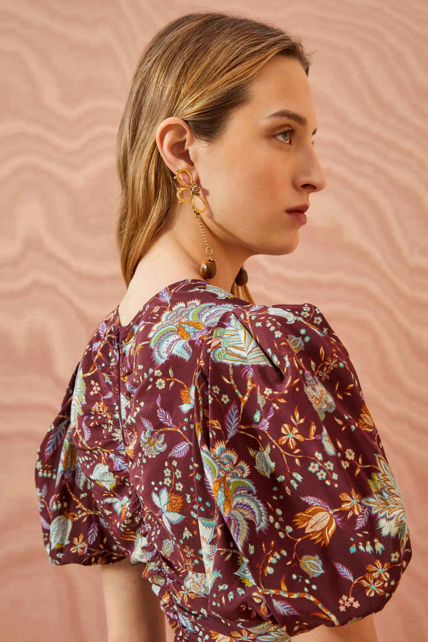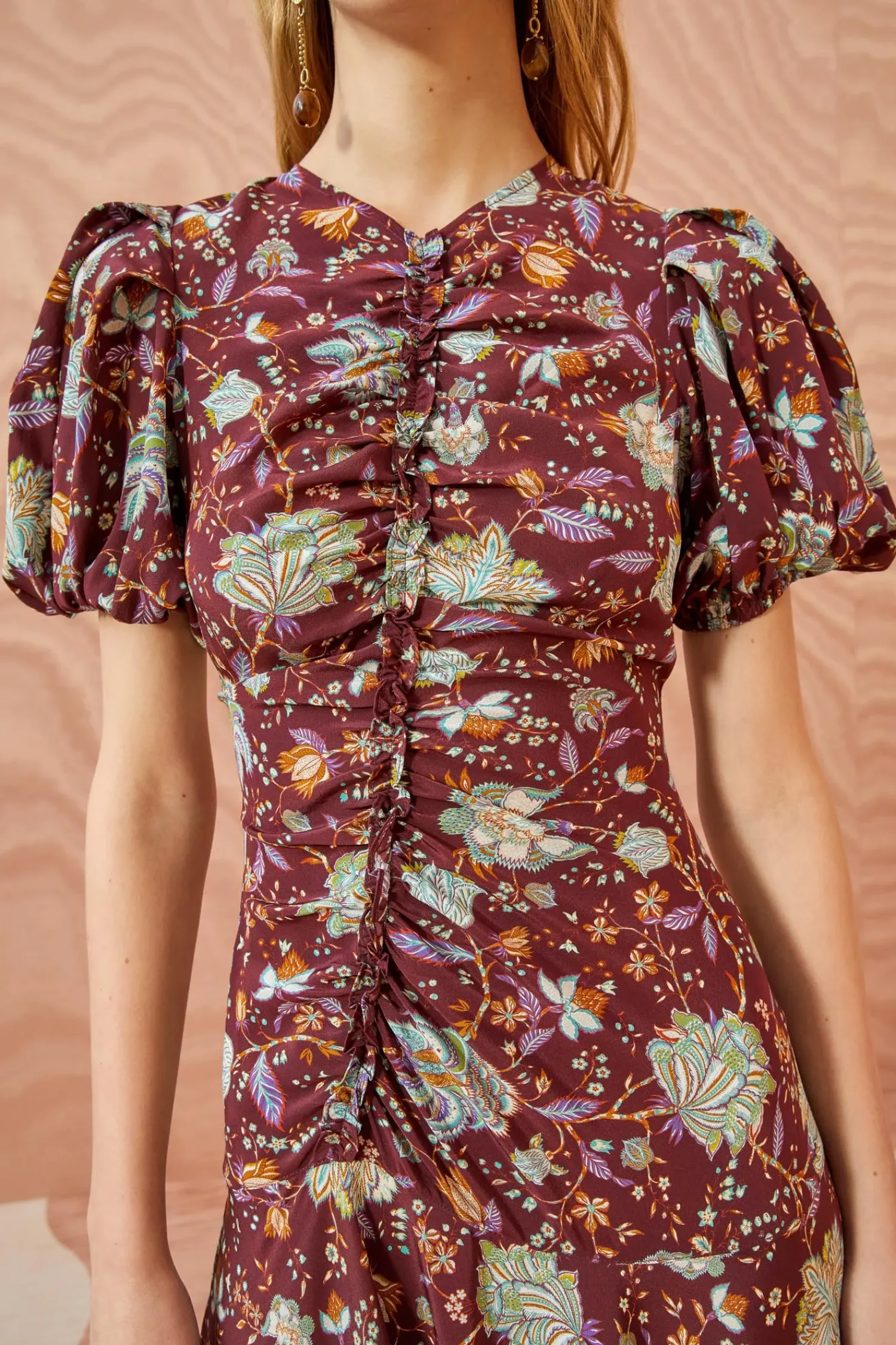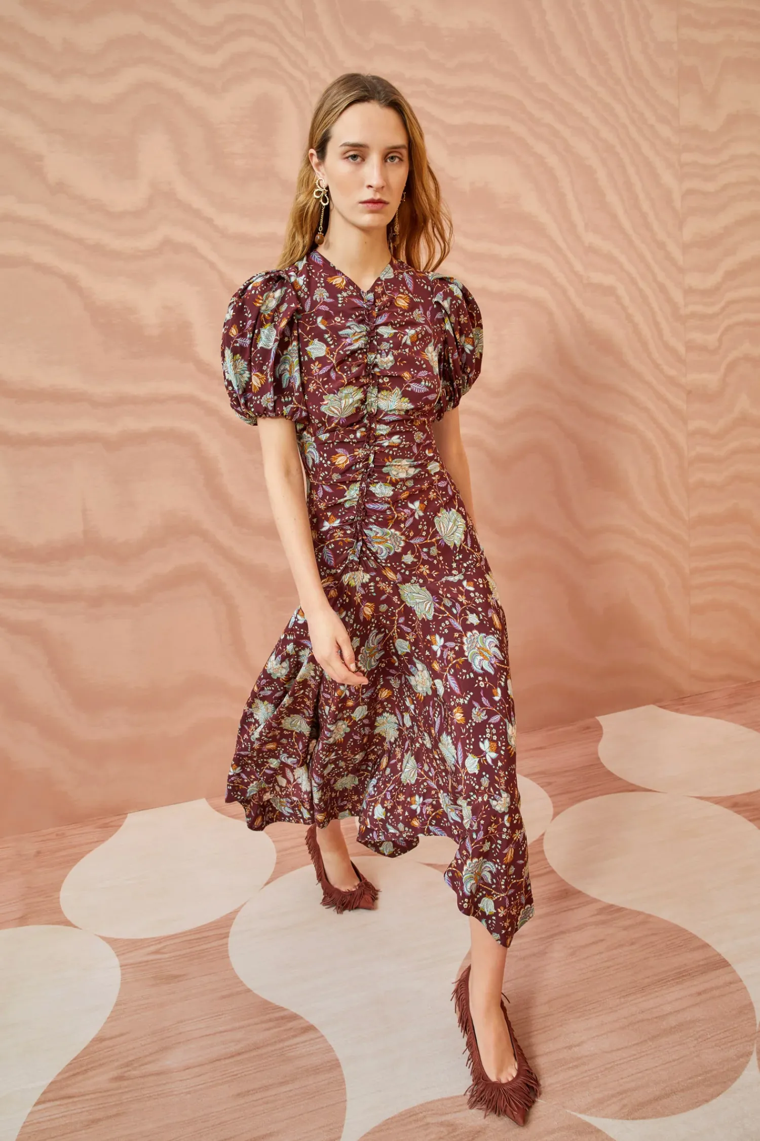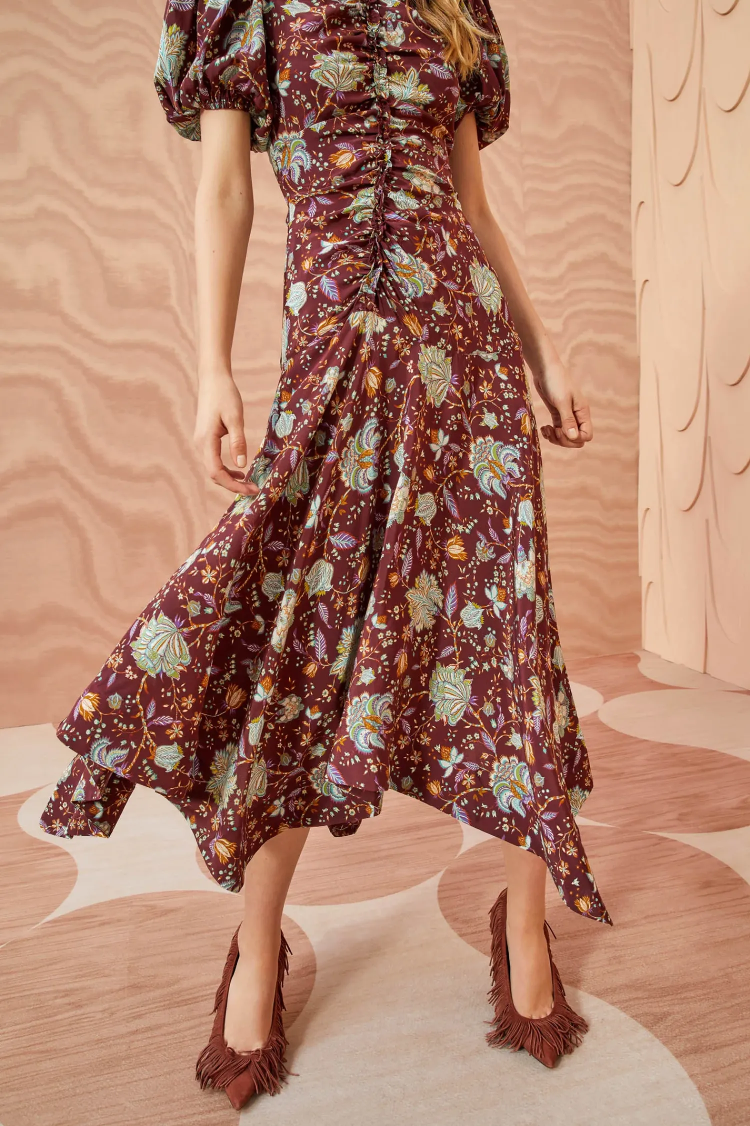 A Much-Loved Bestseller, The Heleen Dress Is Crafted From Dark Red Silk Crepe De Chine That’S Adorned With Our Orange Blossom Motif–The Florals Are Inspired By Vintage French Botanicals That Were Collaged And Then Redrawn To Create Intricate Trailing Vines. This Body-Skimming Midi Dress Has Short Puff Sleeves And A Delicate Ruffle Trim That Trails Asymmetrically Across The Front. It Is Finished With A Handkerchief Hem For Beautiful Movement And A Hidden Center-Back Zipper.