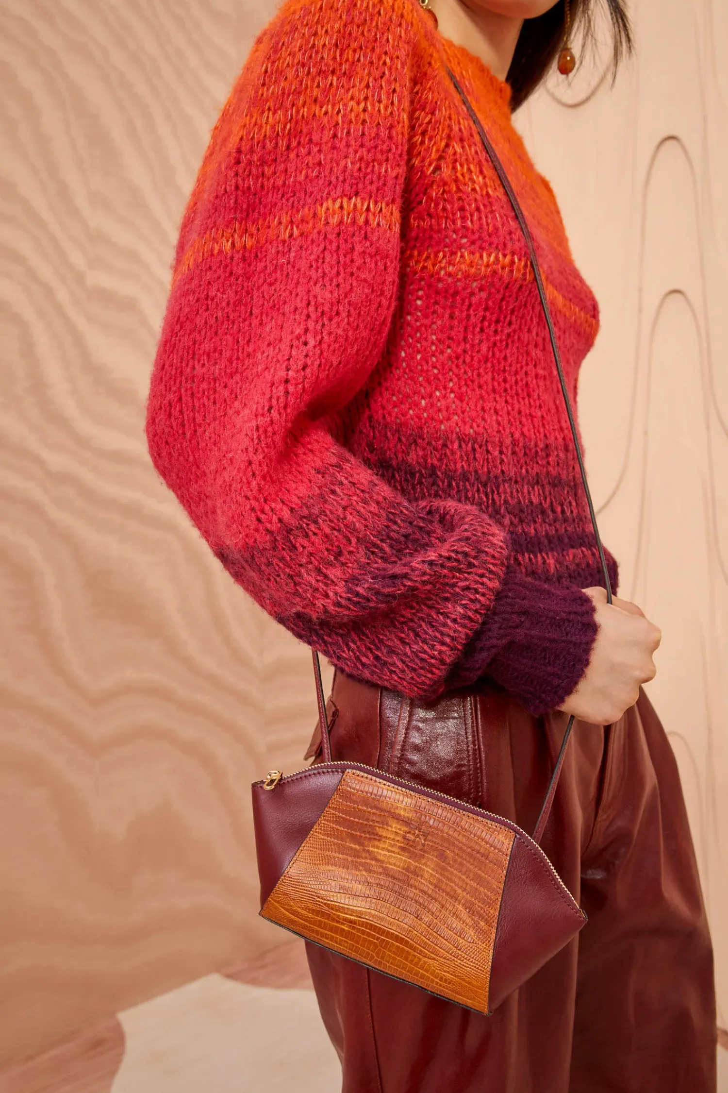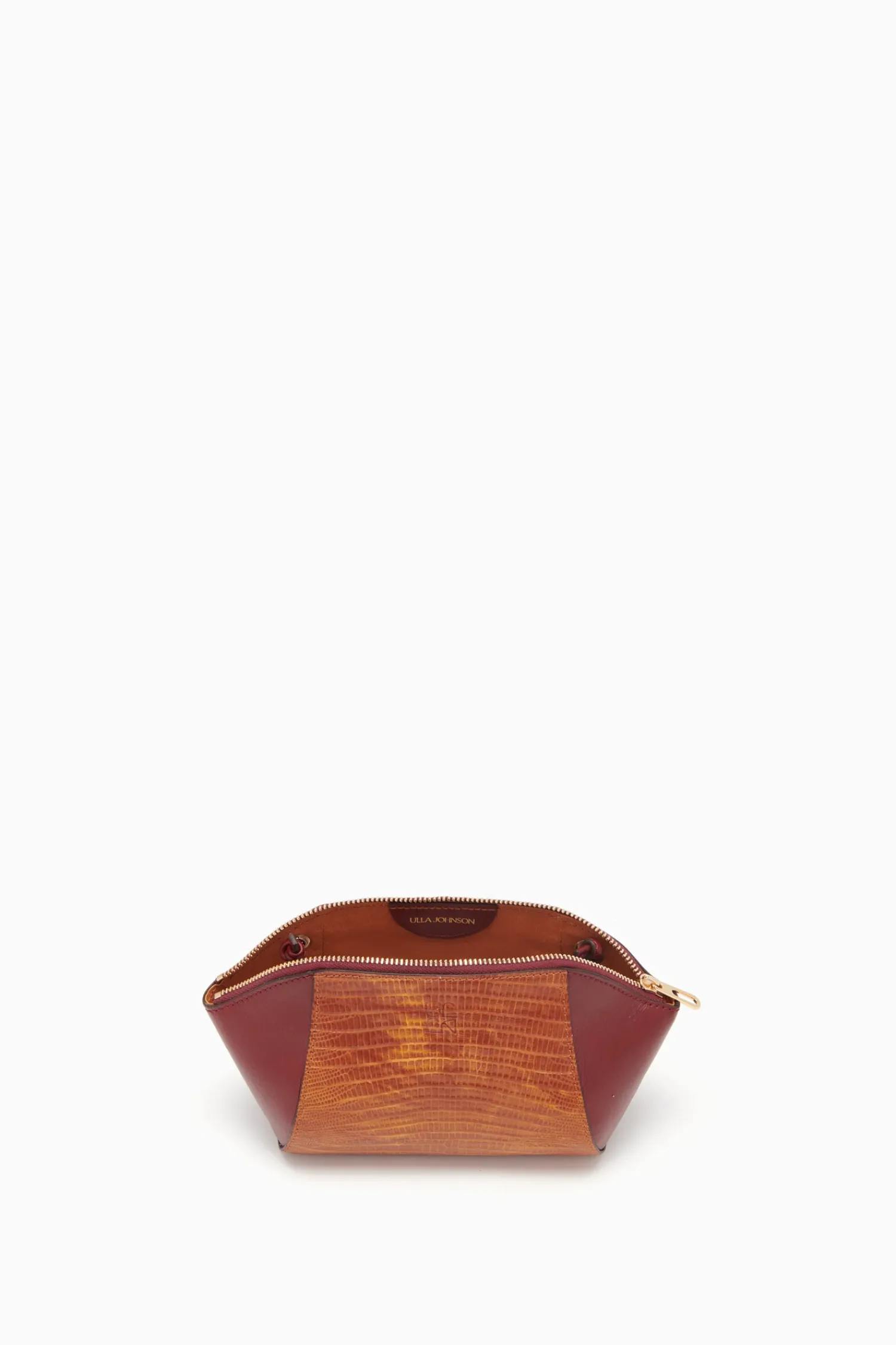 The Imogen Large Makeup Pouch Is Crafted From Sumptuous Lizard-Embossed And Smooth Leather. This Elegant Brown And Red Silhouette Features A Removable And Adjustable Strap That Attaches At The Back. It Is Finished With A Gleaming Brass Zipper Closure.