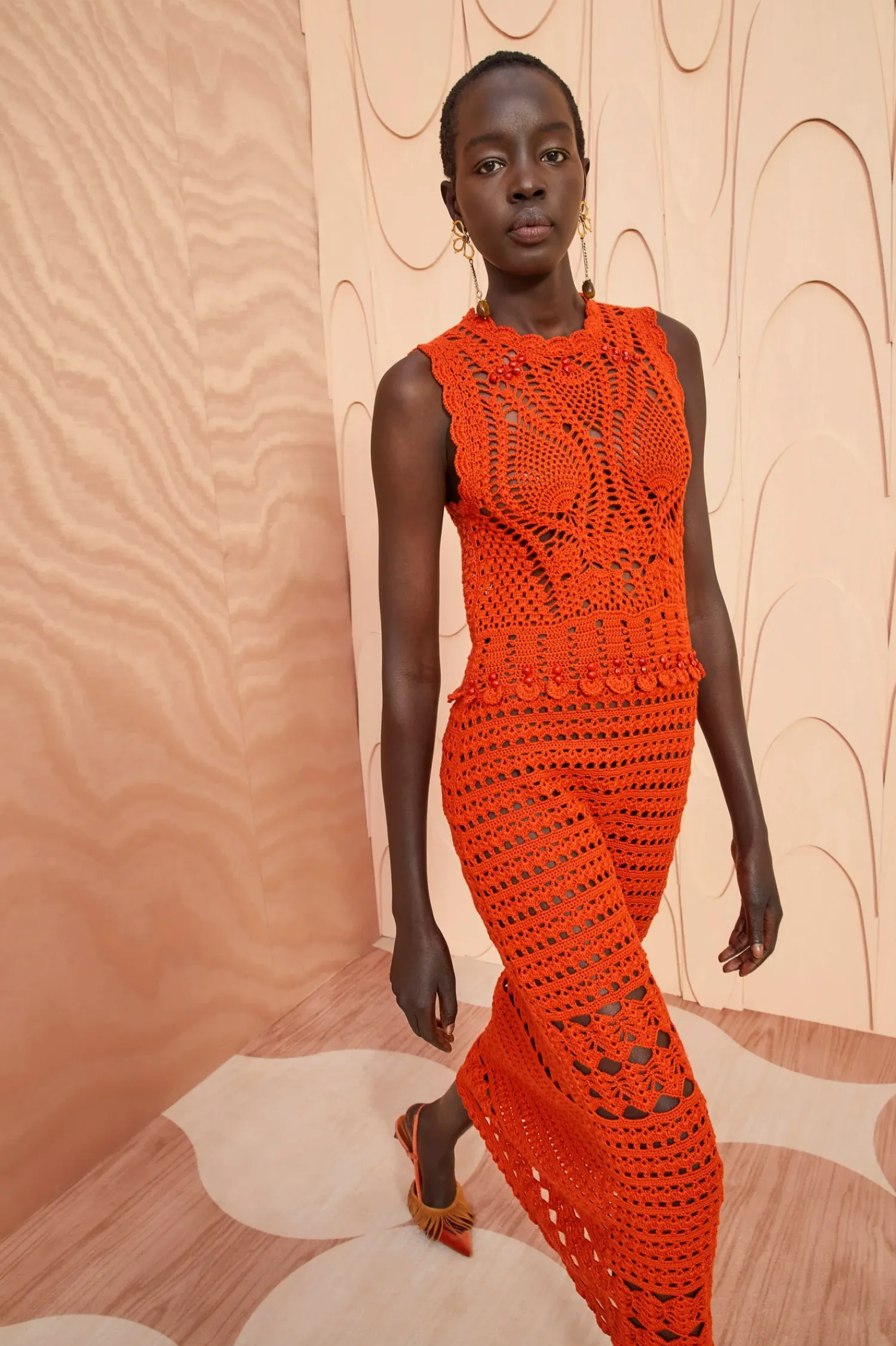 As Featured In Look 10 Of Our Autumn/Winter ’23 Lookbook, The Innika Dress Is Made From Italian-Spun Merino Wool That Is Hand-Crocheted Into Lattice-Like Stitches, Alternating Patterns Along Its Length. This Sleeveless Column Dress Is A Gorgeous Earthy Orange And Is Adorned With Small Wooden Beads.