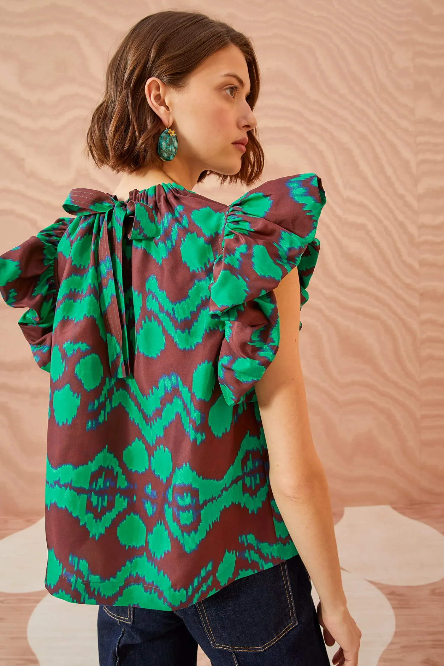 A Standout Print From Our Autumn/Winter ’23 Collection, The Iren Top Is Saturated In Our Painted Ikat Motif With Emerald Green Graphics Against A Dark Red Backdrop. It Is Framed By Voluminous Flutter Sleeves, Has A Loose Silhouette, And A Tie-Fastening Keyhole At The Back. Wear Yours With One Of Our Handmade Denim Styles.