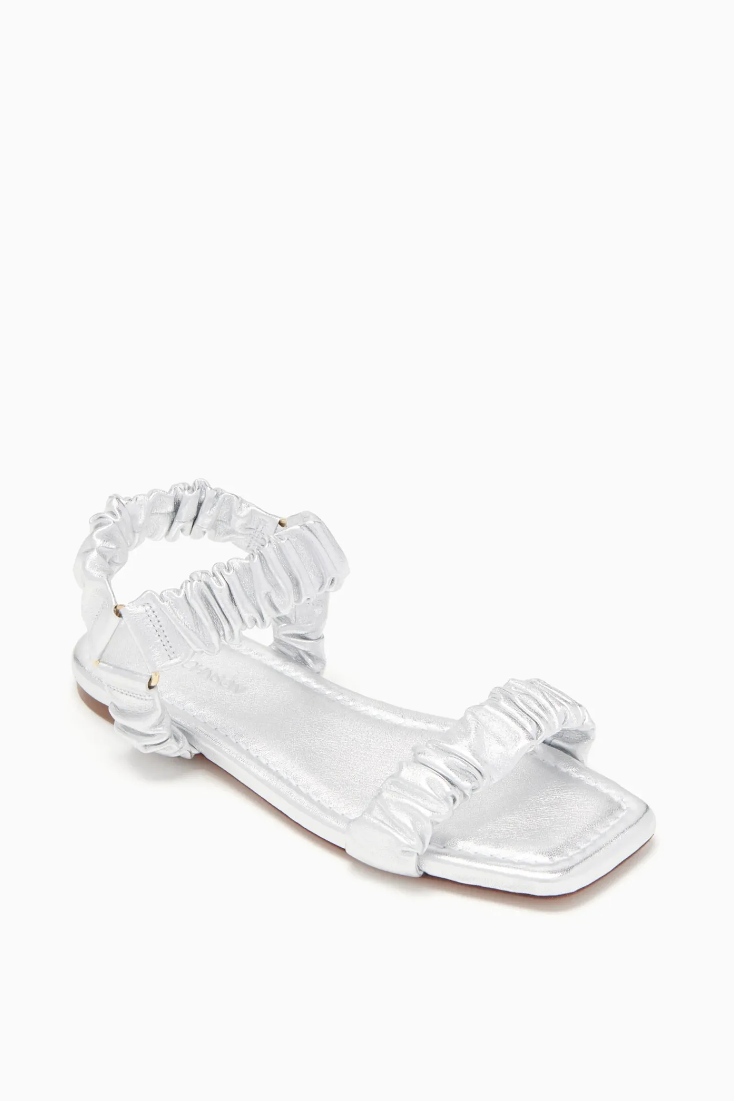 An Everyday Classic, The Isabella Ruched Flat Sandal Is Crafted From Supple Leather That’S Elegantly Ruched Throughout. It Is A Beautiful Silver Hue, Has An Open Square Toe, And Easily Slips On And Off.
