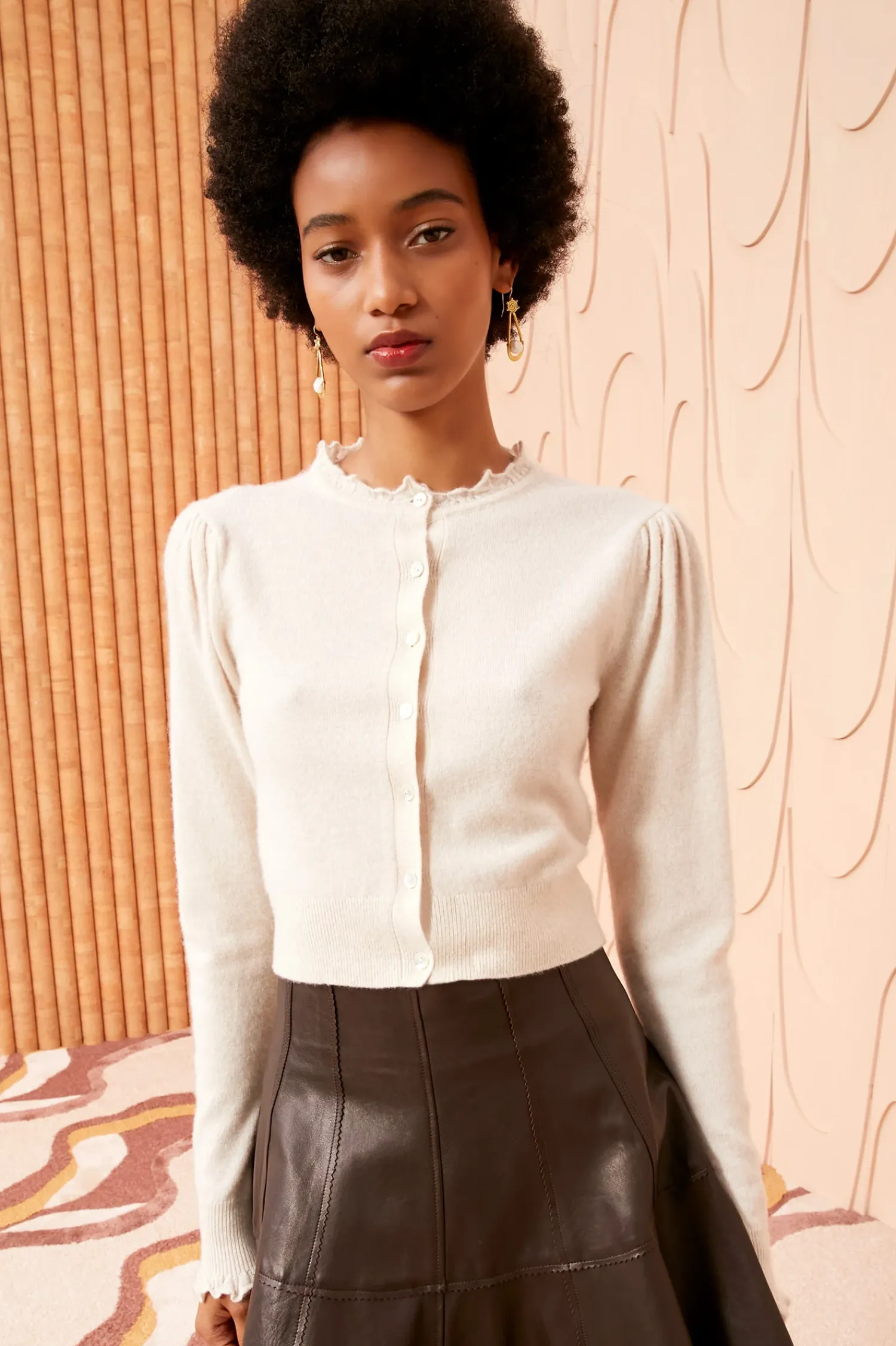 Spun From Super Soft Cashmere, The Jana Cardigan Is A Classic Silhouette You’Ll Reach For Year-Round. This Long-Sleeve Cream-Hued Style Is Gently Gathered At The Shoulders And Is Trimmed With Pointelle Ruffles. It Fastens With Delicate Mother-Of-Pearl Buttons.