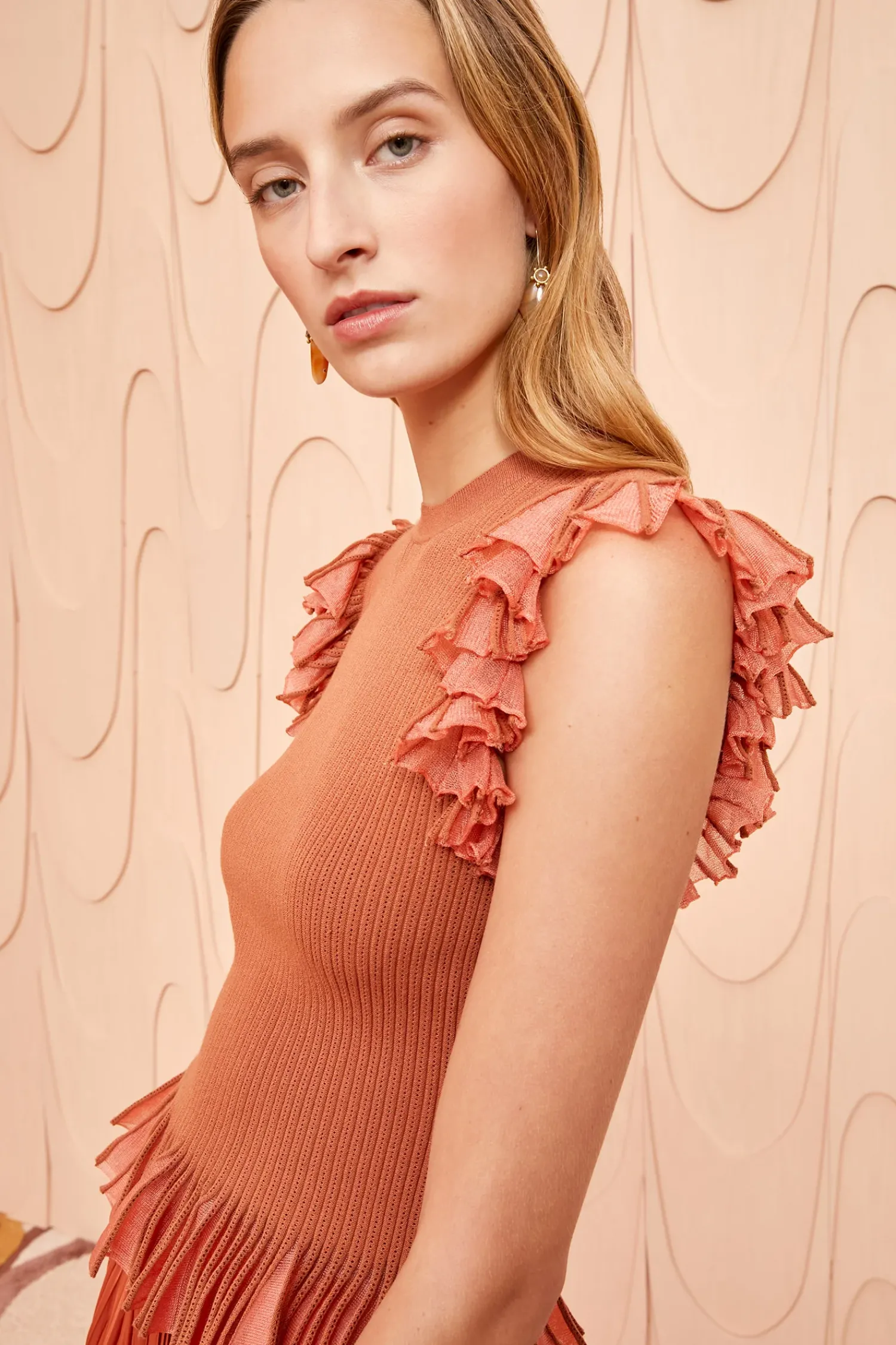 The Leila Top Is Made From Our Exquisite Ultrafine Sunburst Knit In A Beautiful Earthen Orange. It Features A Crewneck And Is Finished With Eye-Catching Flutters At The Sleeves And Hemline.