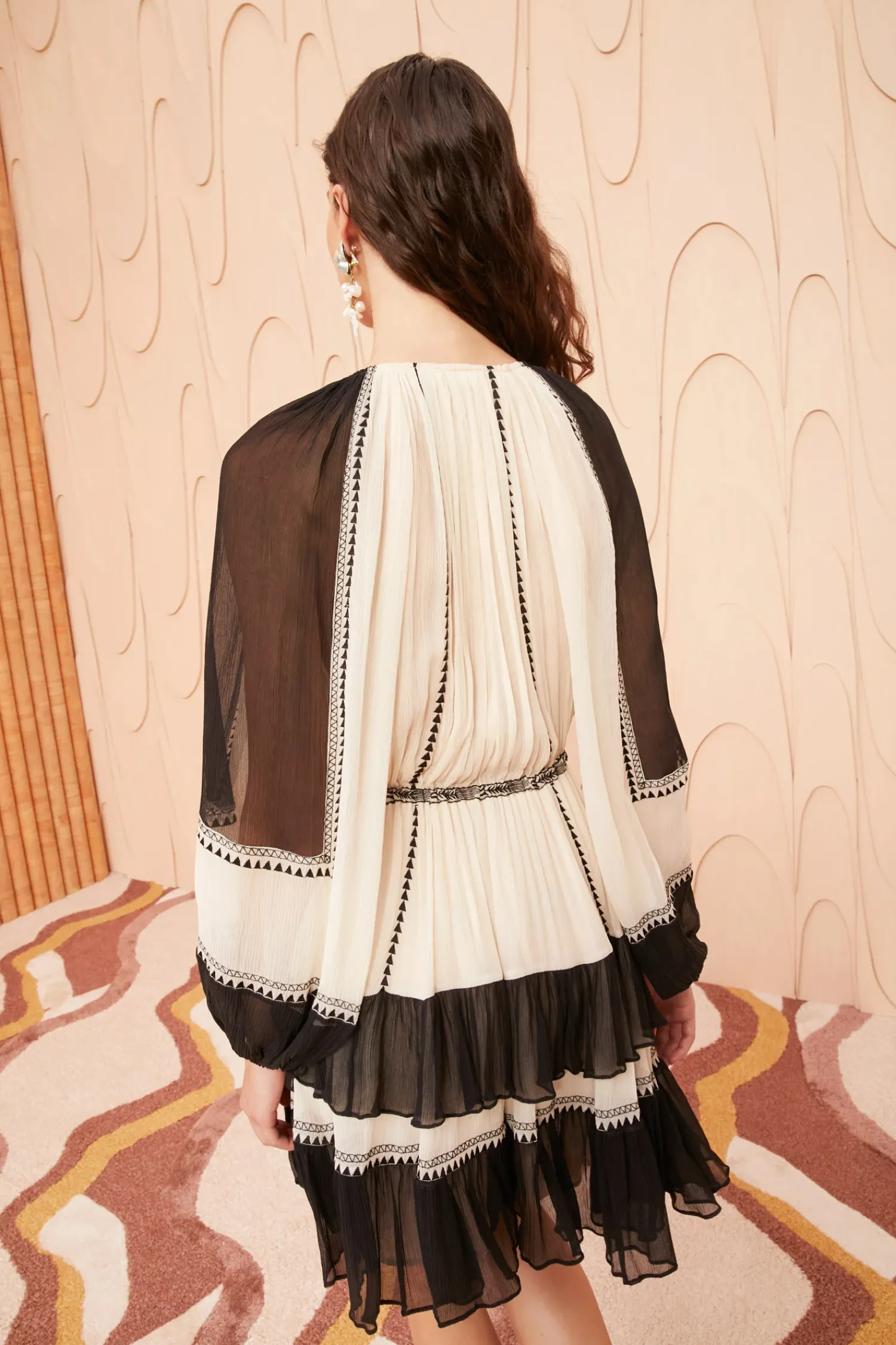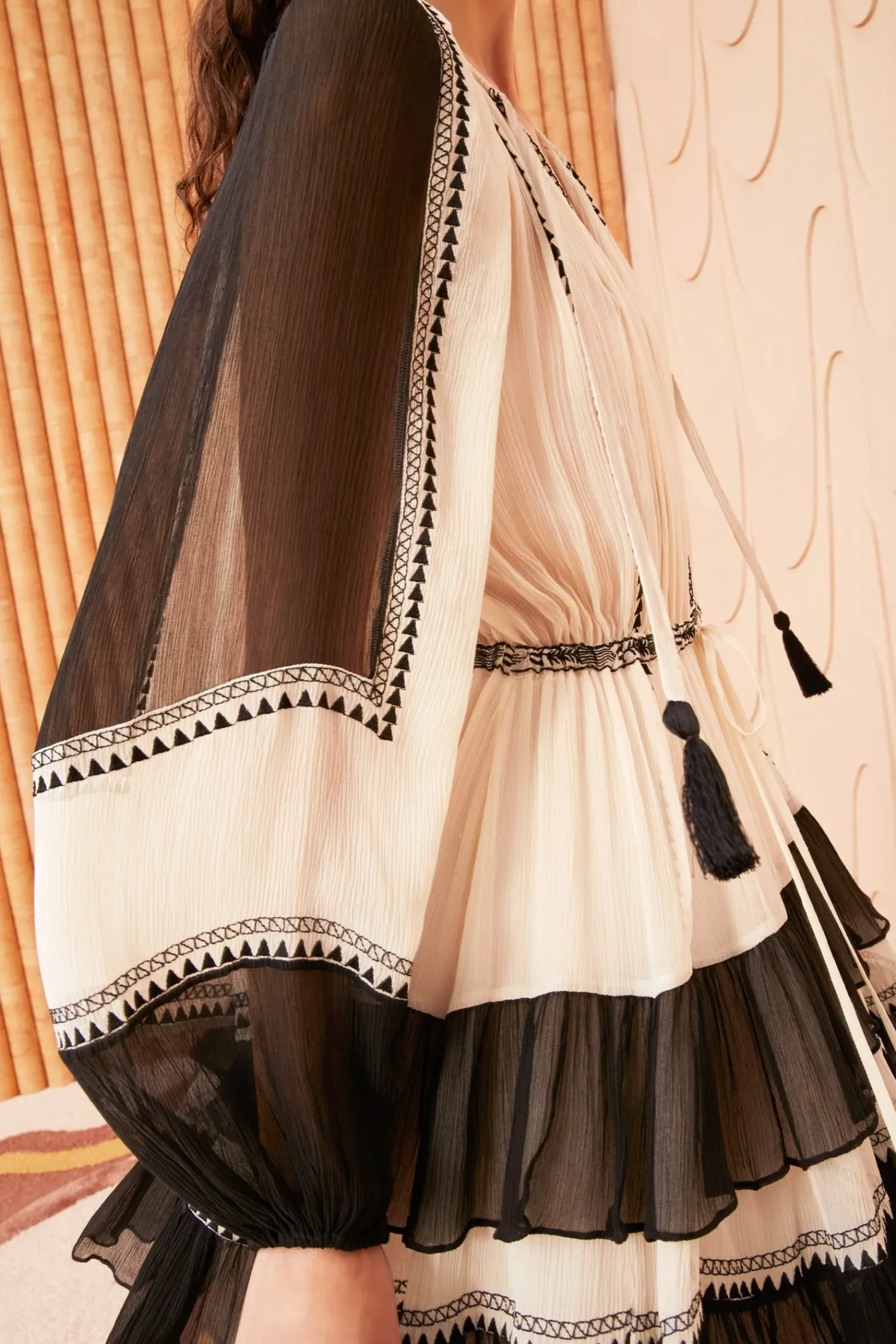 A Fluttering Lovely, The Loreli Dress Is Made From Our Signature Crinkle Silk Chiffon In A White And Black Color-Blocked Motif That’S Adorned With Intricate Thread Embroidery. This Ethereal Mini Dress Has Tasseled Neckties, A Drawstring Waist, And A Tiered Ruffled Hemline.
