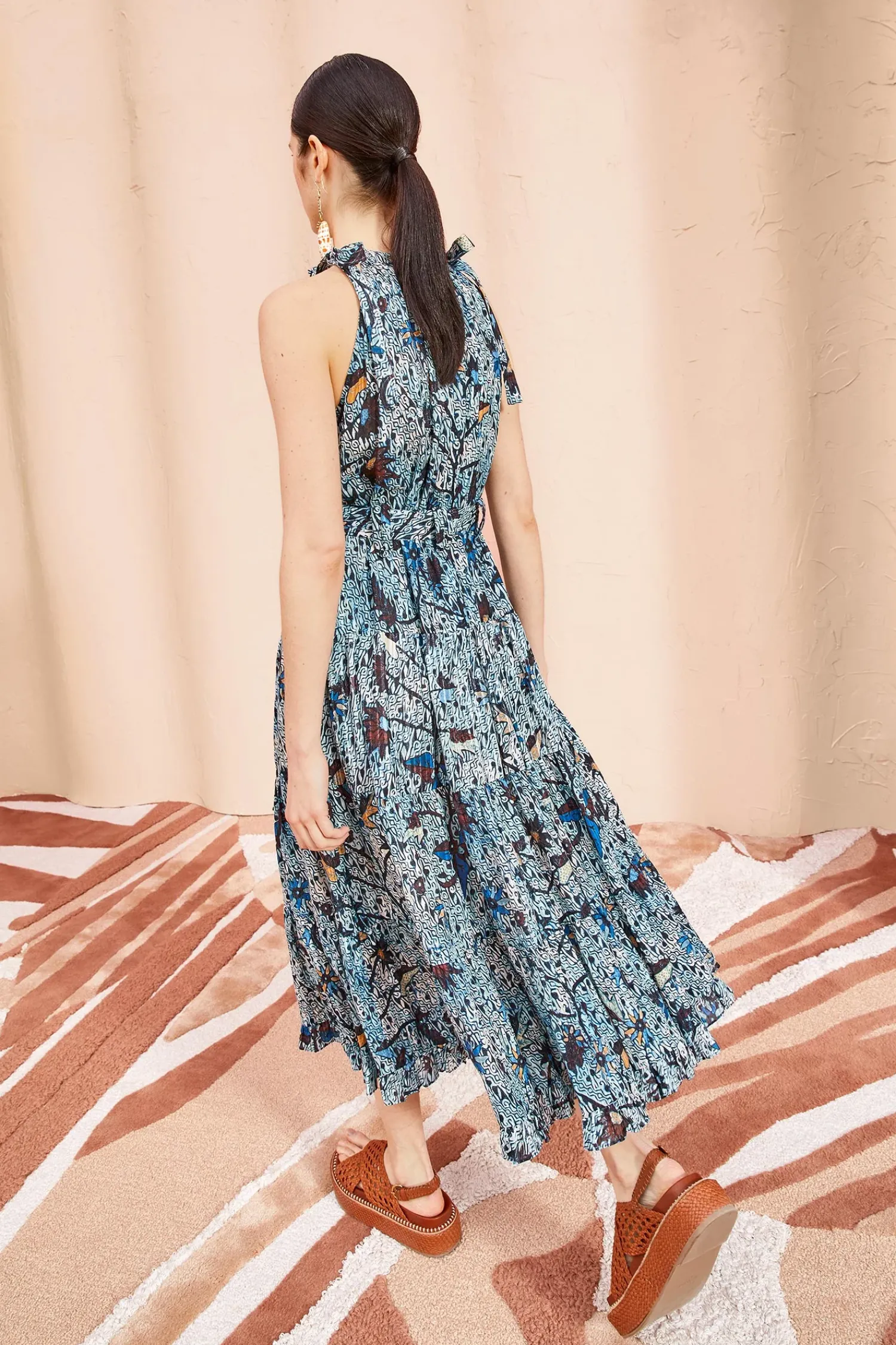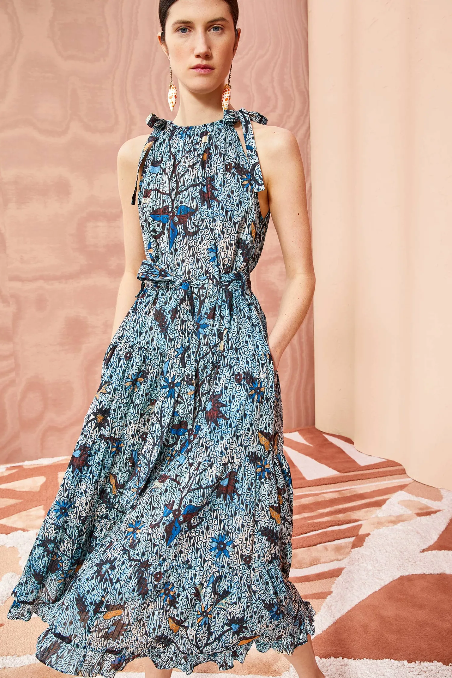 Modeled After Our Longtime Best-Selling Poplin Joni Dress, Our New Mariam Dress Is A Lightweight, Sleeveless Silhouette Crafted From Our Signature Shadow Stripe. This Elegant Blue Printed Dress Features A Graphic Batik-Inspired Design, A High Straight-Across Neckline And A Flowing Midi Length Skirt. Defined By Sweet Ties At The Shoulder, A Fabric Belt At The Waist, And Ruffled Hemline.
