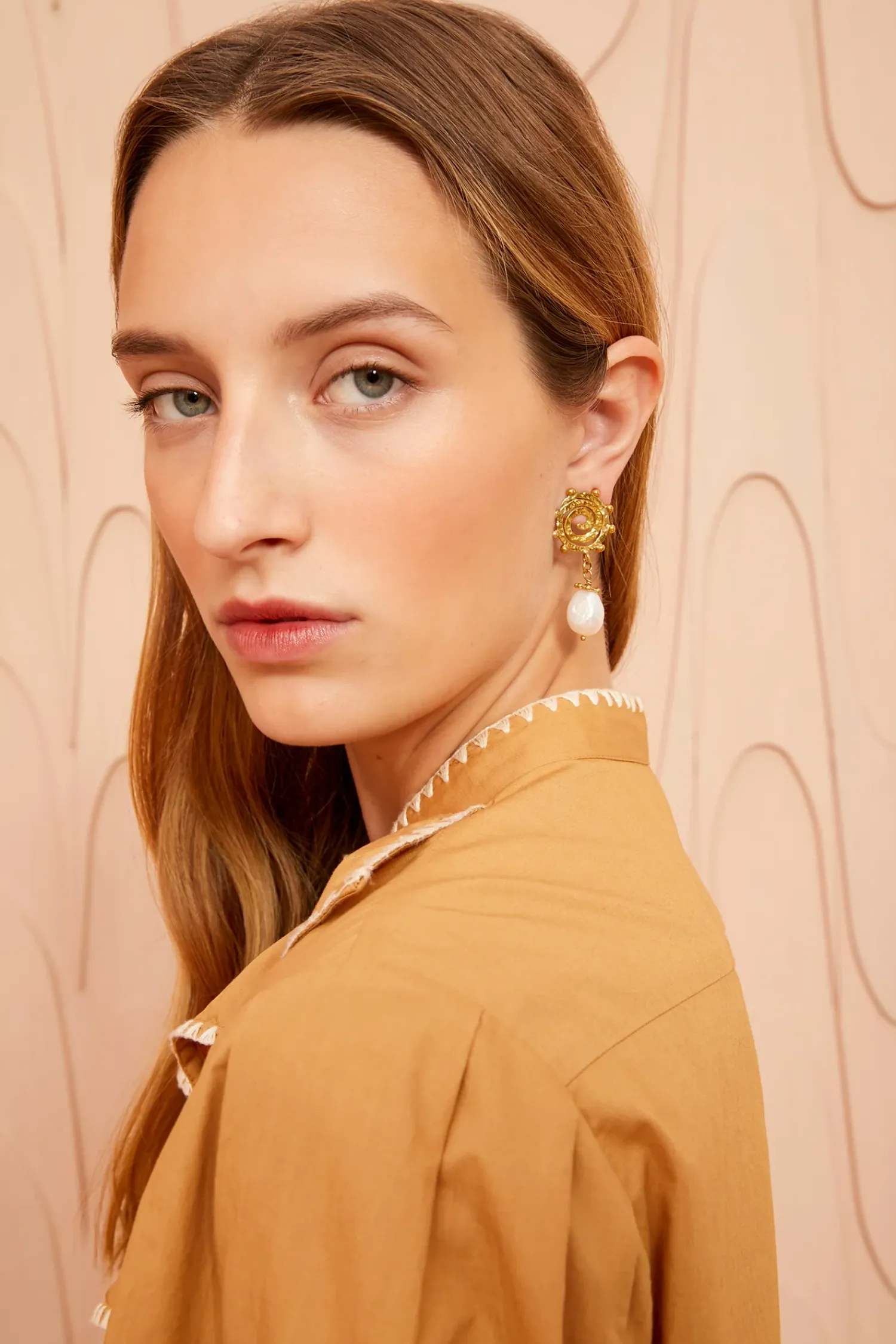 Strewn With A Freshwater Pearl, Our Mini Spiral Stone Earring Adds A Luminous Touch To Your Ensemble. It Is Handcrafted In Kenya From Gleaming Hammered Recycled Brass With A Spiral Silhouette Inspired By Ancient Artisanal Techniques. It Has Hypoallergenic Posts And Gold-Plated Earring Backs.