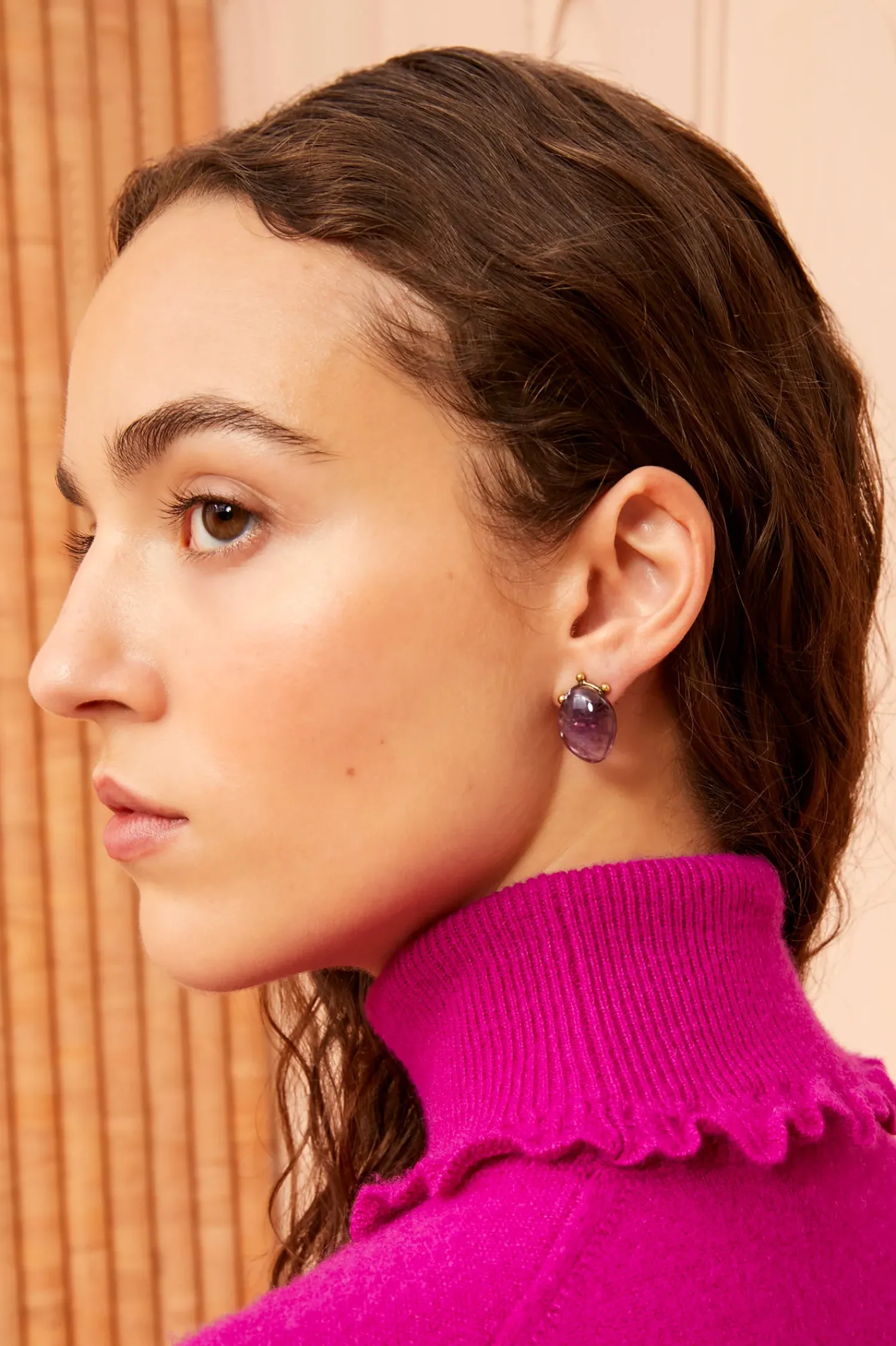 The Mini Stone Stud Earring Is Expertly Handmade By Our Long-Term Artisan Partners In Nairobi, Kenya, From Recycled Brass And Set With A Gleaming Purple Fluorite Gemstone. It Has Hypoallergenic Posts And Gold-Plated Earring Backs.