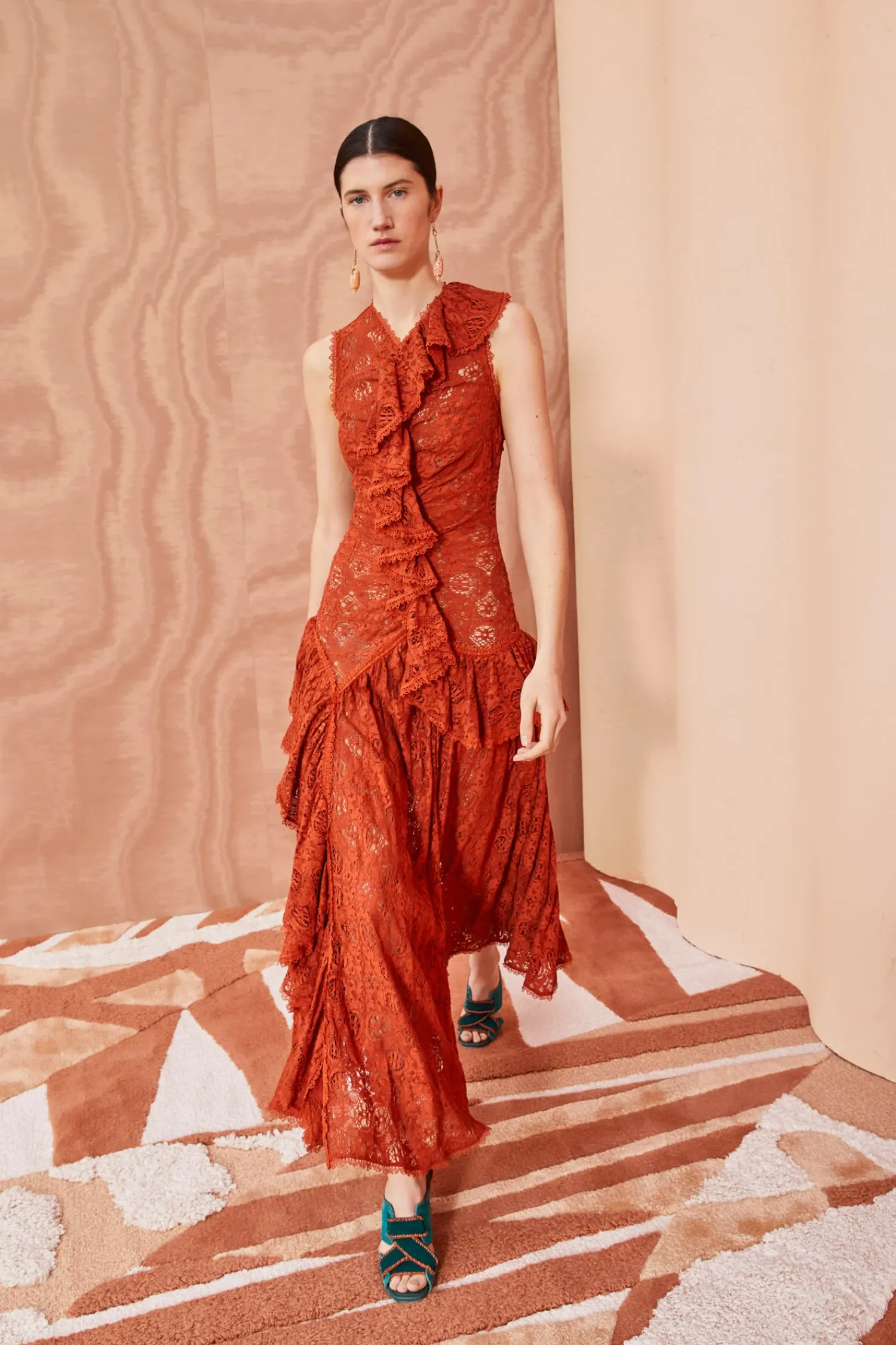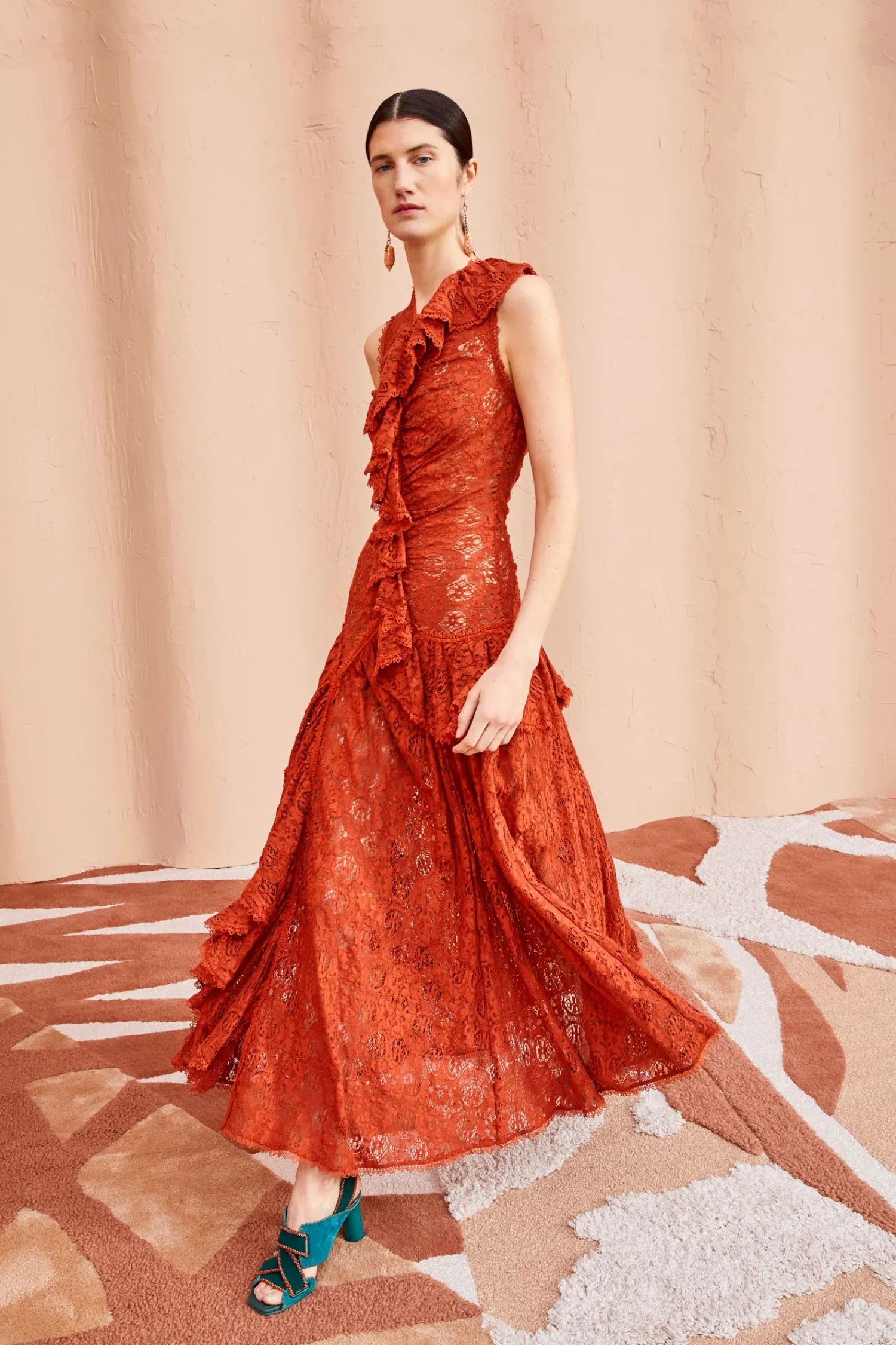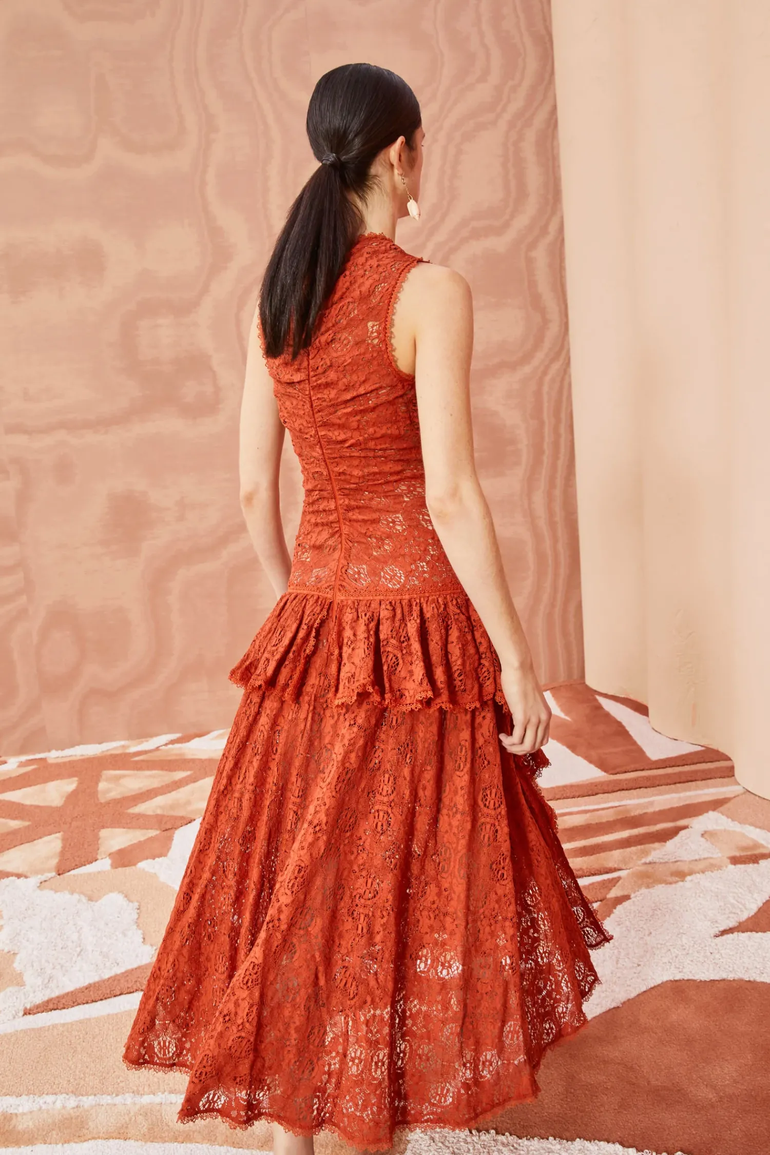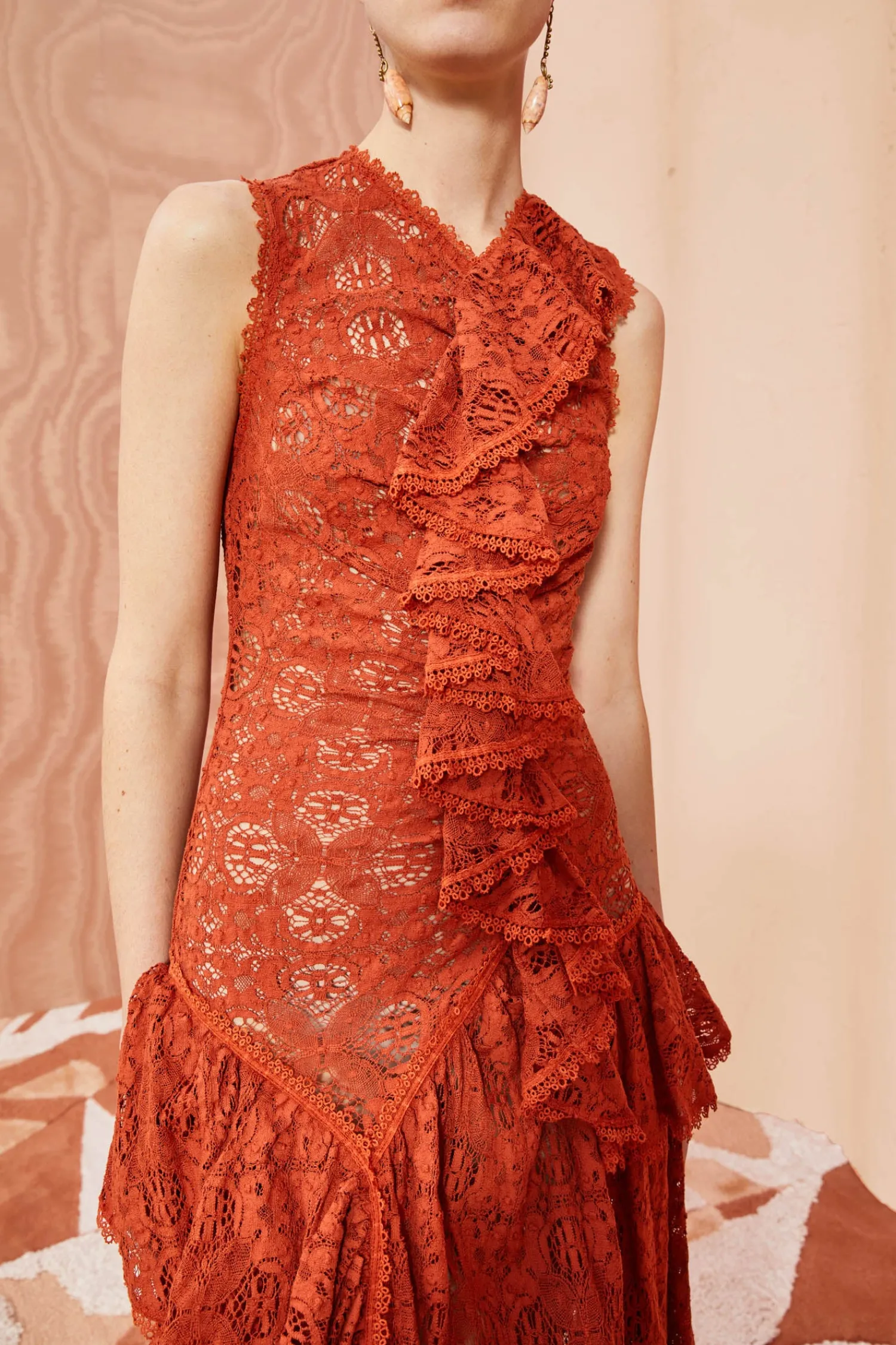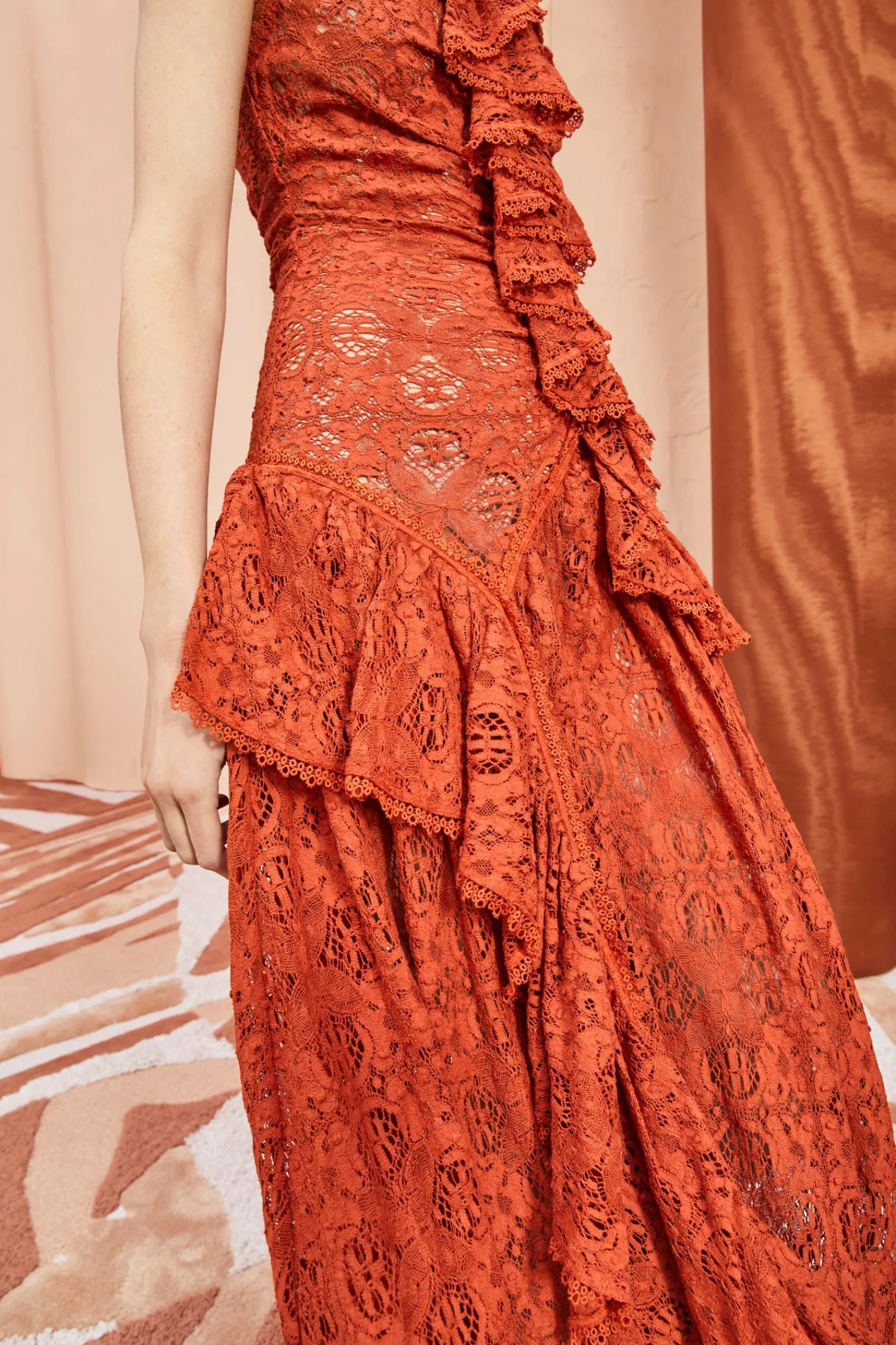 As Featured In Look 27 Of Our Pre-Fall ’23 Lookbook, The Odile Dress Is Made From Delicate Cotton Lace That Floats Against The Body In Layers Of Cascading Ruffles. Inspired By Antique Textiles, This Gorgeous Frock Features Floral And Butterfly Motifs And Is Detailed With Fine Trim. This Sleeveless Dark Red Maxi Dress Has A Smocked Bodice With A Cascading Ruffle Trailing From The Neckline To The Skirt. It Is Finished With A Zipper Along The Back.