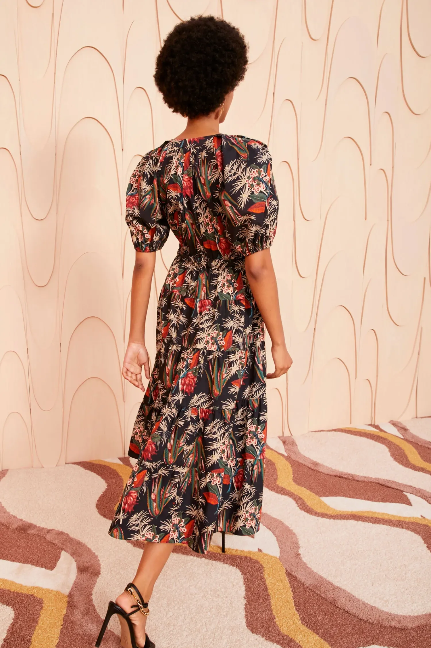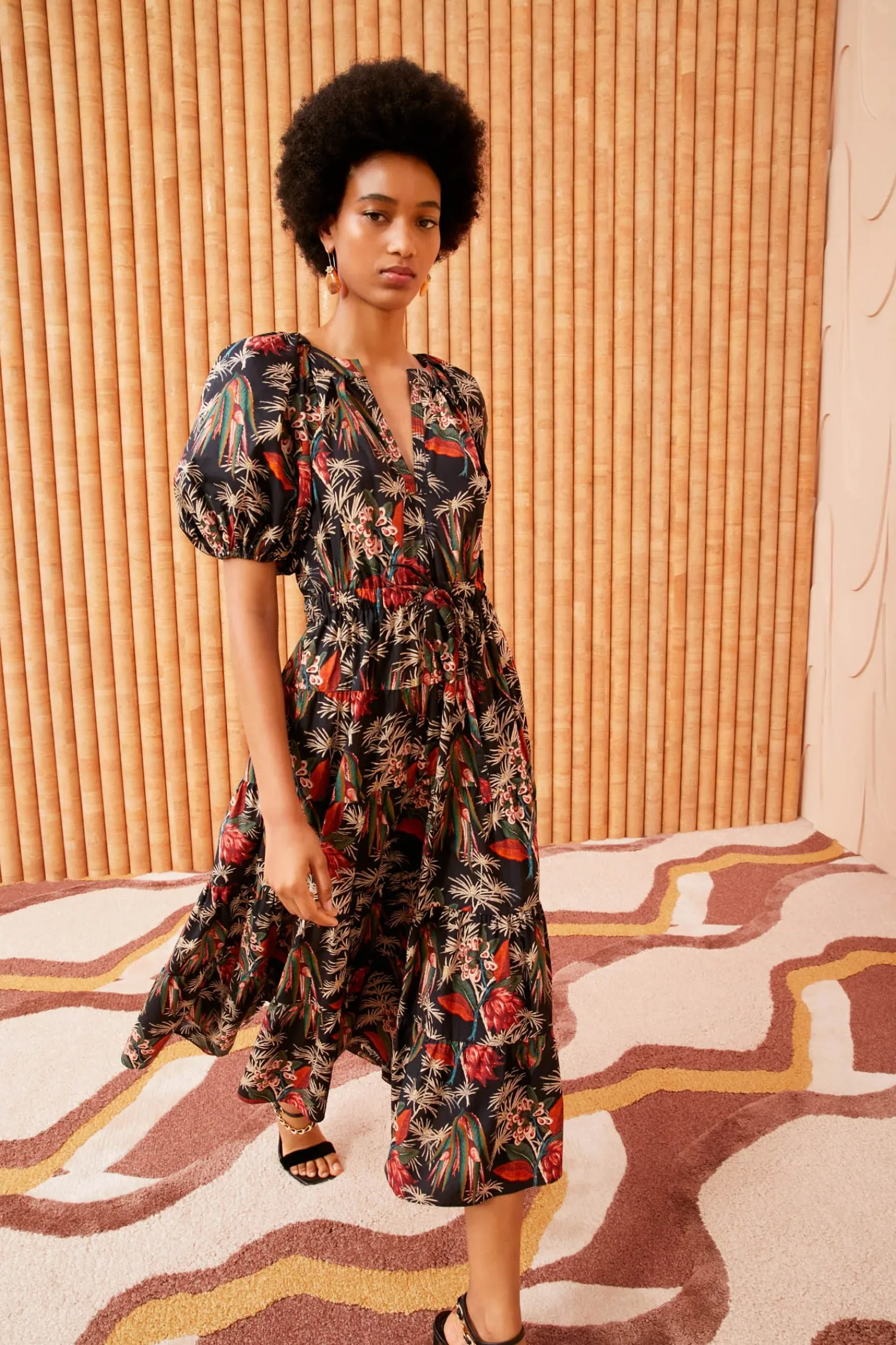 The Olina Dress Is A Bestselling Frock Crafted From Black Cotton Poplin That’S Splashed With Vivid Botanicals Inspired By An 18Th Century Tapestry. Framed By Our Signature Puff Sleeves, This Midi-Length Dress Has A Split Neckline, Elastic Drawstring Waist, And Unfurls To A Tiered Skirt.