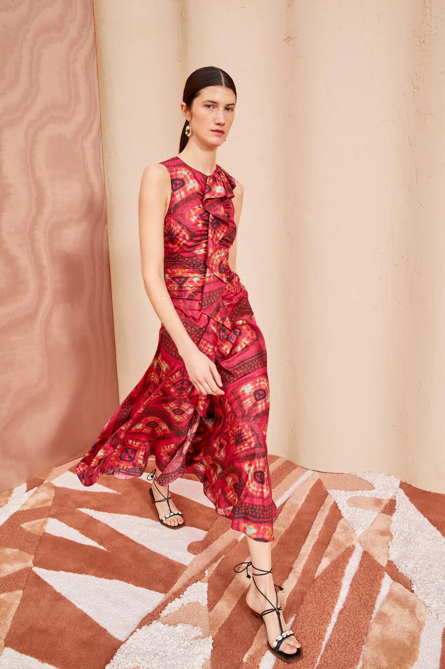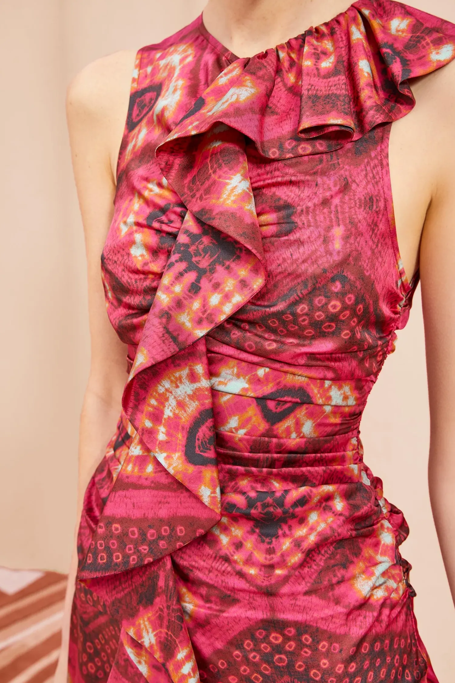 The Othella Dress, As Seen In Look 11 Of Our Pre-Fall ’23 Lookbook, Is Made From Gorgeous Silk Twill That Has Been Printed In A Vibrant Diamond Shibori Pattern. The Bodice Features A Flattering Ruched Texture Created By A Center-Seam With A Cascading Ruffle. This Dark Pink Midi Dress Has A Dramatic Slit In The Front Of The Skirt And Is Finished With A Side-Seam Zip Closure.