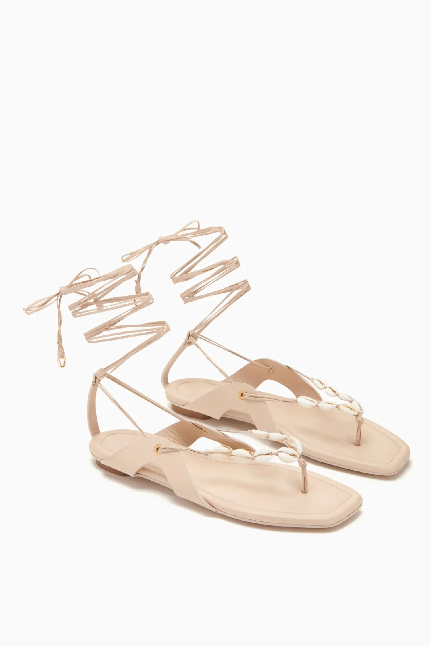 The Romina Shell Lace Up Sandal Is Crafted In Luxurious White Leather And Decorated With Cowrie Shells Along The Front. This Pristine Warm-Weather Shoe Is Finished With Delicate Leather Details That Tie Around The Ankle.