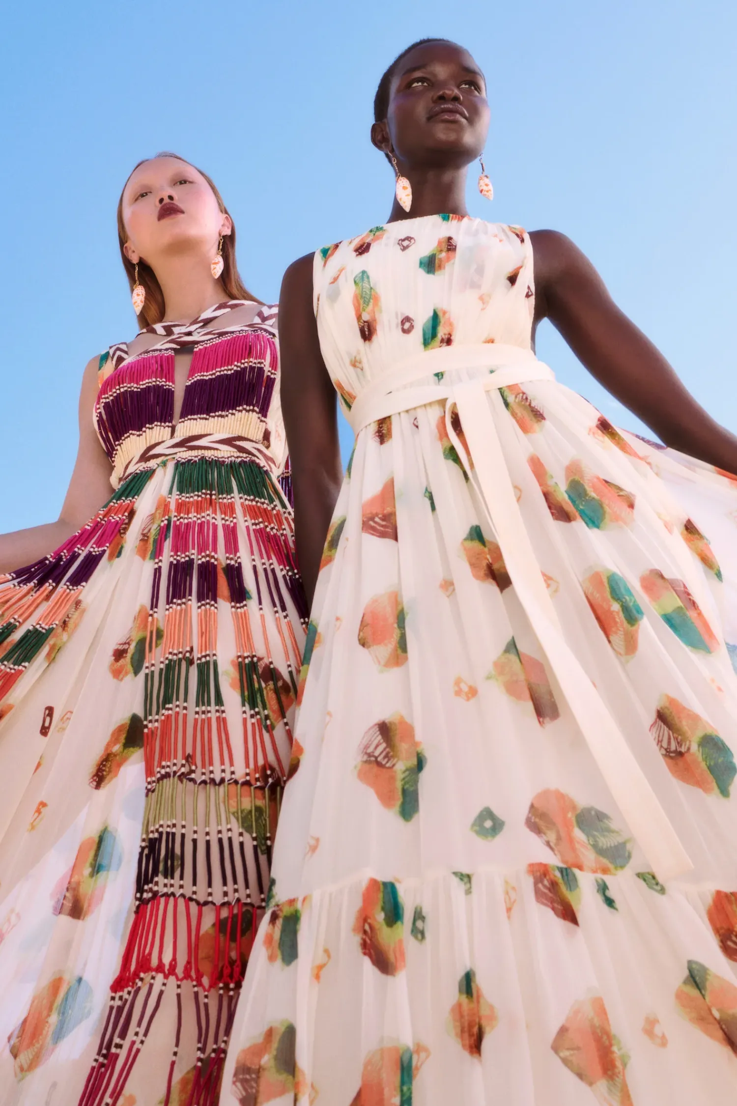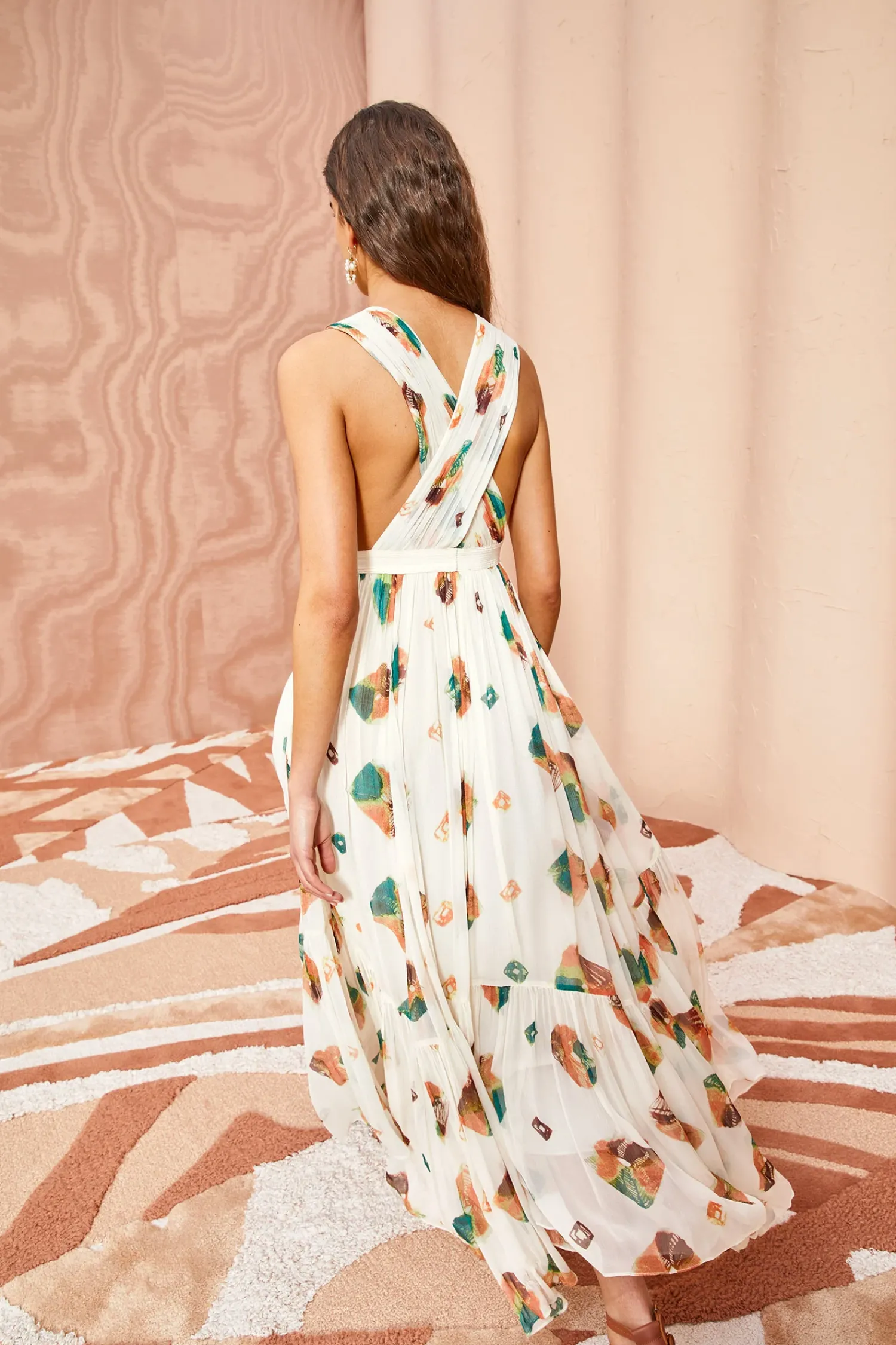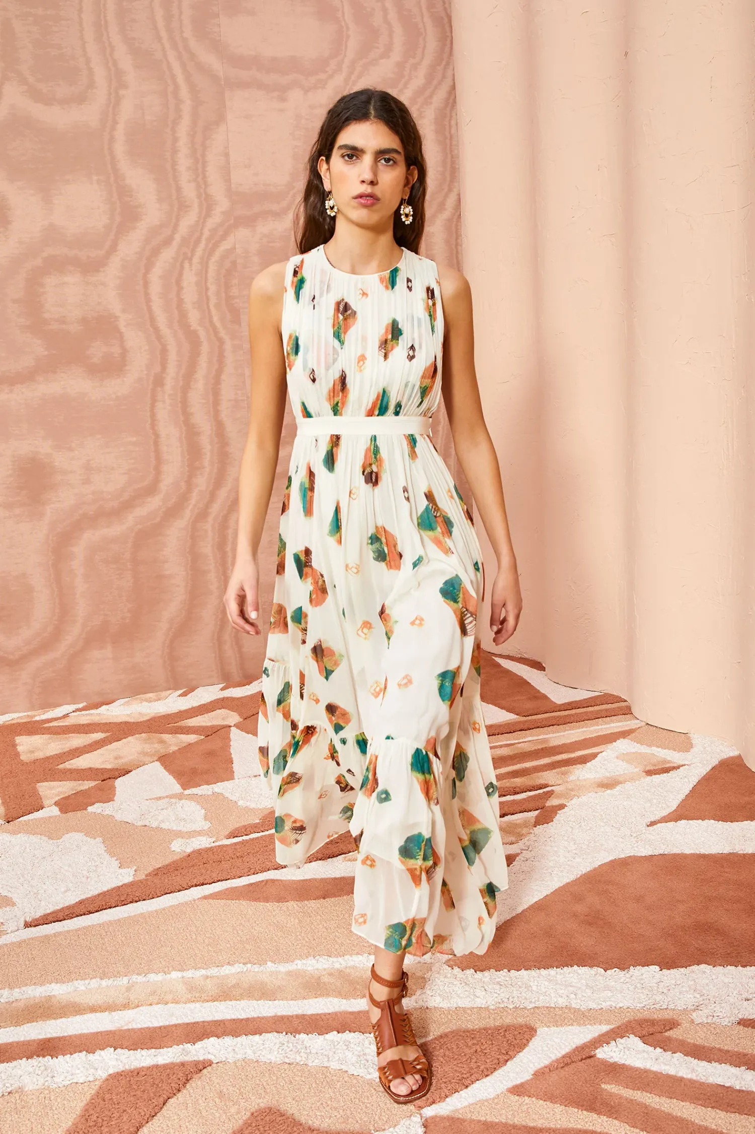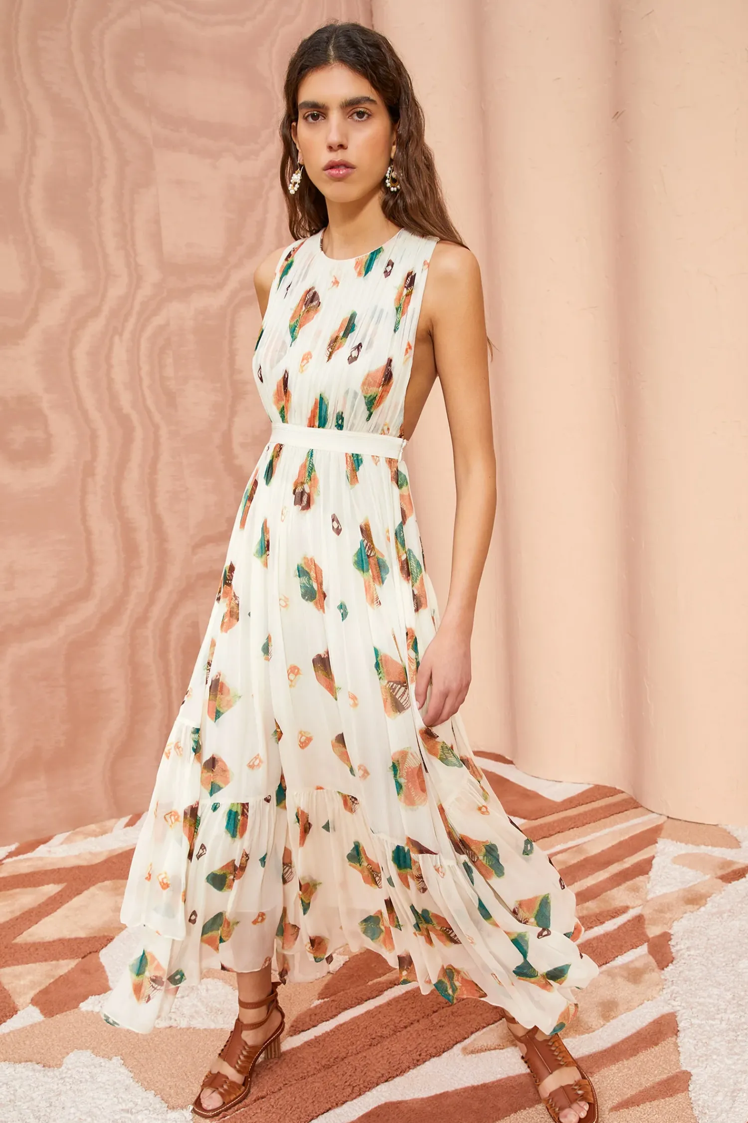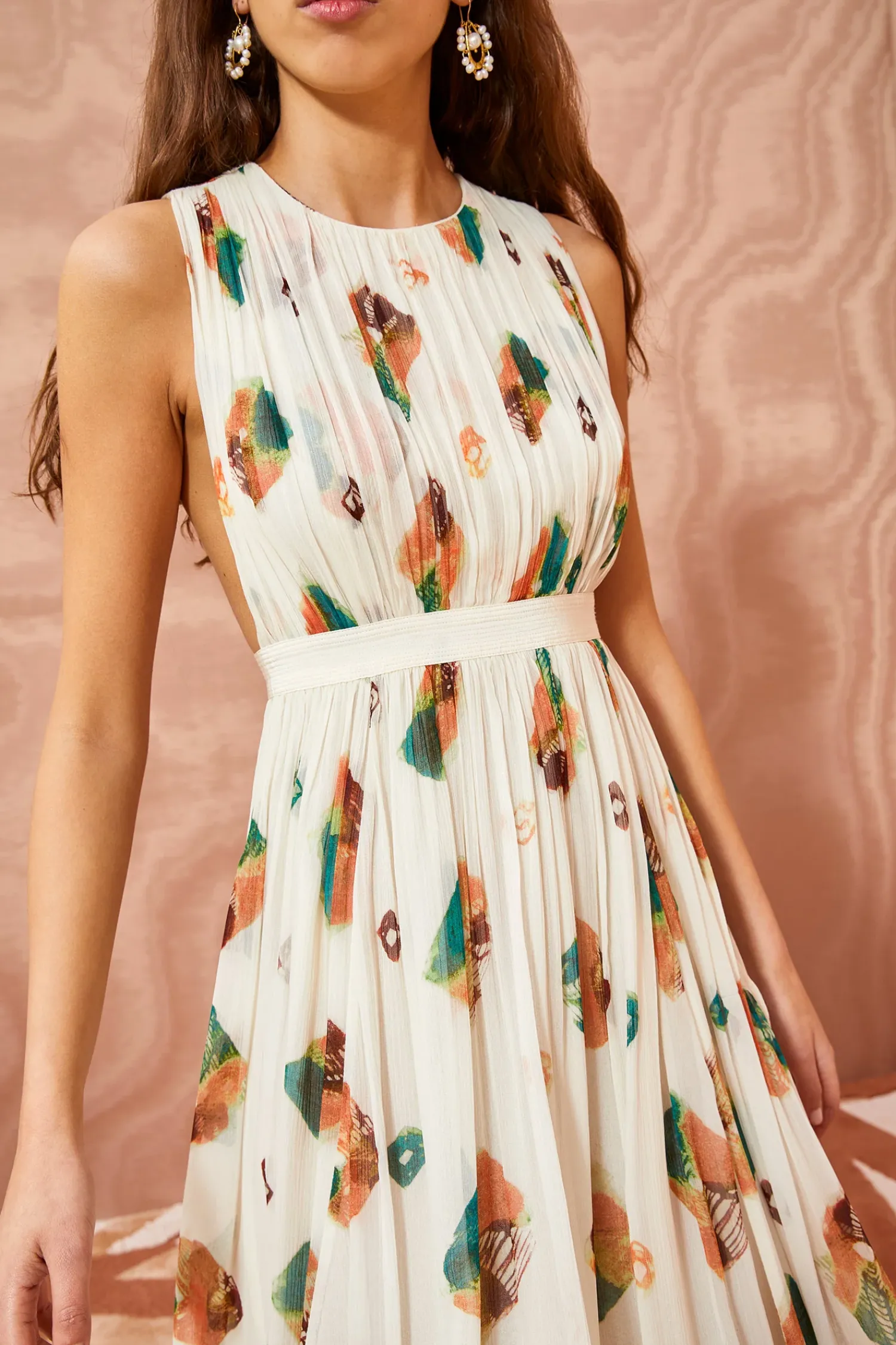 The Sarai Dress Is Cut In A Stunning Diaphanous Silk Chiffon. Crafted In Our Cream And Multicolored Floating Shibori Print, This Flowing Dress Has A Handkerchief Midi-Length Hemline, A Fixed Waist And A Criss-Cross Back. It Is Finished With A Side-Seam Zipper.