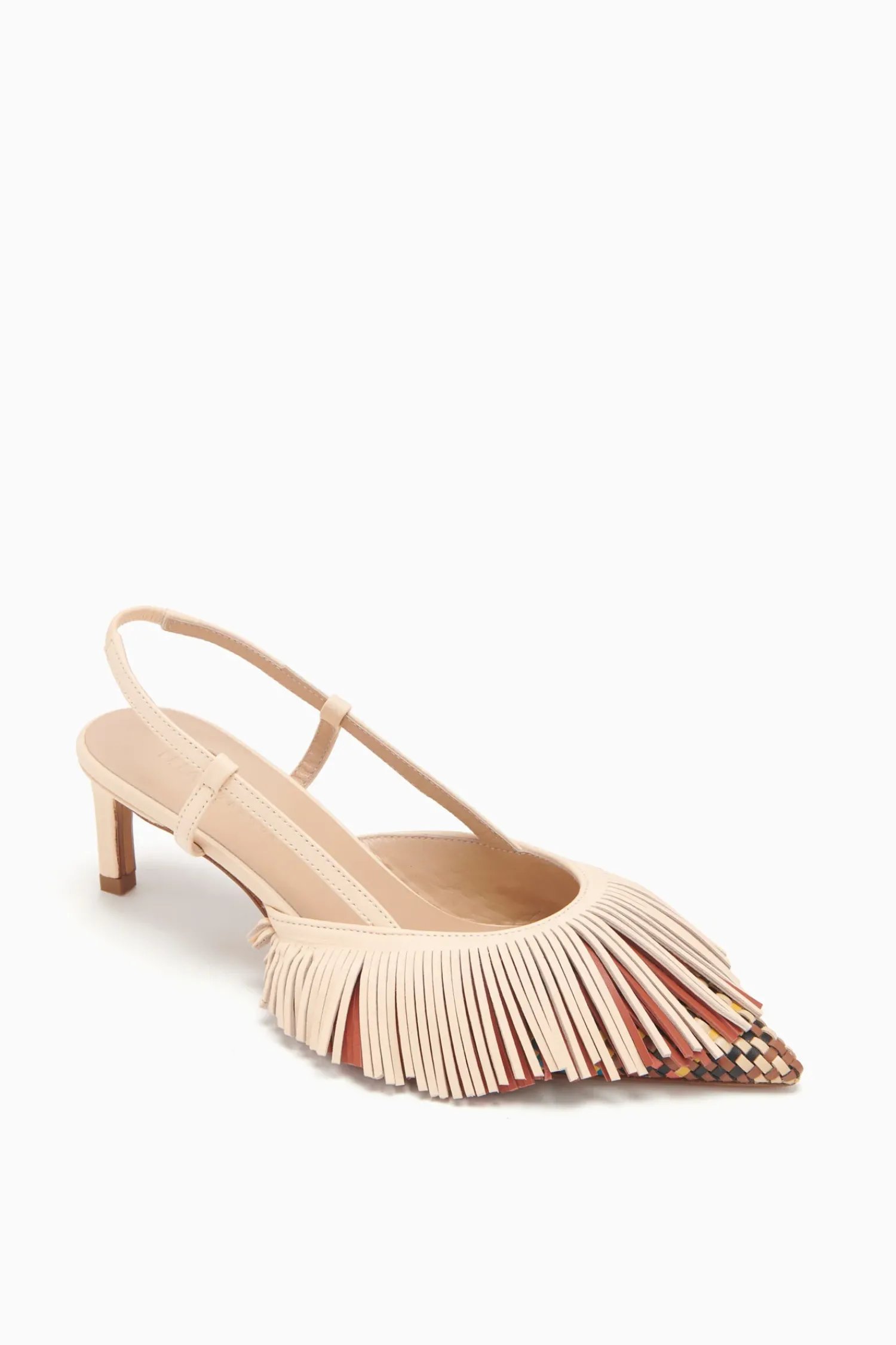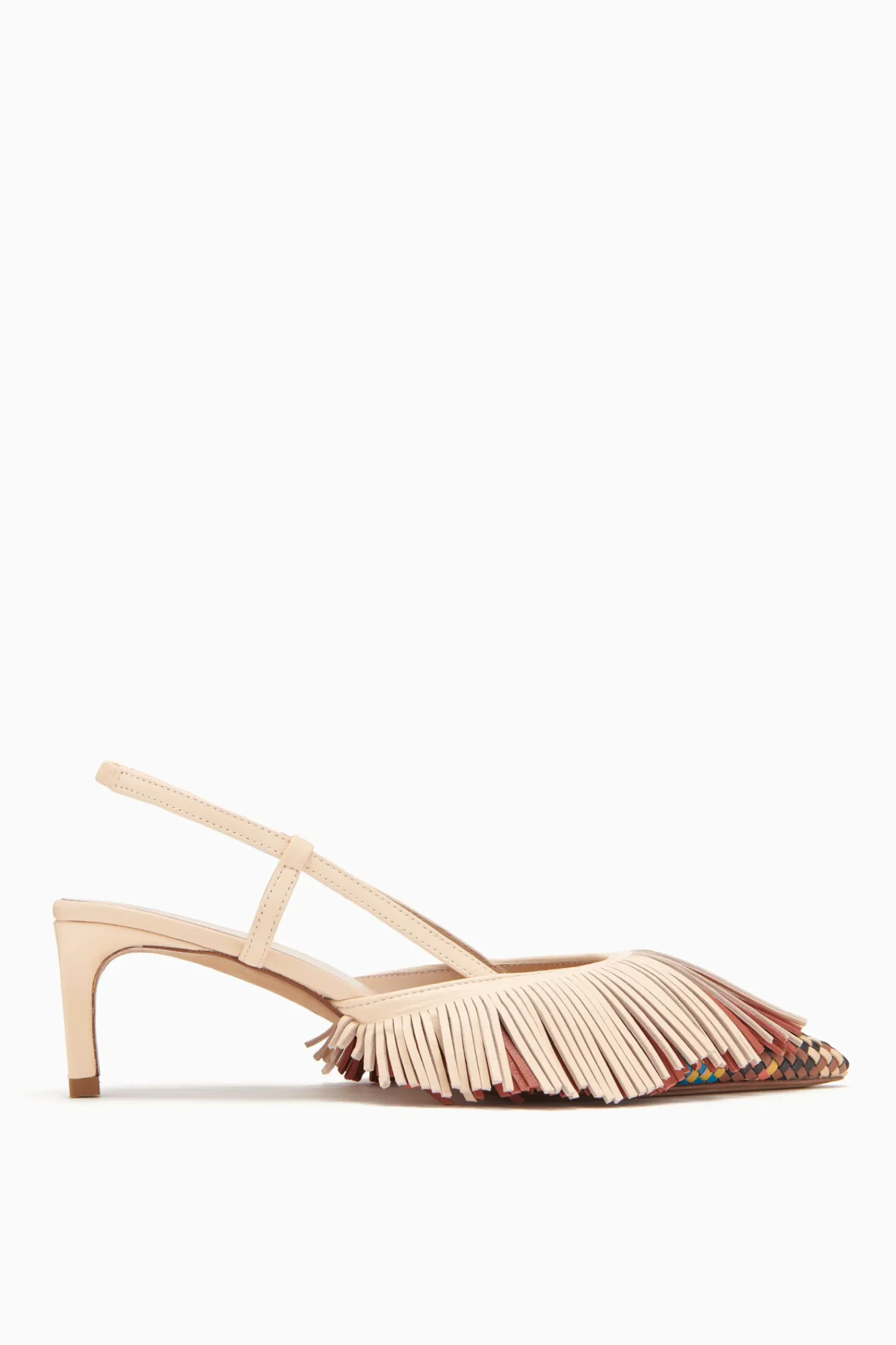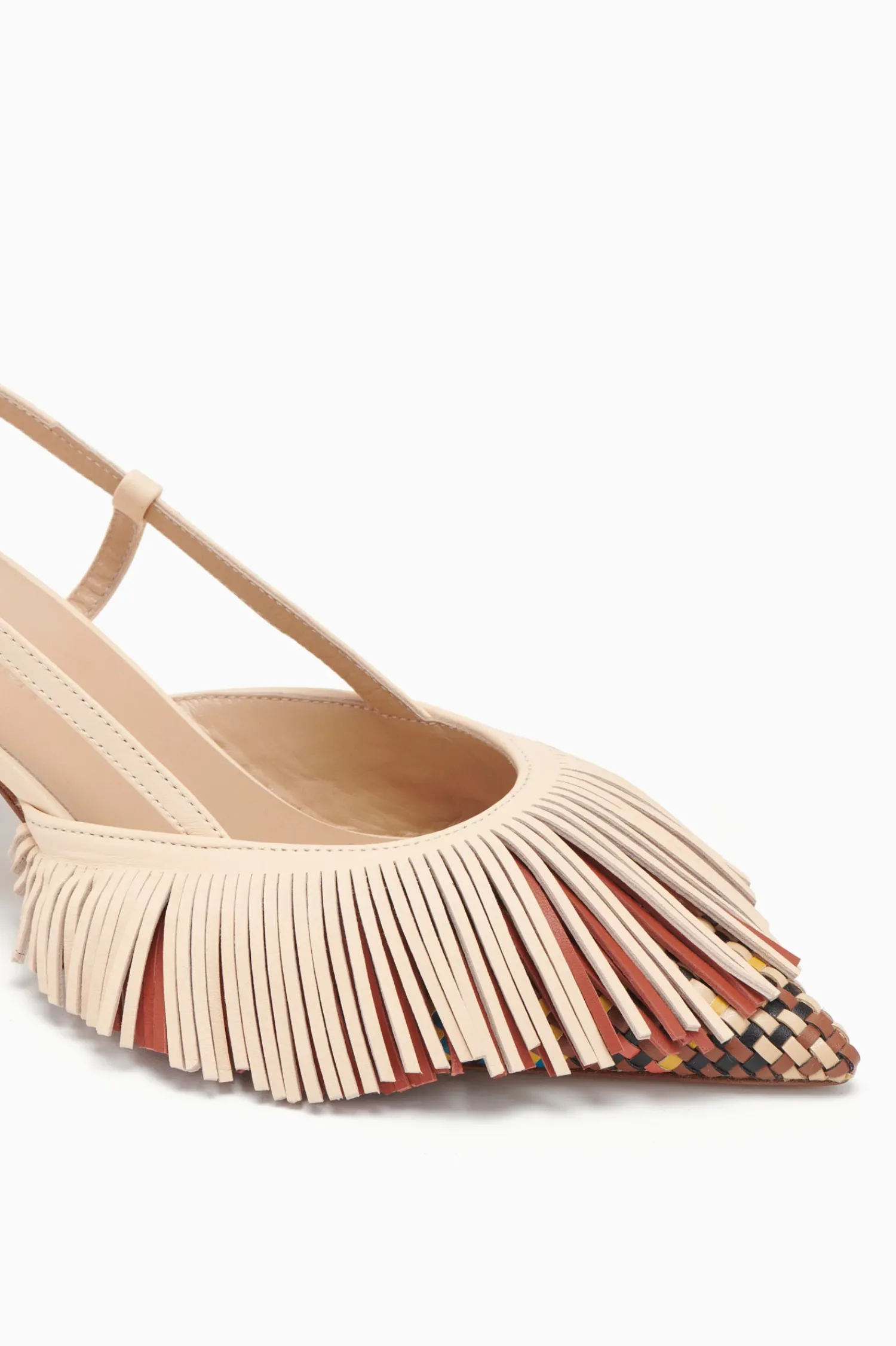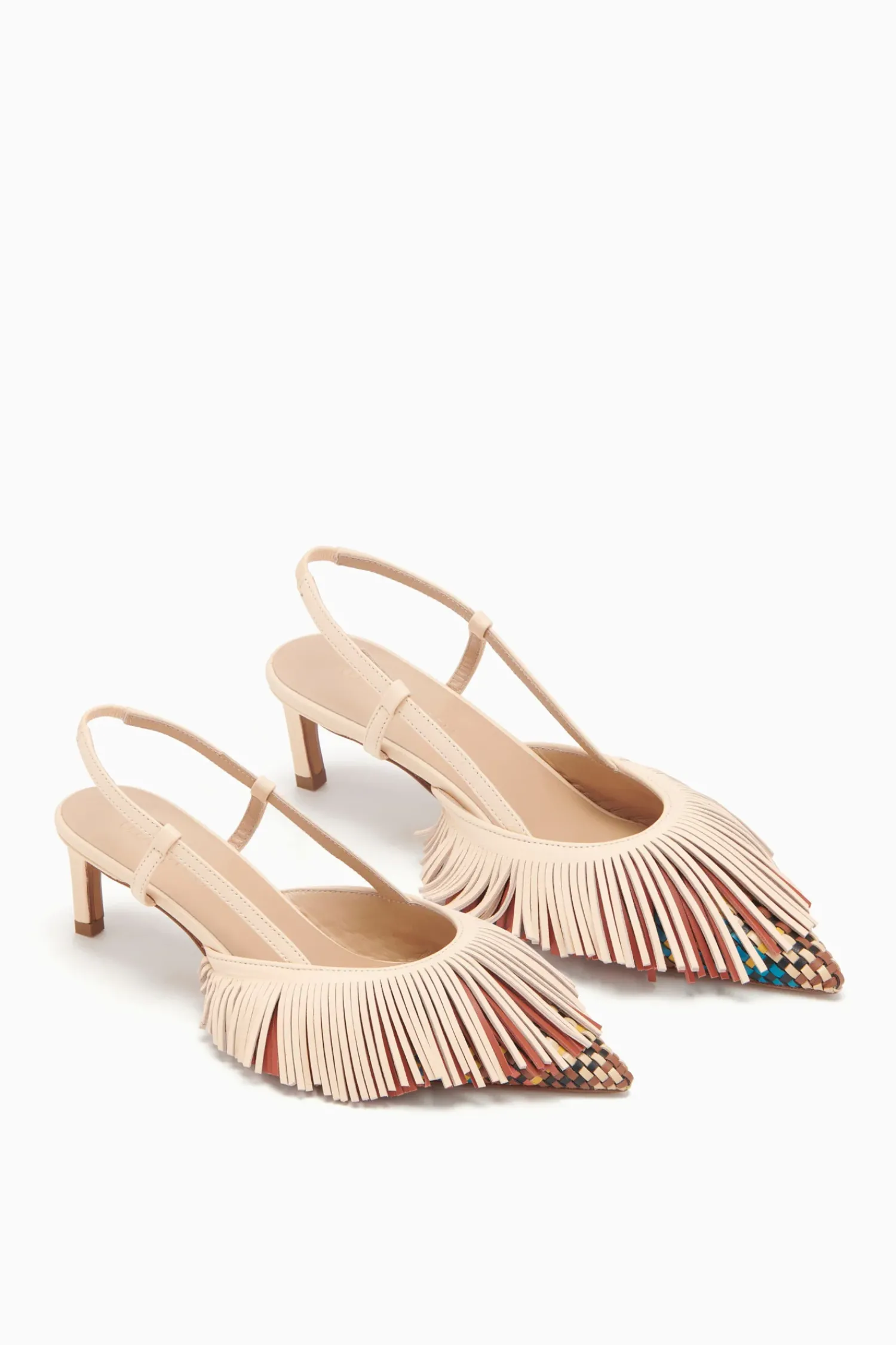 An Autumn/Winter ’23 Favorite Reimagined For Pre-Spring ’24, The Shira Fringe Slingback Is Woven From Brown, Blue, And Yellow Vegan Leather With Beautiful Fringe Draped Across The Silhouette. This Exquisite Shoe Rests On A 50Mm Heel And Is Elasticated At The Back For Comfort.