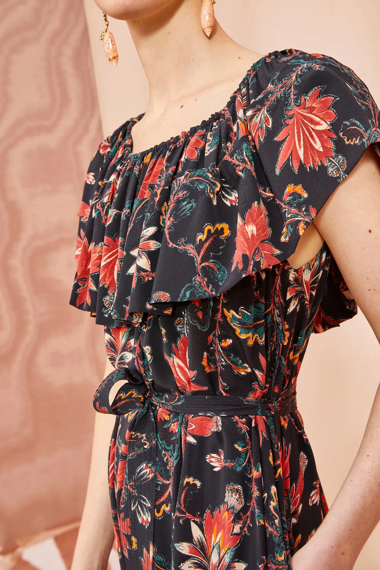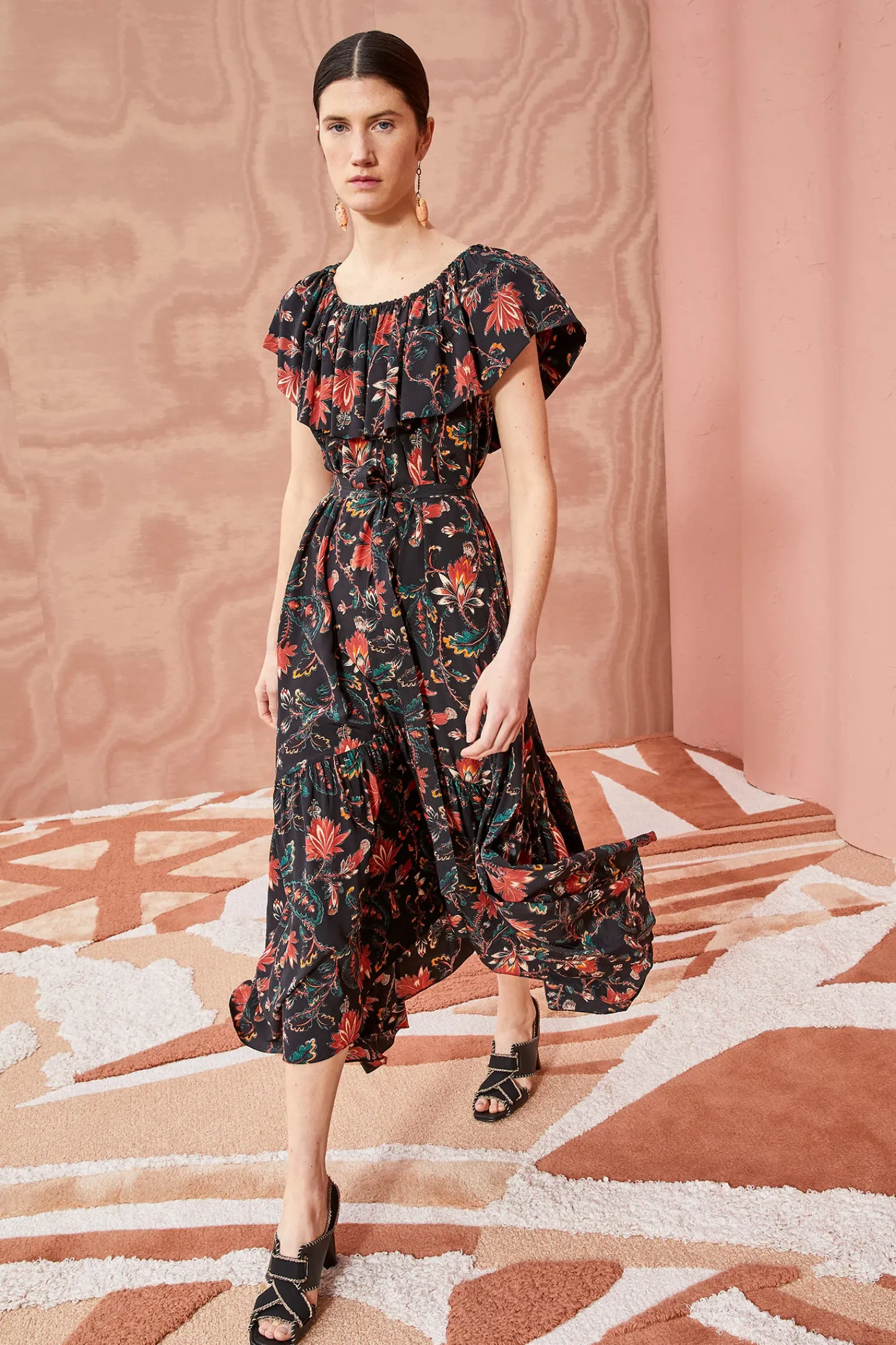 The Skye Dress Is Crafted From Our Signature Crepe De Chine Featuring A Floral Print With A Black Base That Pops With Hints Of Crimson And Green. This Maxi Dress Is Defined By Its Exaggerated Ruffle Along The Neck, A Full Tiered Skirt, A Functional Tie At The Waistband And Side-Seam Pockets. This Romantic, Summery Silhouette Can Be Worn On Or Off The Shoulder.