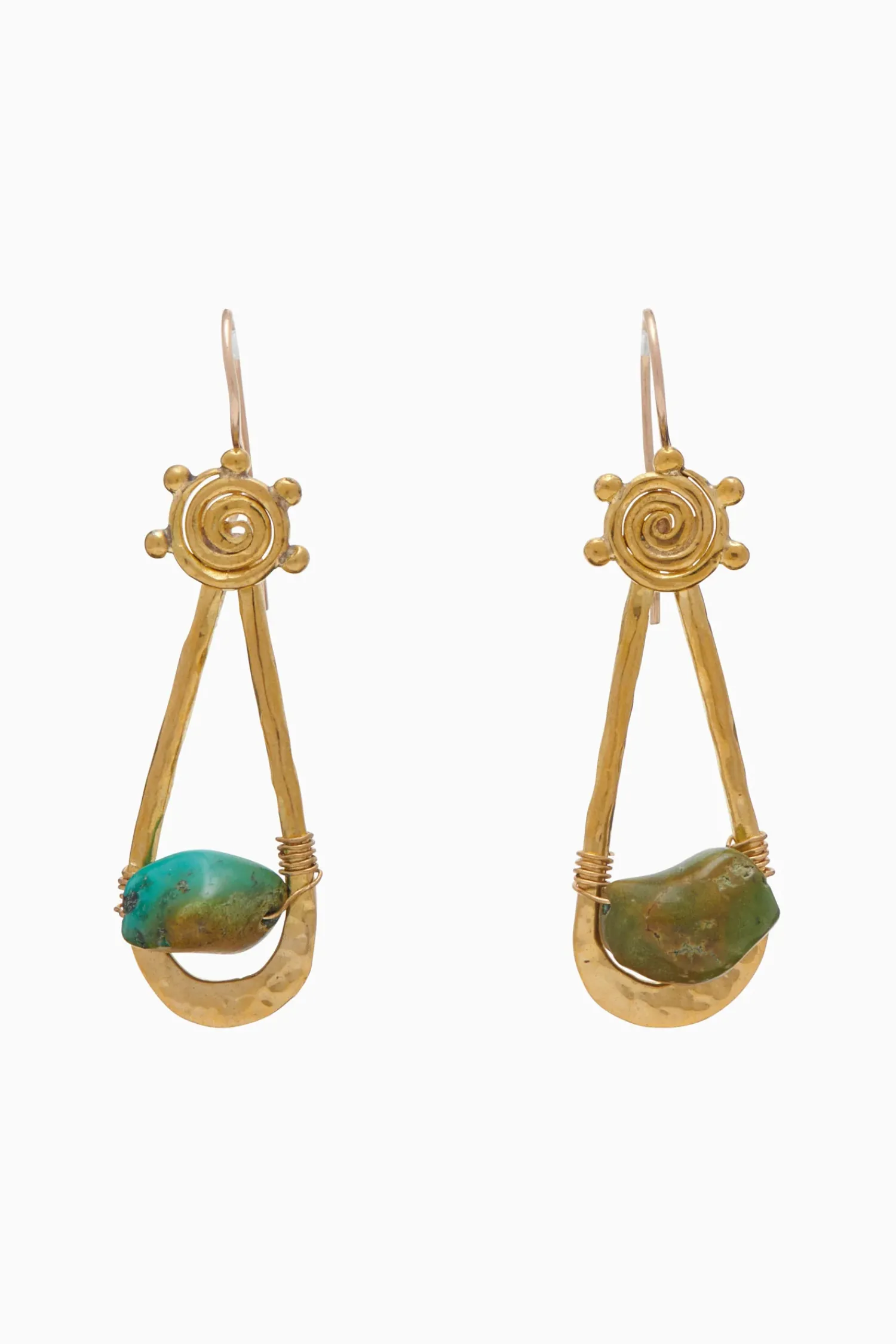 The Spiral Drop Stone Earring Is Hand-Hammered From Recycled Brass With A Spiral Motif Inspired By Ancient Craft Techniques And Is Strewn With A Green Turquoise Gemstone. All Of Our Jewelry Is Masterfully Handcrafted By Our Long-Term Artisan Partners In Nairobi, Kenya, So Each One Is Unique. It Fastens With A Gold Wire Hook.