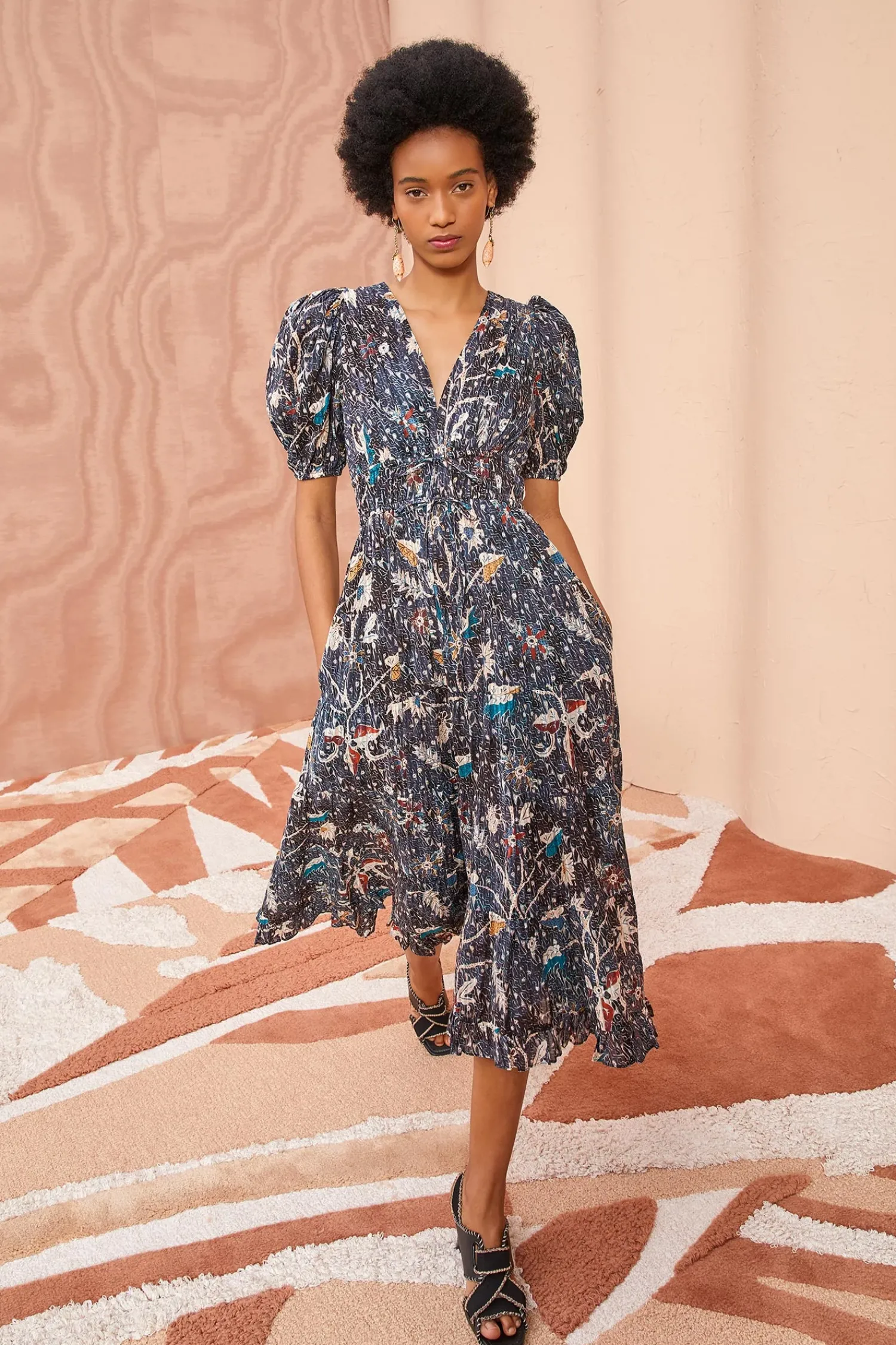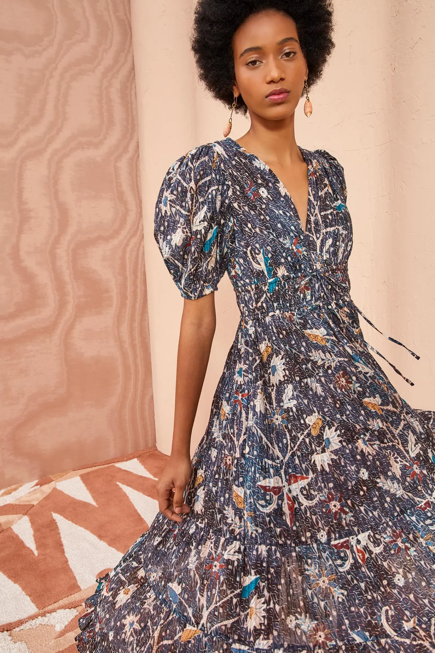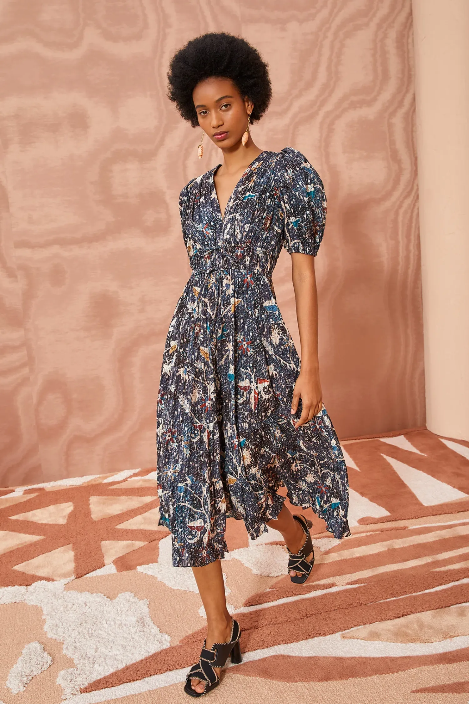 The Thelma Dress Is An Effortless Silhouette Crafted In Our Signature Shadow Stripe Cotton. This Graphic Midi Dress Features A Blue And Grey Batik-Inspired Print, And Is Defined By Puff Sleeves, And A Ruched Bodice With Two Drawstring Ties At The Fitted Waist. Finished With Side-Seam Pockets.
