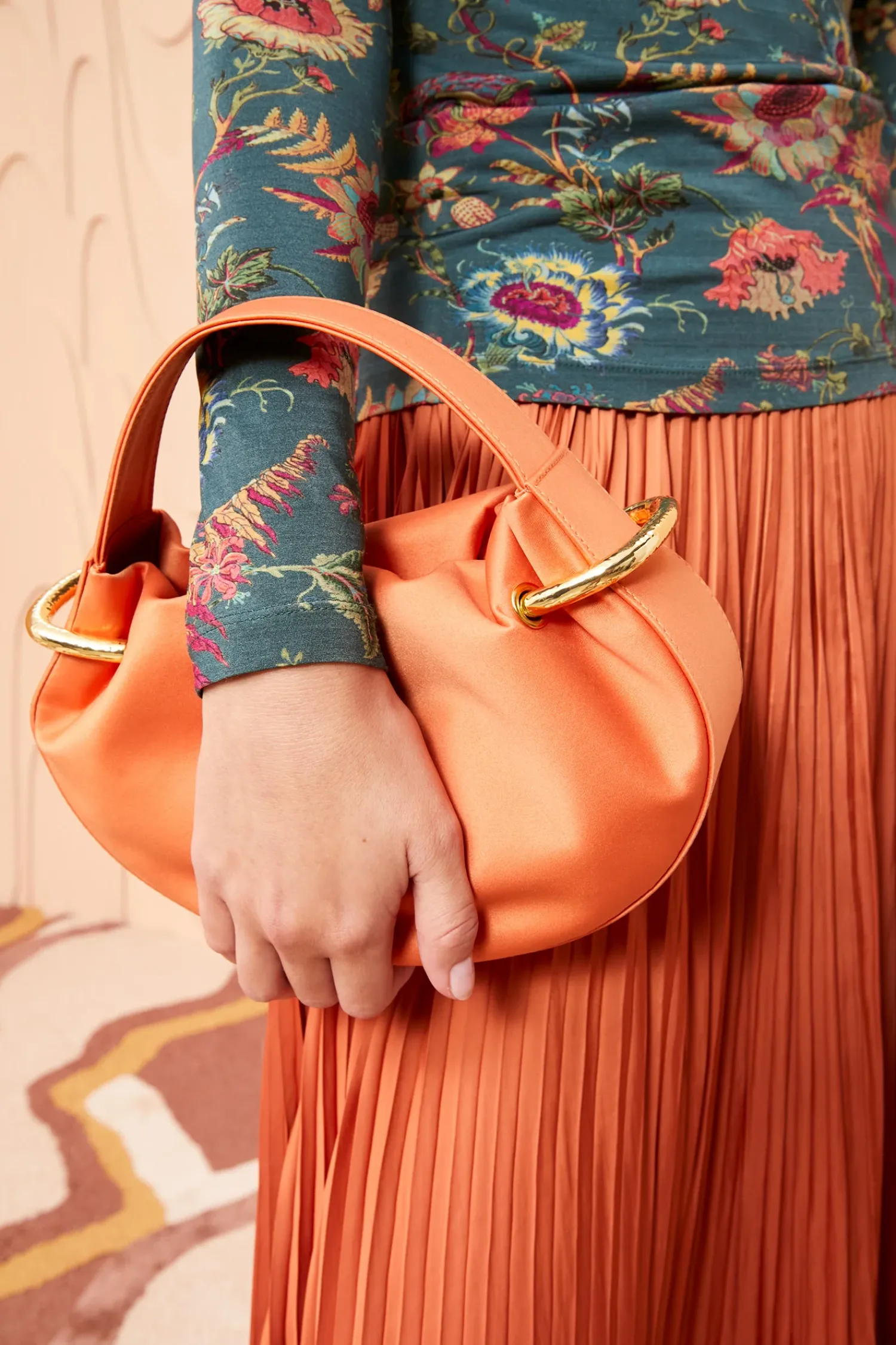 The Tilda Ruched Mini Bag Is The Newest Lovely To Join Our Handbag Lineup And Comes In A Beautifully Gathered Crescent Silhouette Made From Lustrous Orange Satin. It Has A Snug Interior Sized To Fit Your Night-Out Essentials And Features Gleaming Hardware With A Hammered Effect.