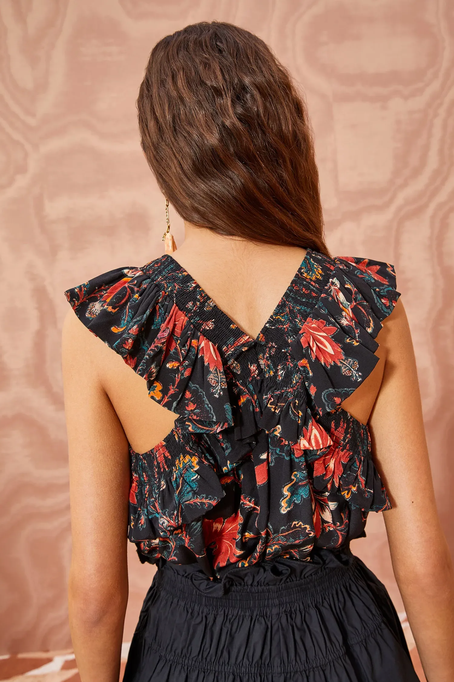 The Tulip Top Is Crafted In Our 100% Silk Crepe De Chine In A Stunning Black, Crimson And Green Floral Print. This Elegant Sleeveless Top Is A Pull-Over Style, Defined By Elastic Smocking Along The Bodice.