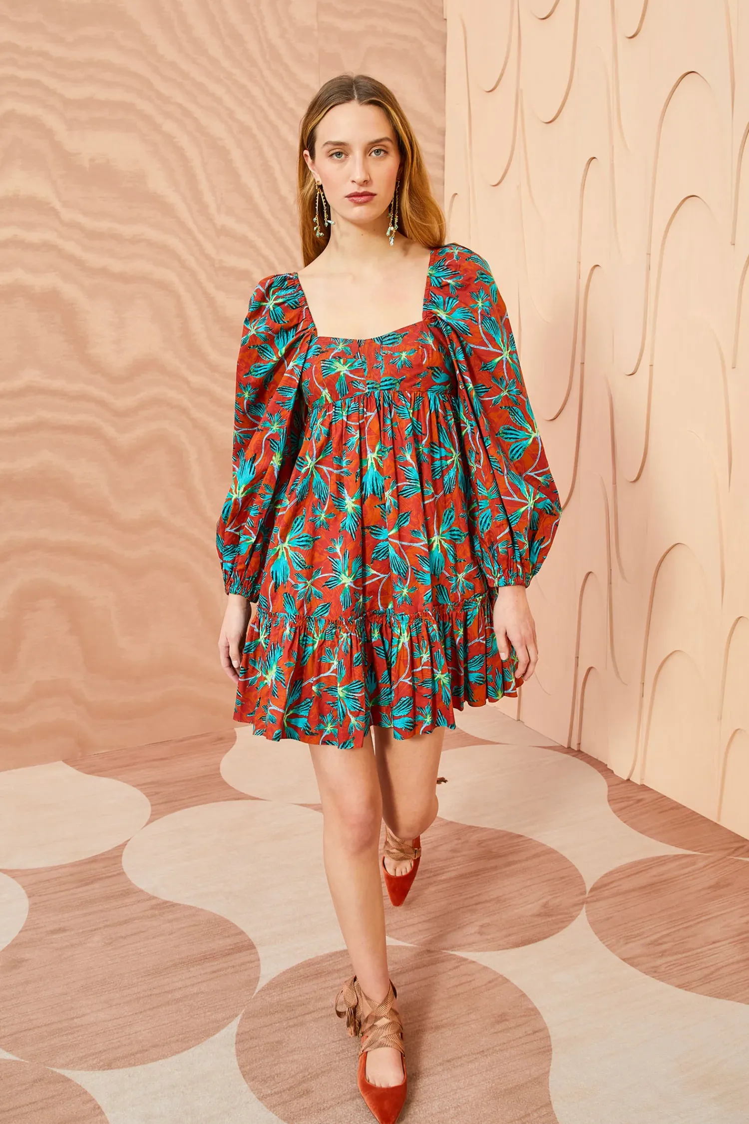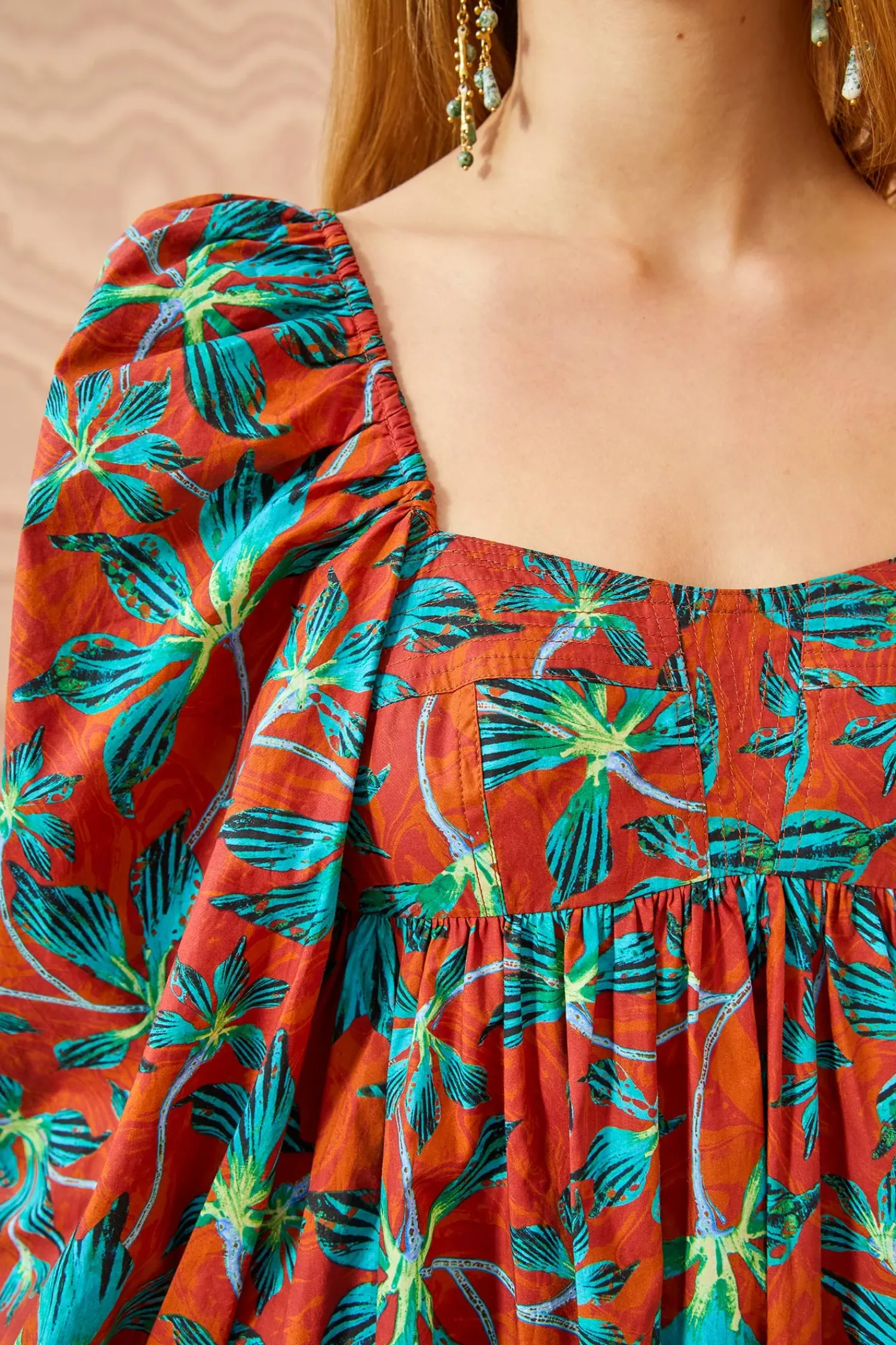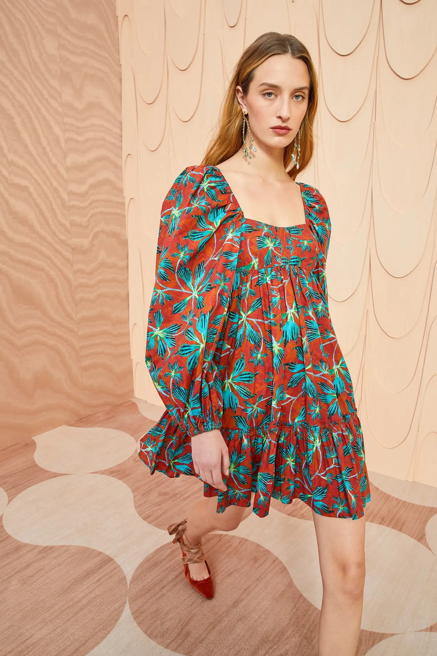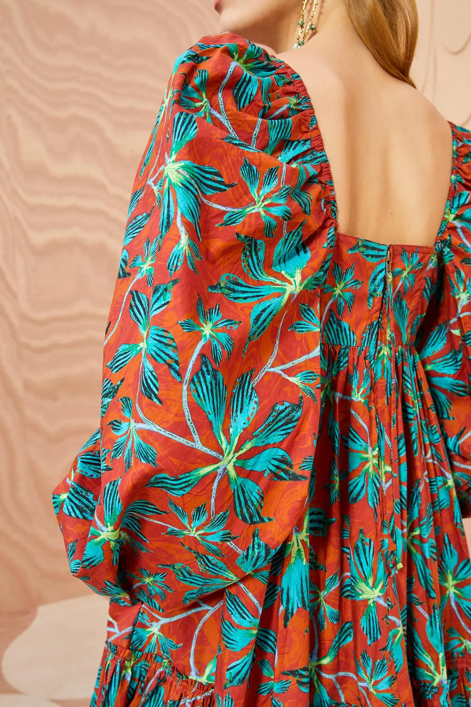 Crafted From Our Signature Cotton Poplin, The Alita Dress Boasts A Vibrant Moonflower Print With Surreal Turquoise And Lime Blooms Set Against A Swirling Background. This Mini Dress Features Voluminous Long Sleeves, An Empire Waist, Side Slit Pockets, And A Gathered Hem. It Is Finished With A Hidden Center-Back Zipper.