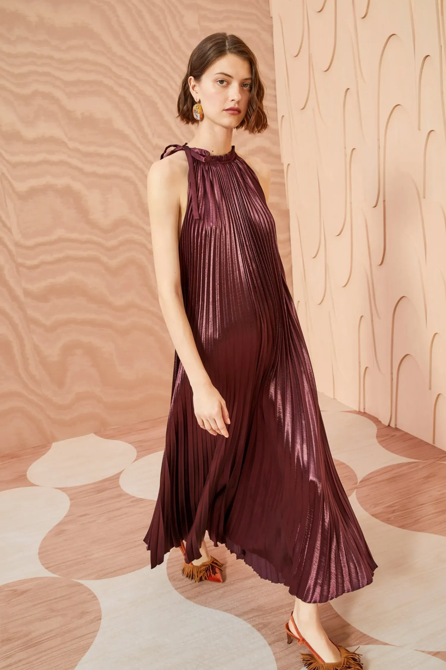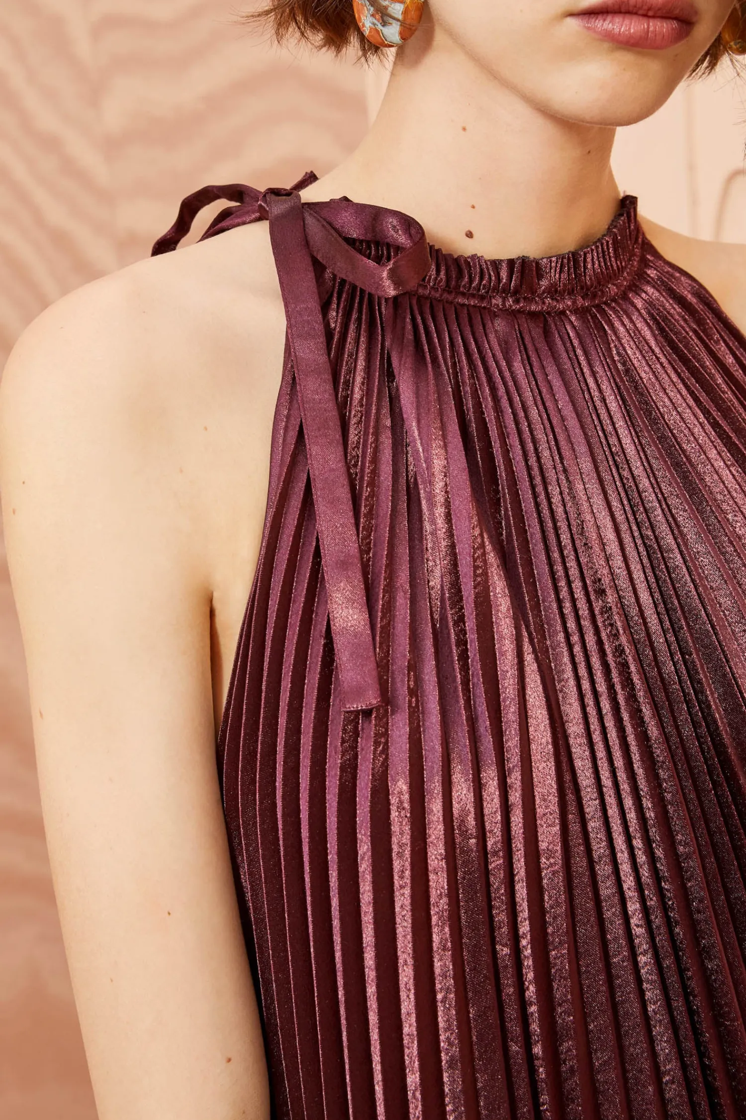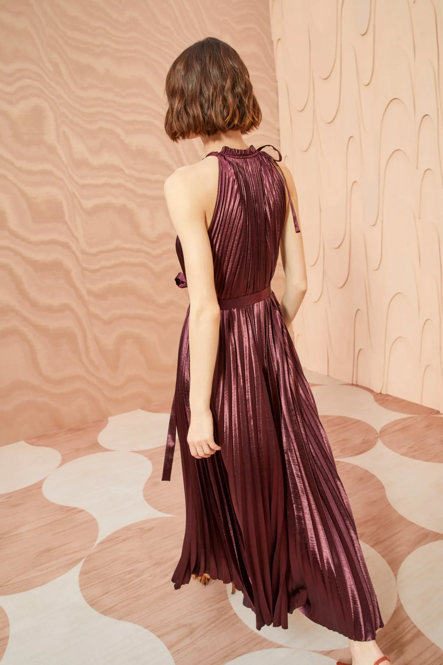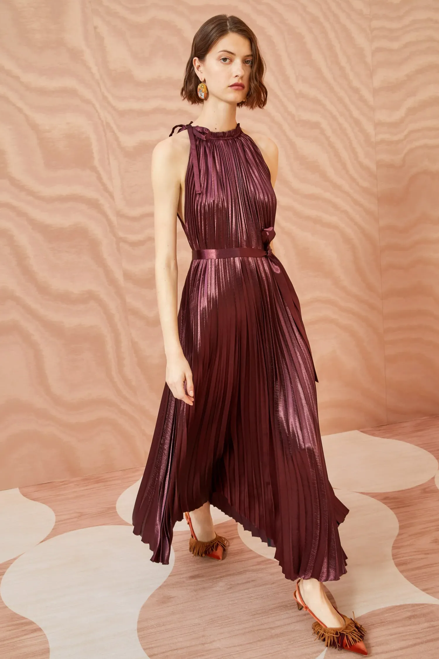 As Featured In Look 20 Of Our Autumn/Winter ’23 Runway Show, Our Amiko Dress Is Made From Lustrous Dark Red Satin That Has Been Pleated Into Delicate Ripples Which Expand And Contract With Movement. Cut In A Stunning Trapeze-Style Silhouette, This Midi-Length Dress Has An Optional Belt And Is Finished With An Asymmetric Neckline Tie Closure.
