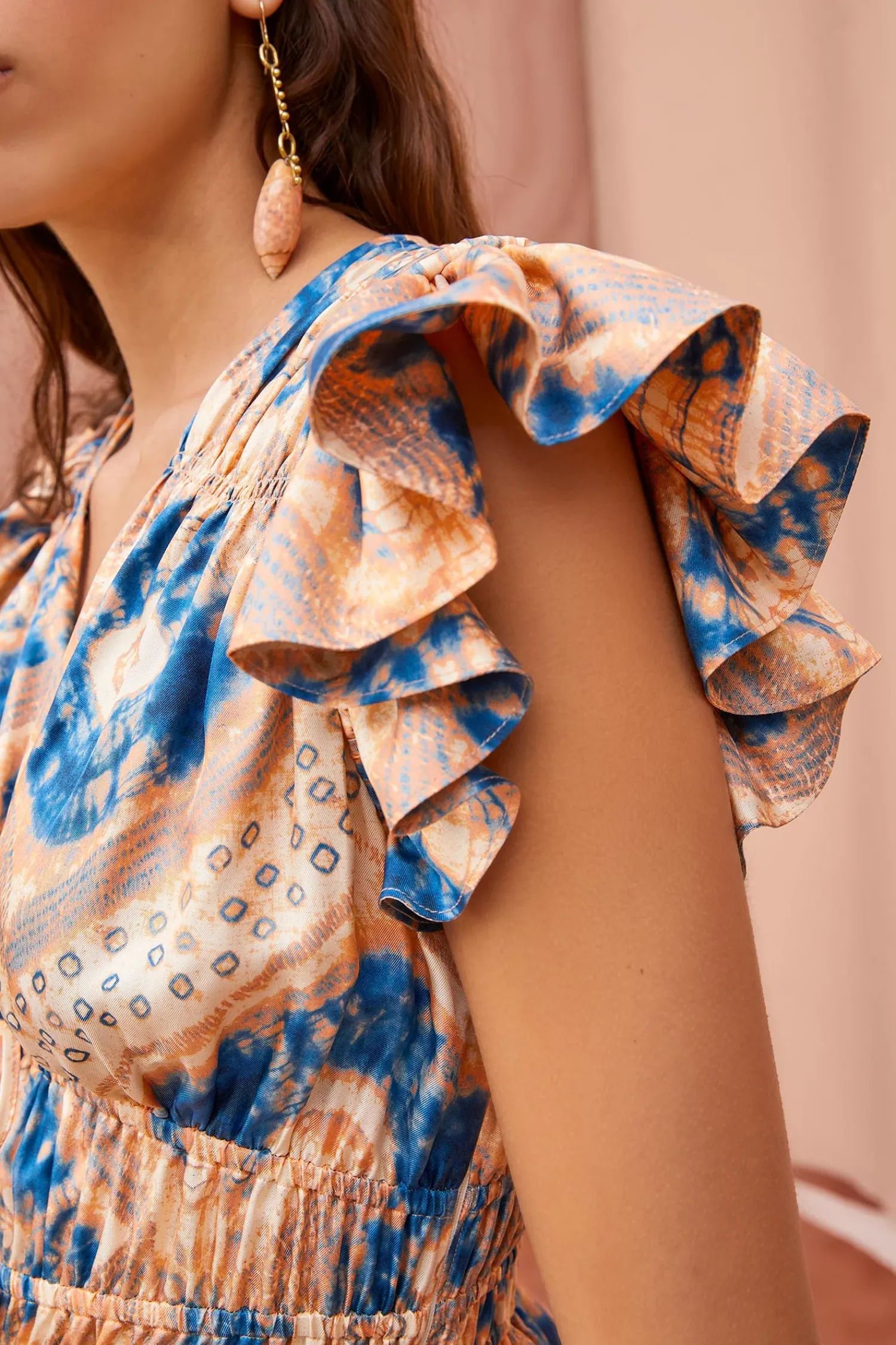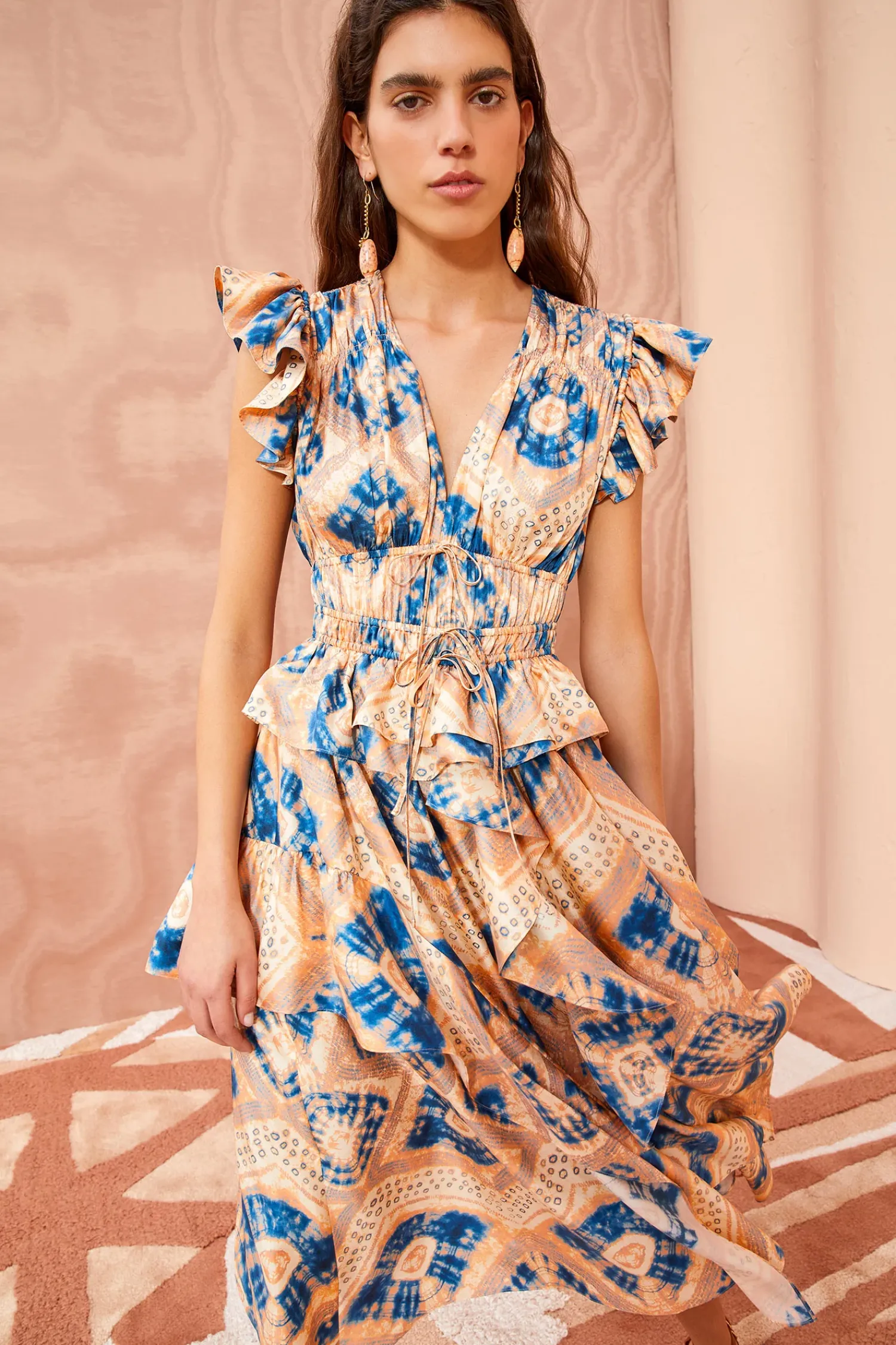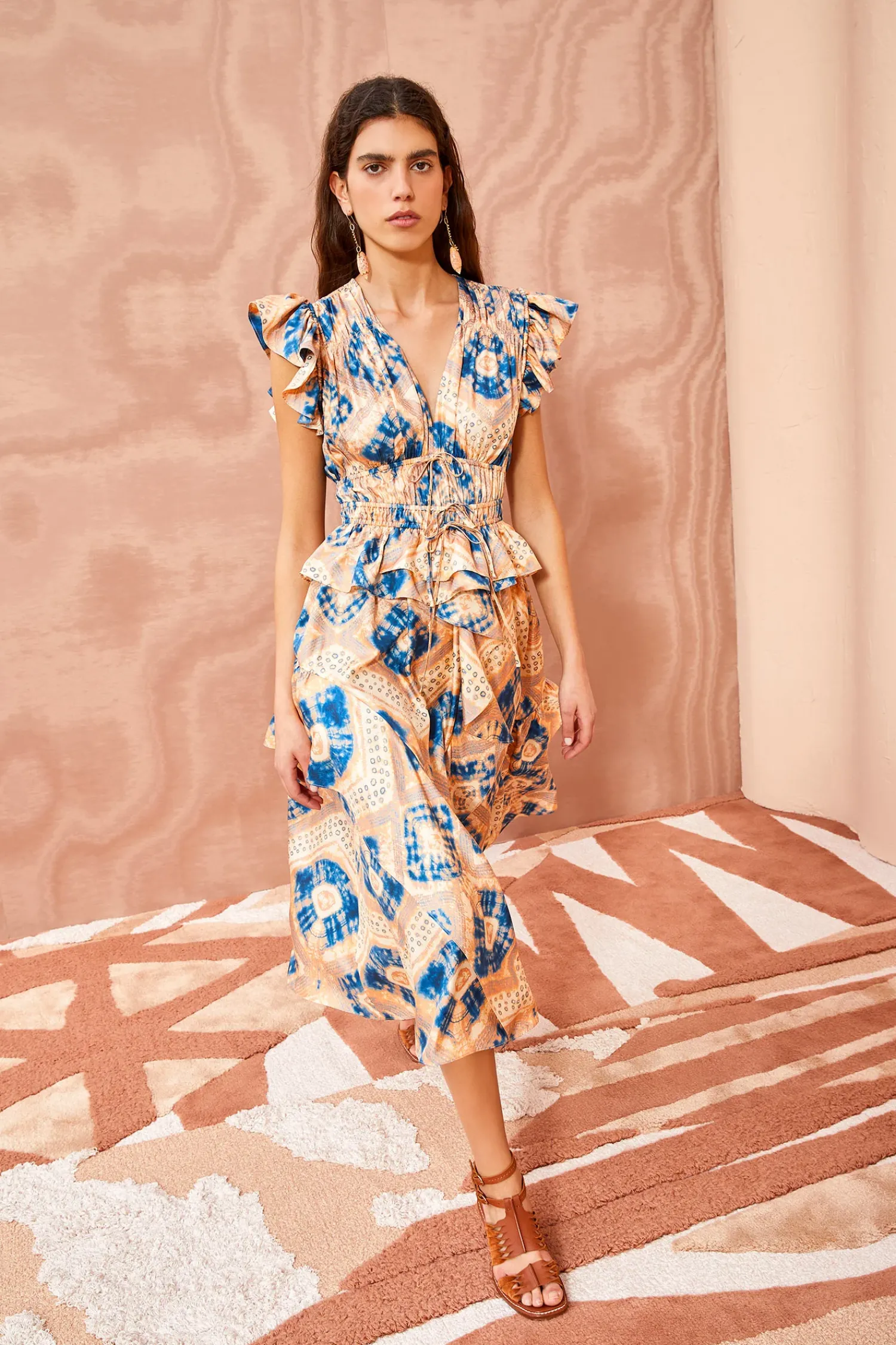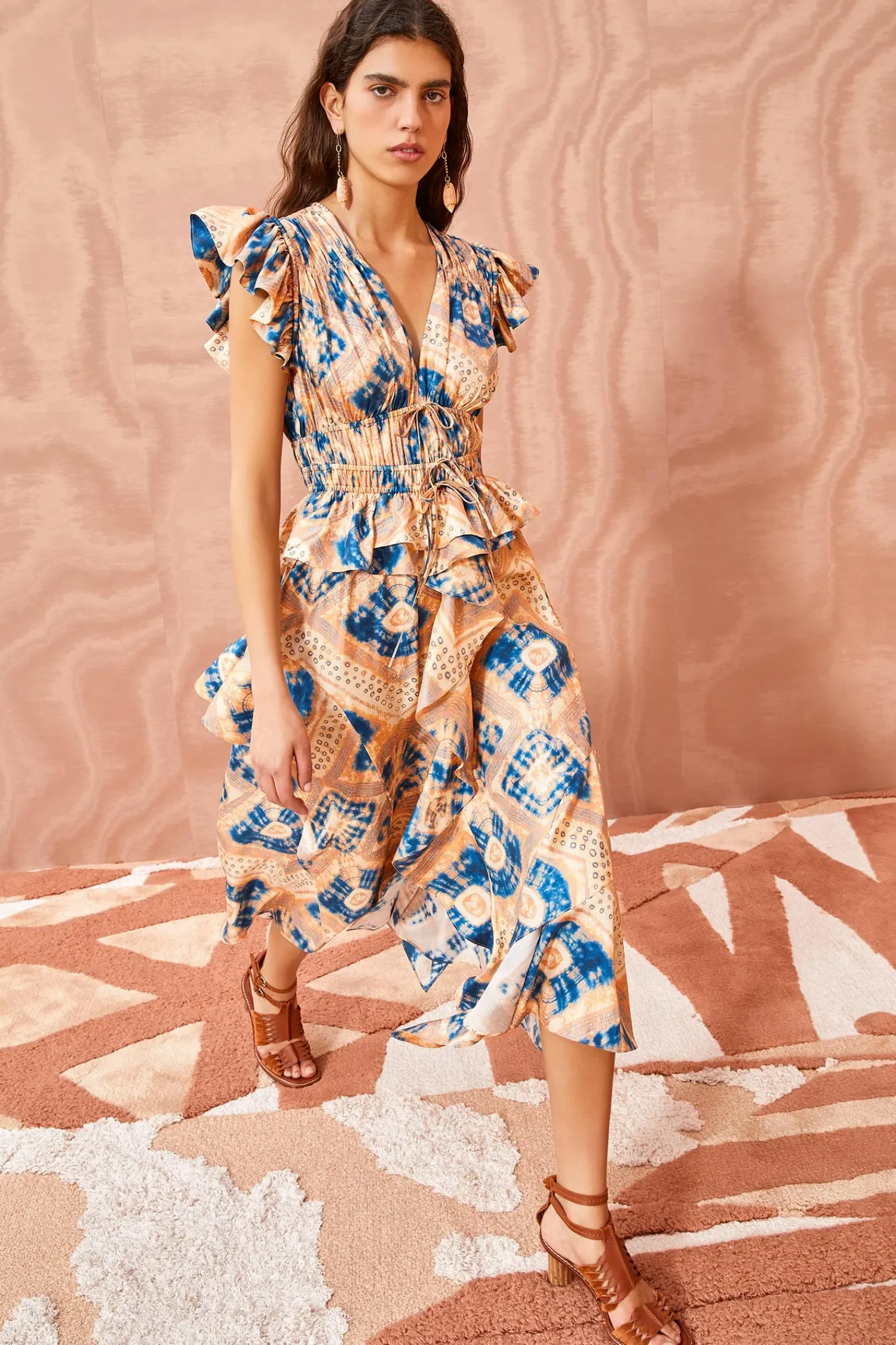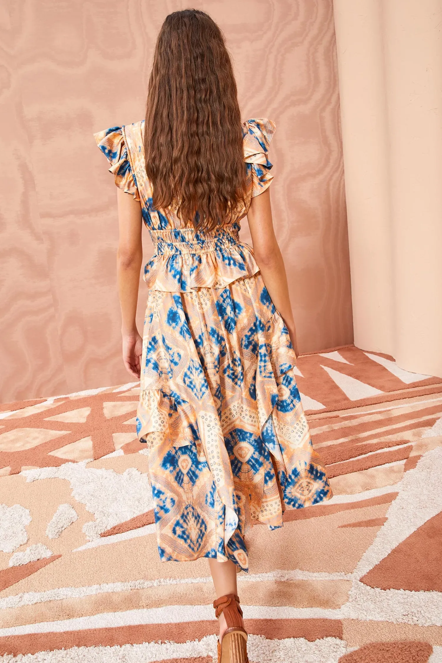 The Avia Dress Is A Striking Midi Dress That Features A Mesmerizing Diamond Shibori Motif Digitally Printed On 100% Silk Twill. This Blue And Cream Printed Dress Boasts Flutter Sleeves, A Ruched Bodice Detailed With Two Drawstrings, A Sweet Peplum Hem, And A Ruffled Skirt. It Is Finished With A Side-Seam Zipper.