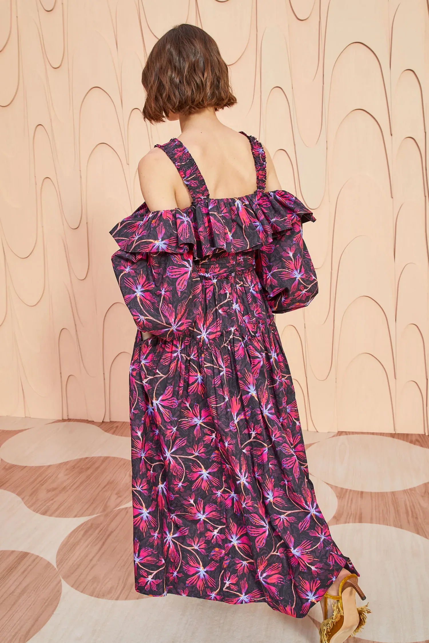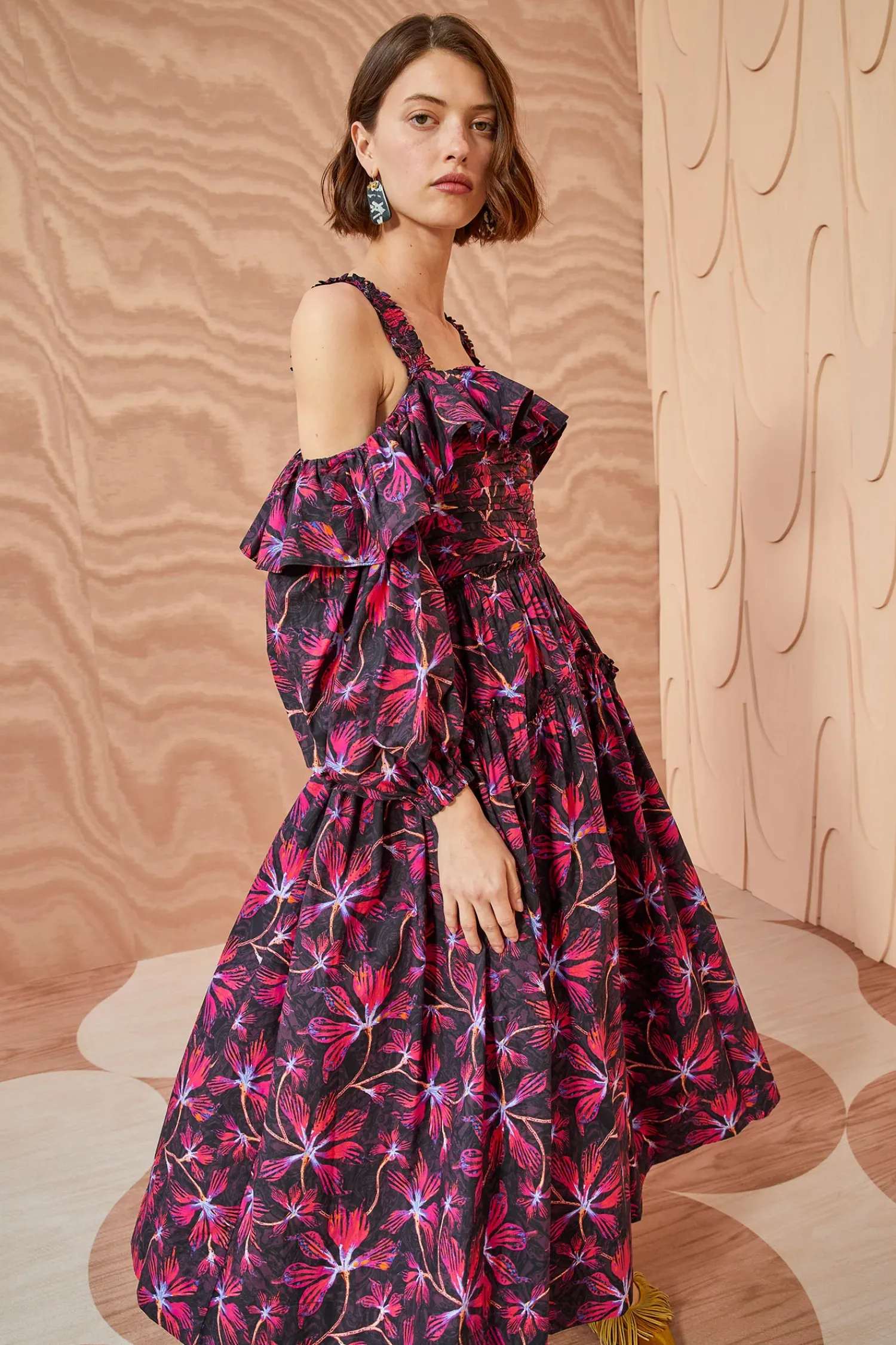 As Featured In Look 33 Of Our Autumn/Winter ’23 Lookbook, The Caprice Dress Is Cut From Our Signature Printed Poplin With Surreal Magenta And Hyacinth-Hued Blooms Against A Swirling Background. This Dress Features Bubble Hemmed Sleeves And Neckline, Wide Ruched Straps, And Muti-Arched Seams Along The Midi-Length Skirt.