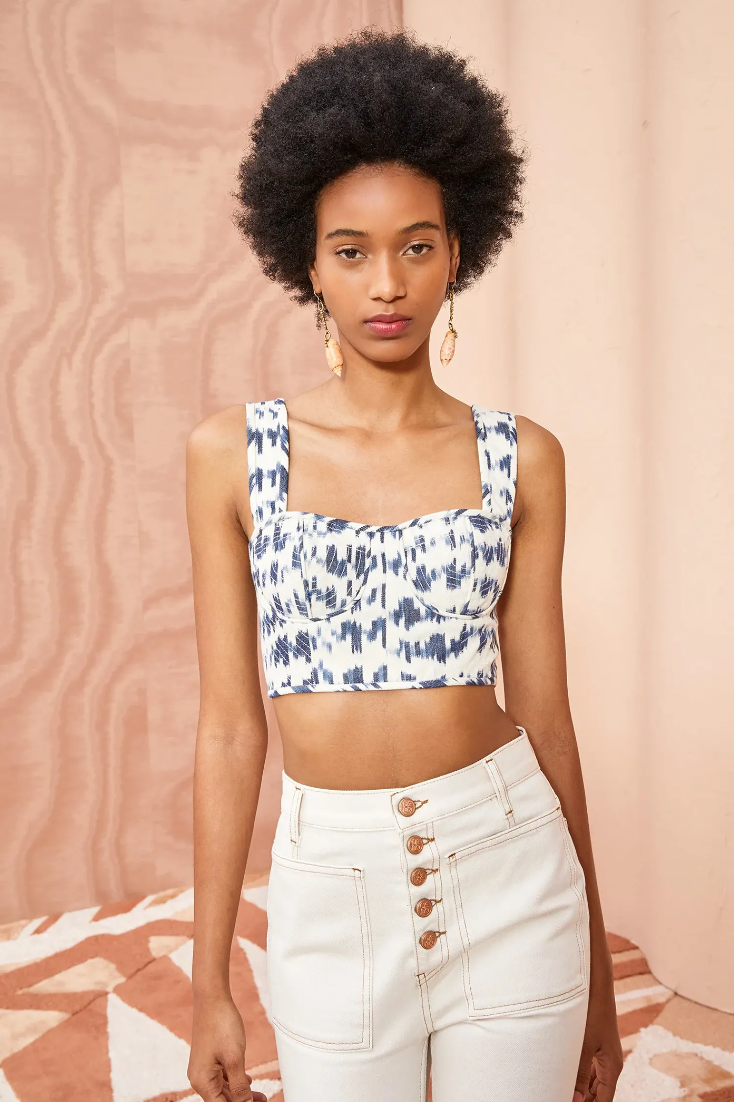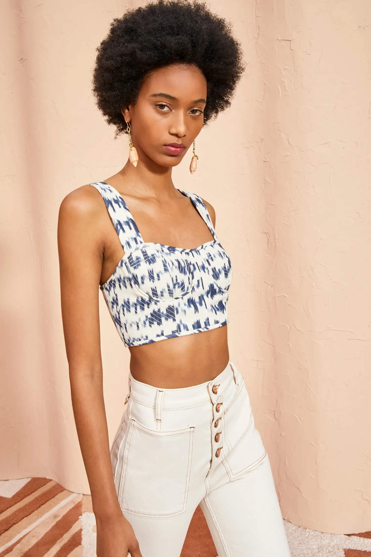 The Carisia Corset Top Is Crafted From Traditional Indian Handloomed Ikat, A Woven Textile With Individually Dyed Yarns That Create Striking Blue And White Geometries. This Cotton Crop Top Features Lightly Boned Cups, Wide Straps And A Side-Seam Zip Closure.