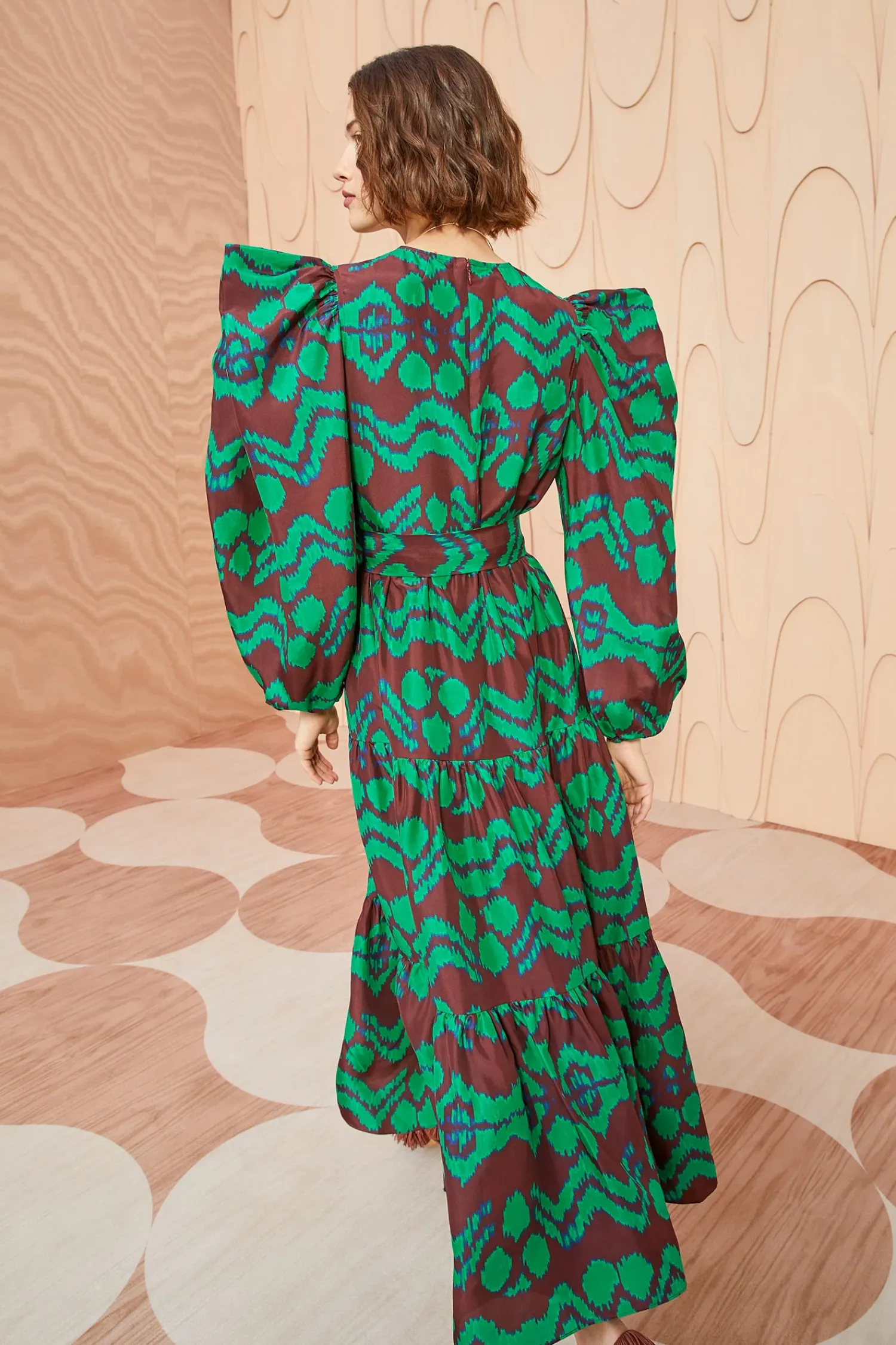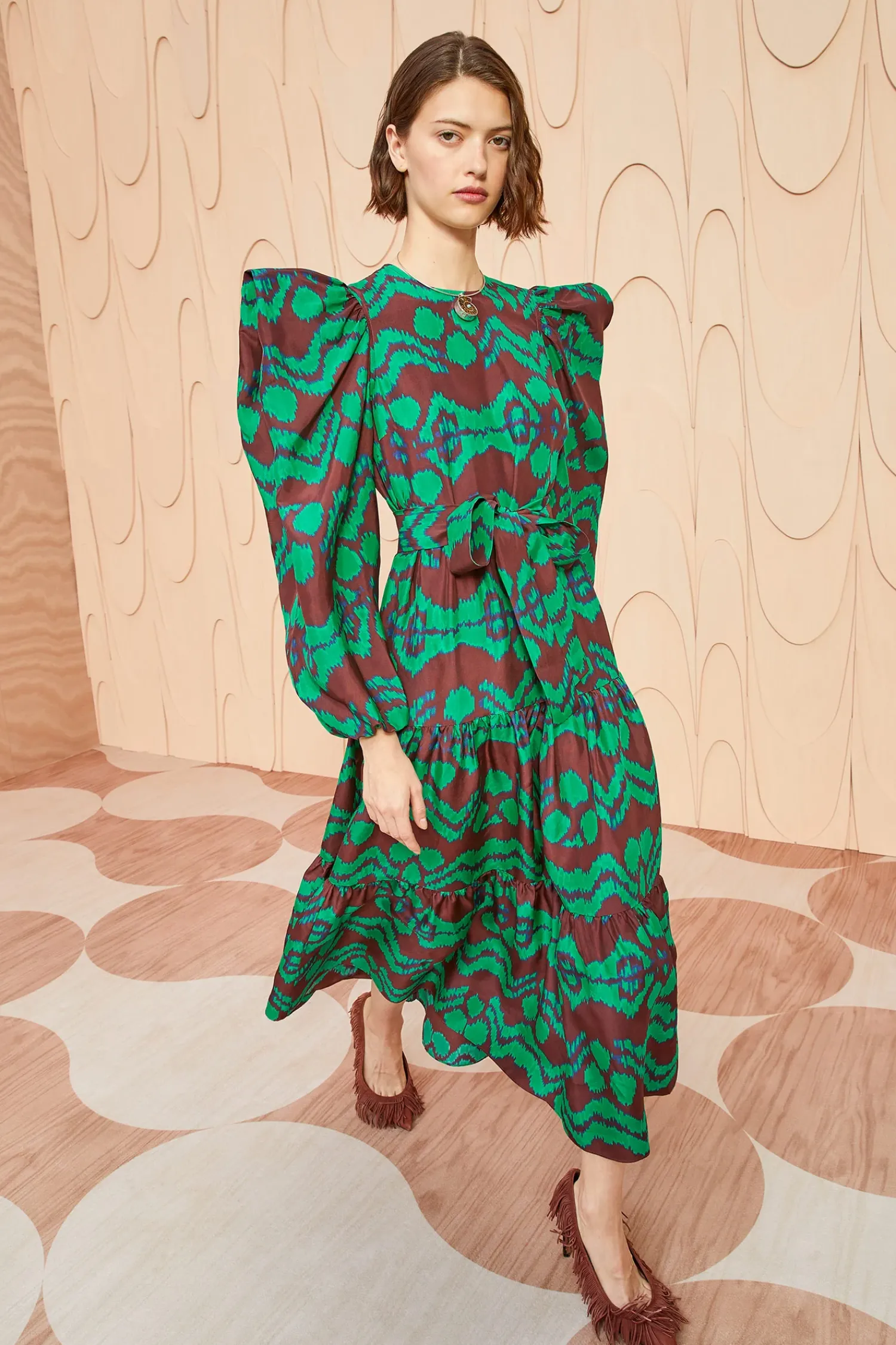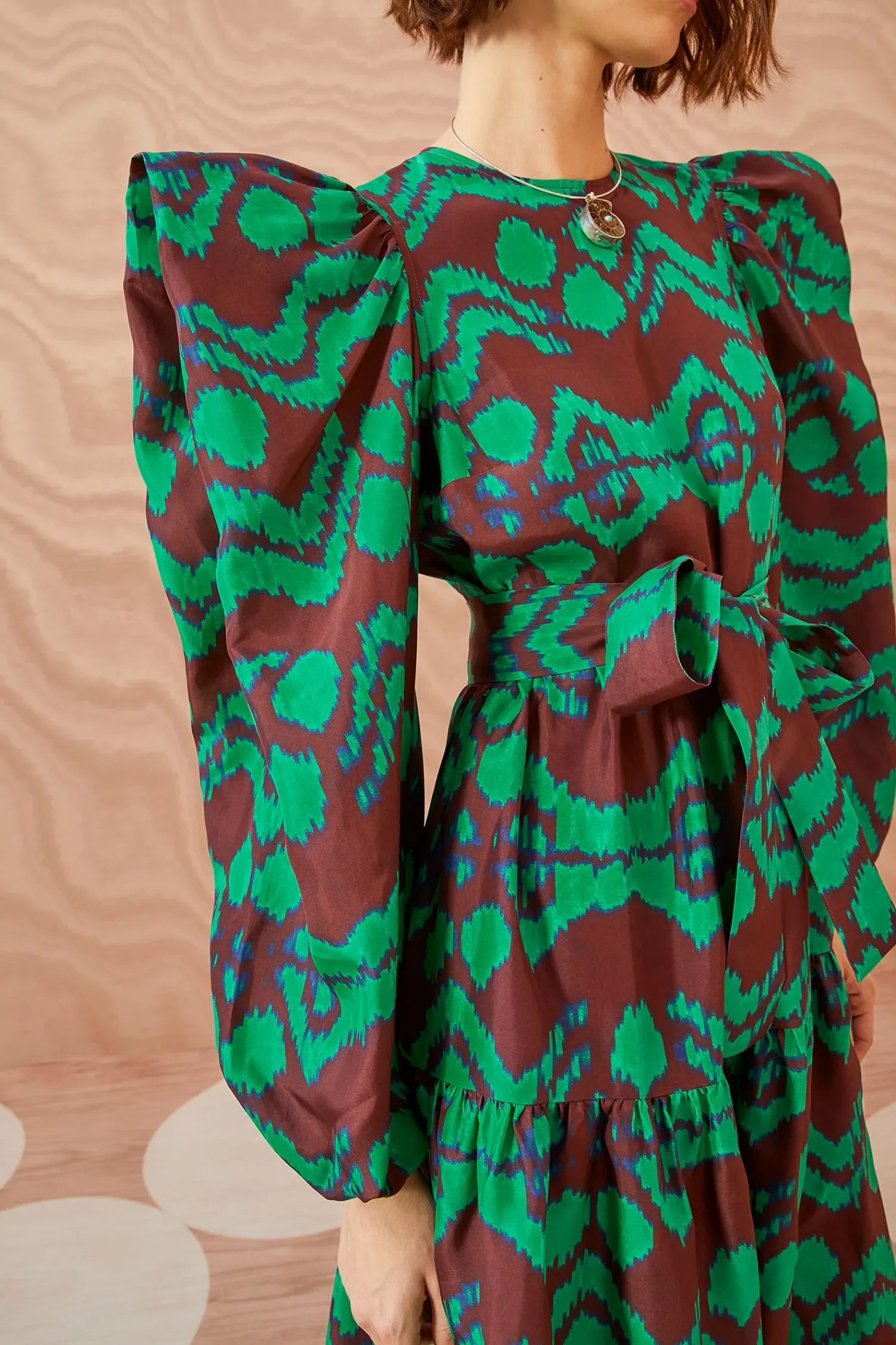 The Kasssandra Dress Is Crafted From Silky Taffeta Decorated With Our Graphic Ikat Motif In Vibrant Emerald Green And Rich Brown. This Midi-Length Dress Is Framed By Statement Puff Sleeves And Has An Optional Tie Belt To Cinch Your Silhouette. It Is Finished With A Hidden Center-Back Zipper.