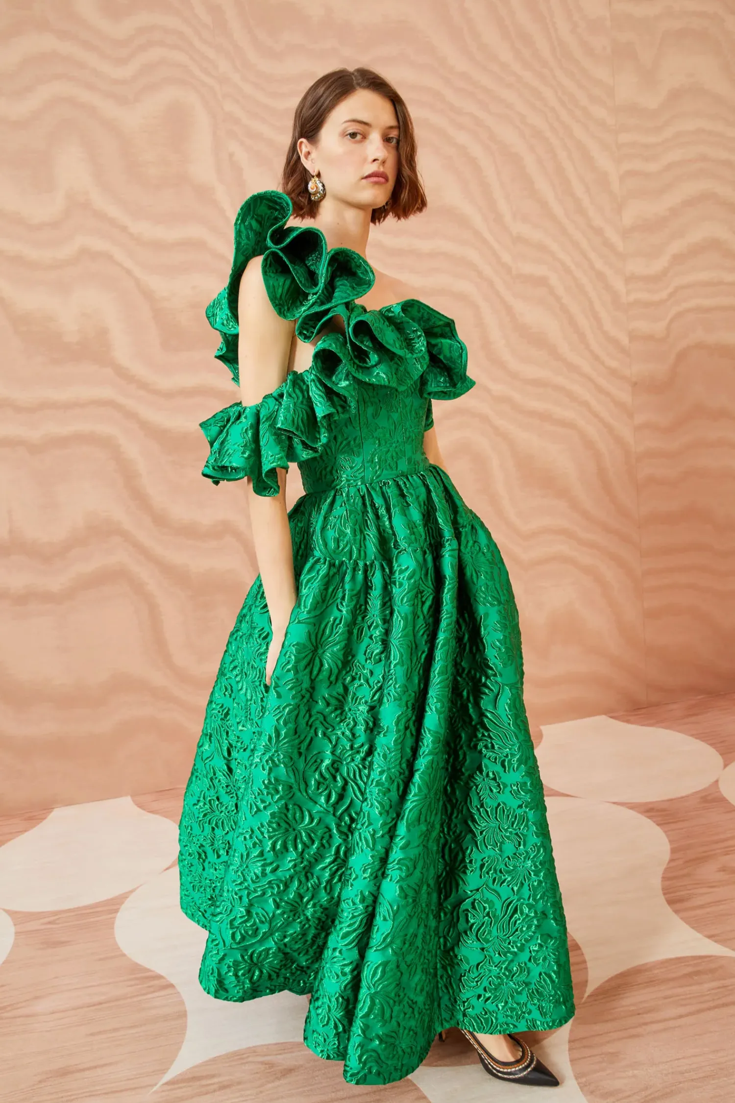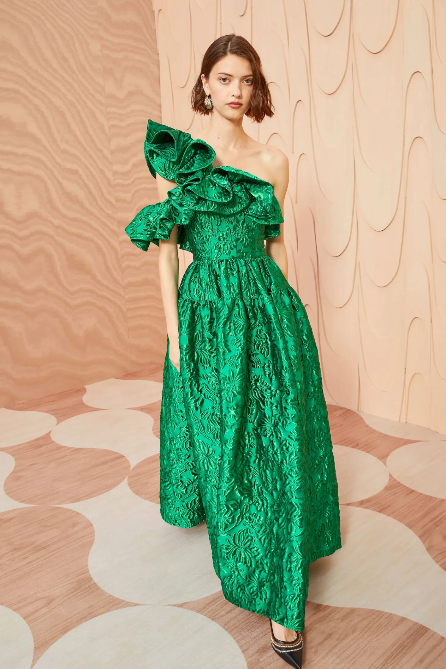 As Featured In Look 52 Of Our Autumn/Winter ’23 Runway Show, The Cosima Dress Is Made From Our Italian Lurex Cloque Jacquard Which Arrives In An Ethereal Yet Striking Monochrome Emerald Hue. This Impactful Ballgown Features Light Boning Within The Bodice, A Full Gathered Skirt, And Is Adorned With Architectural Ruffles Along The One-Shoulder Silhouette. It Is Finished With A Hidden Side-Seam Zipper.