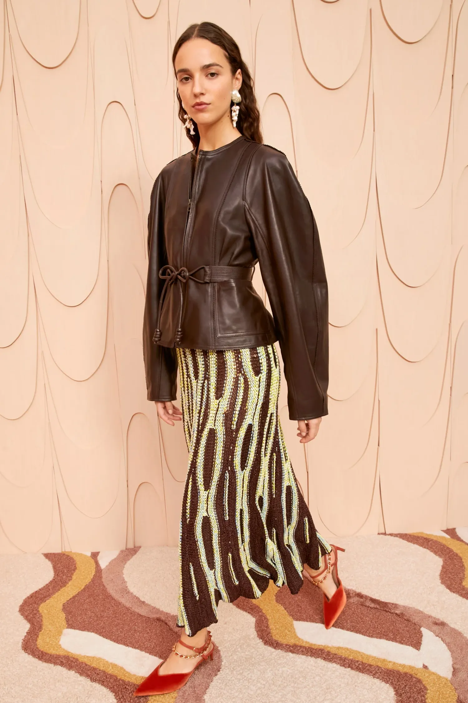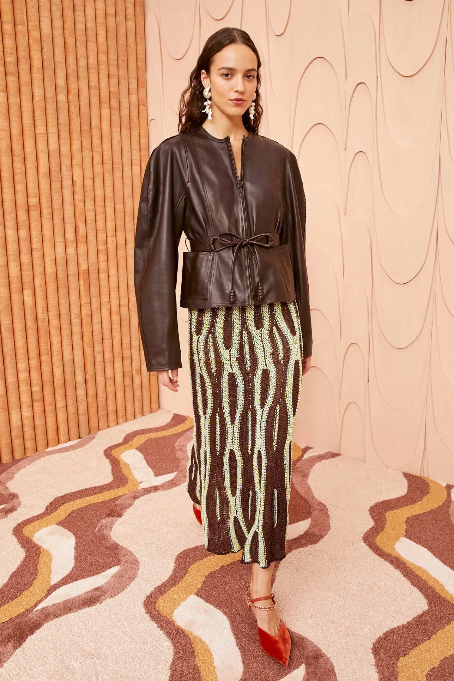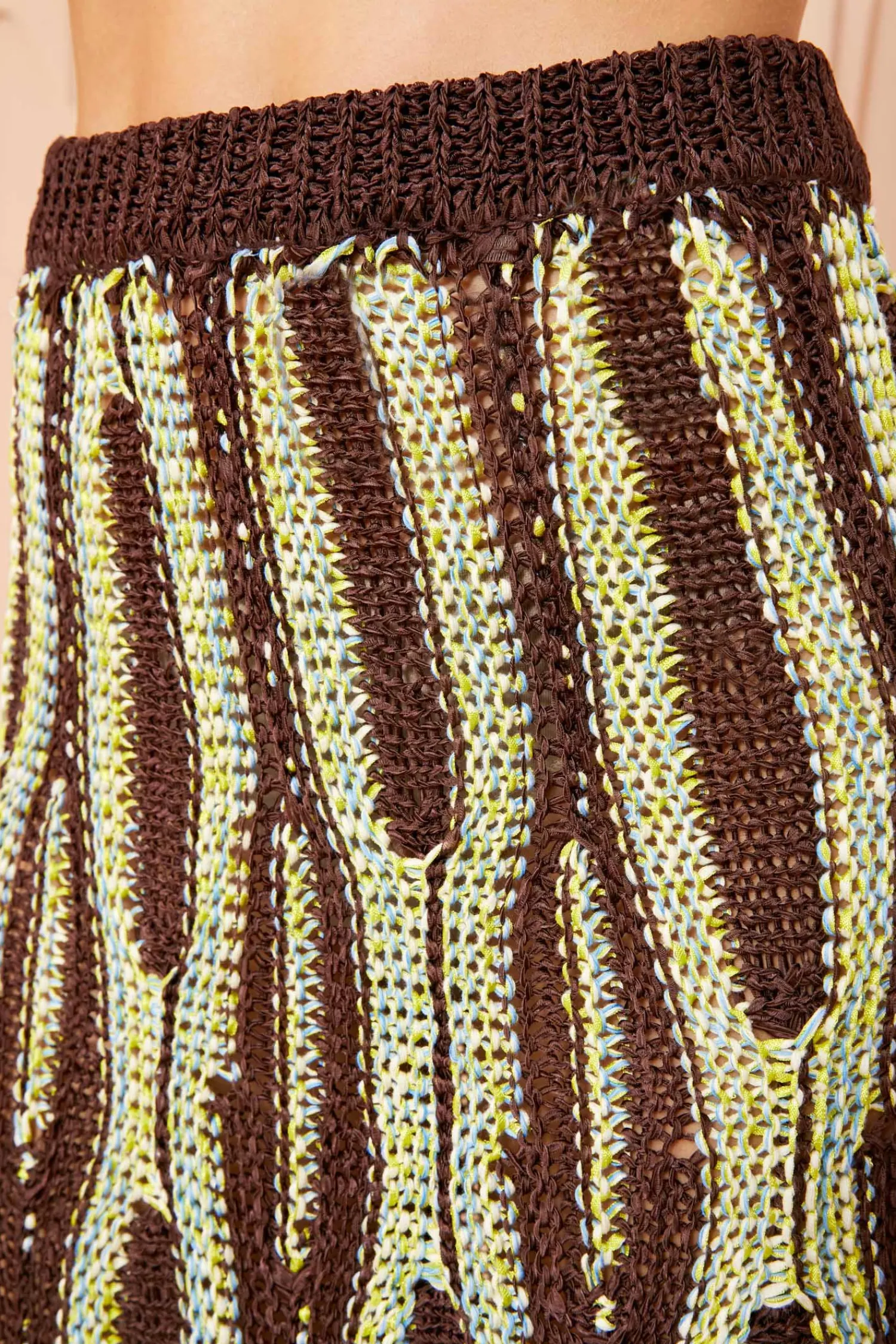 A Best-Loved Silhouette From Previous Seasons, Our Elara Skirt Is A Three-Dimensional Knit Created Using A Tuck Stitch Technique. This Brown, Green, And Blue Style Features A Ribbed Waistband And Unfurls To A Midi-Length Hem.