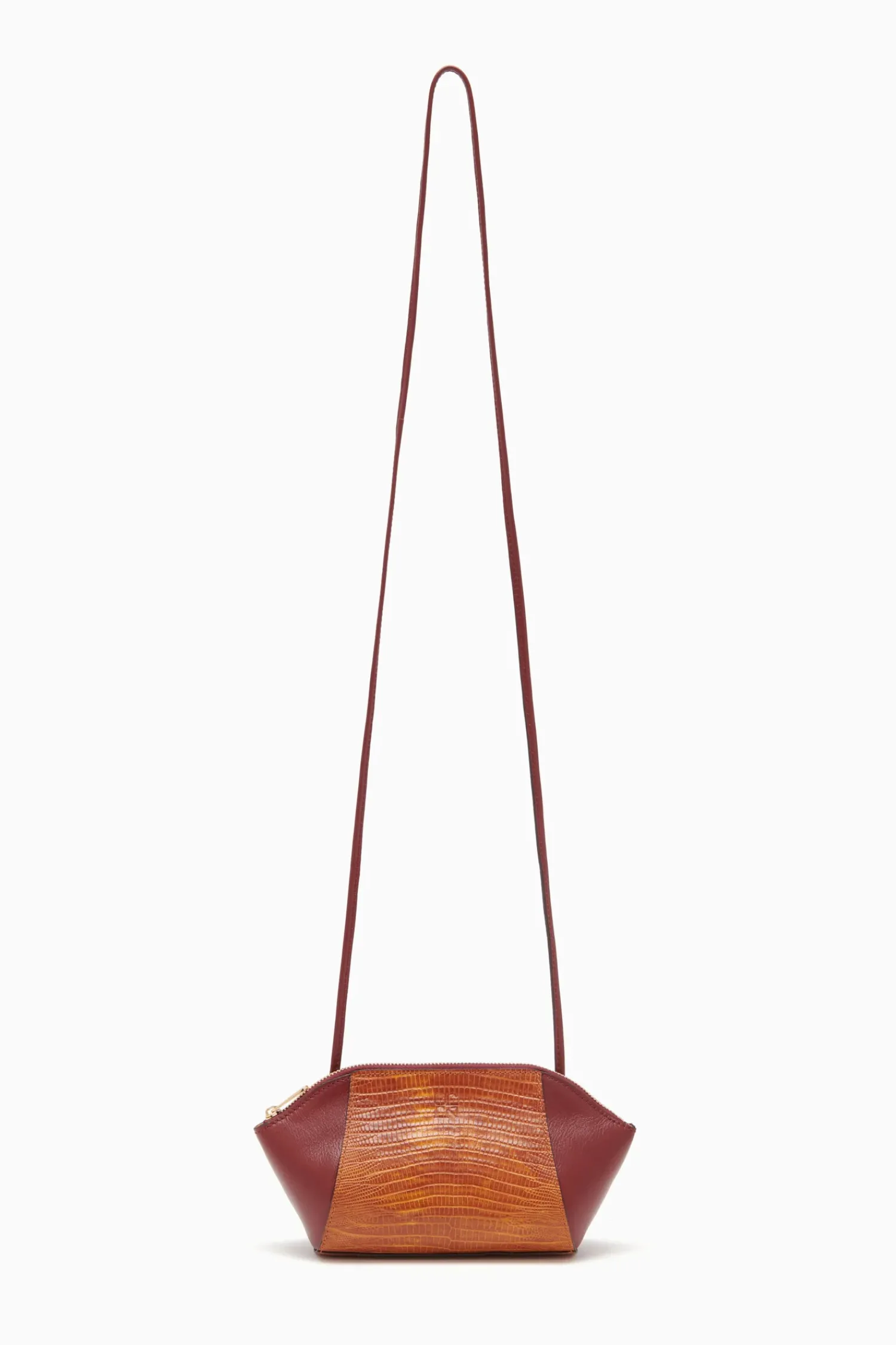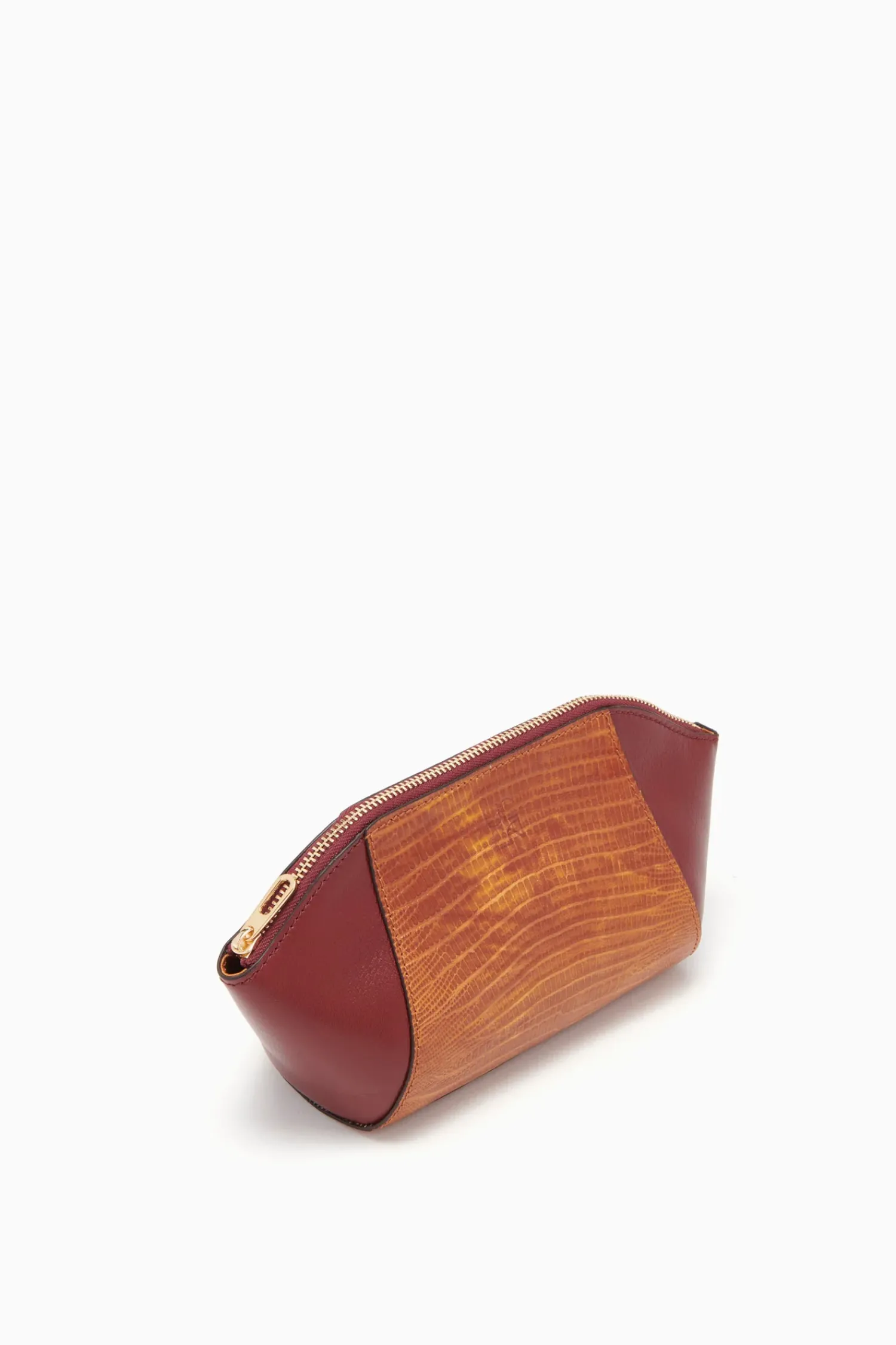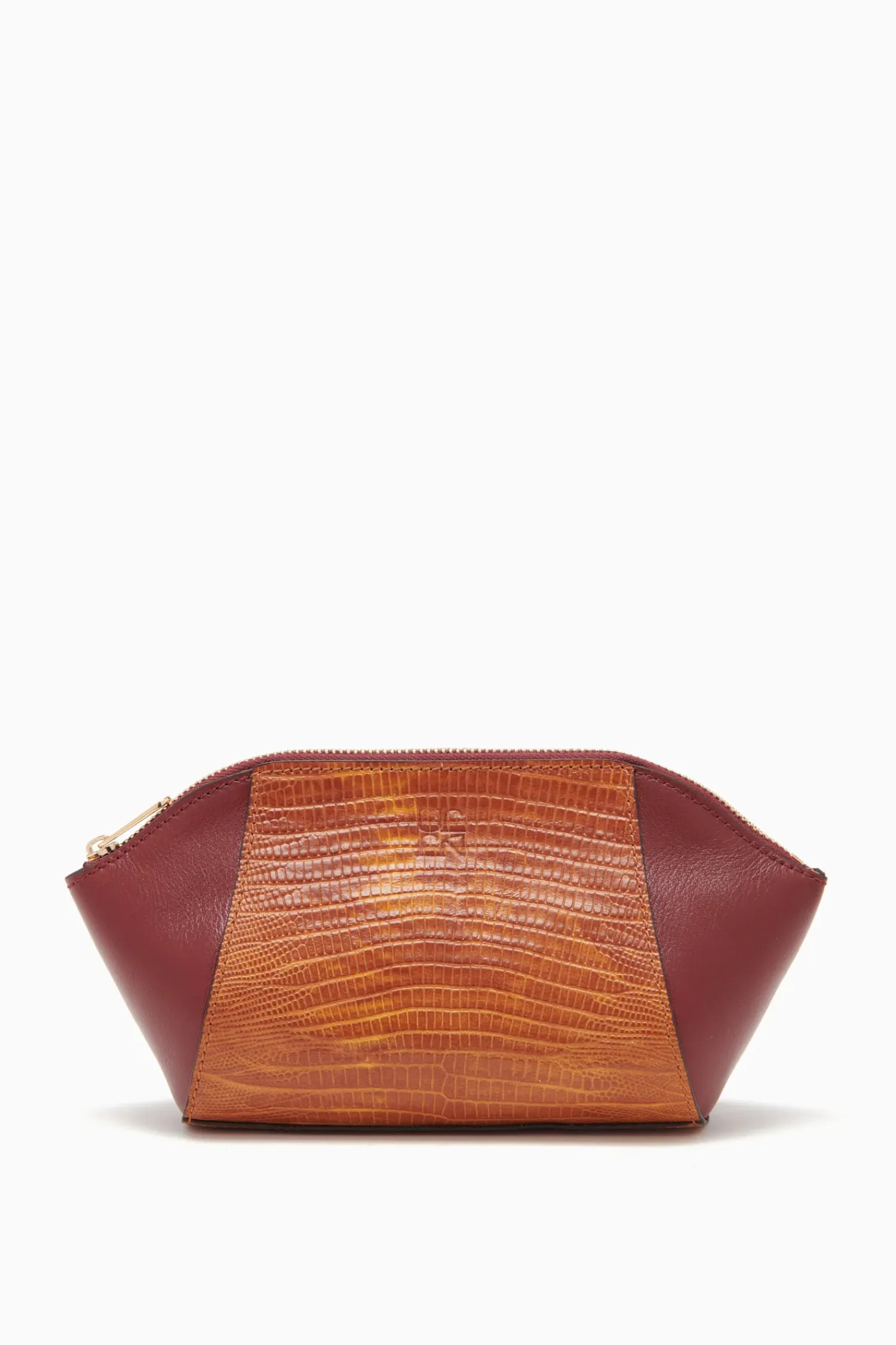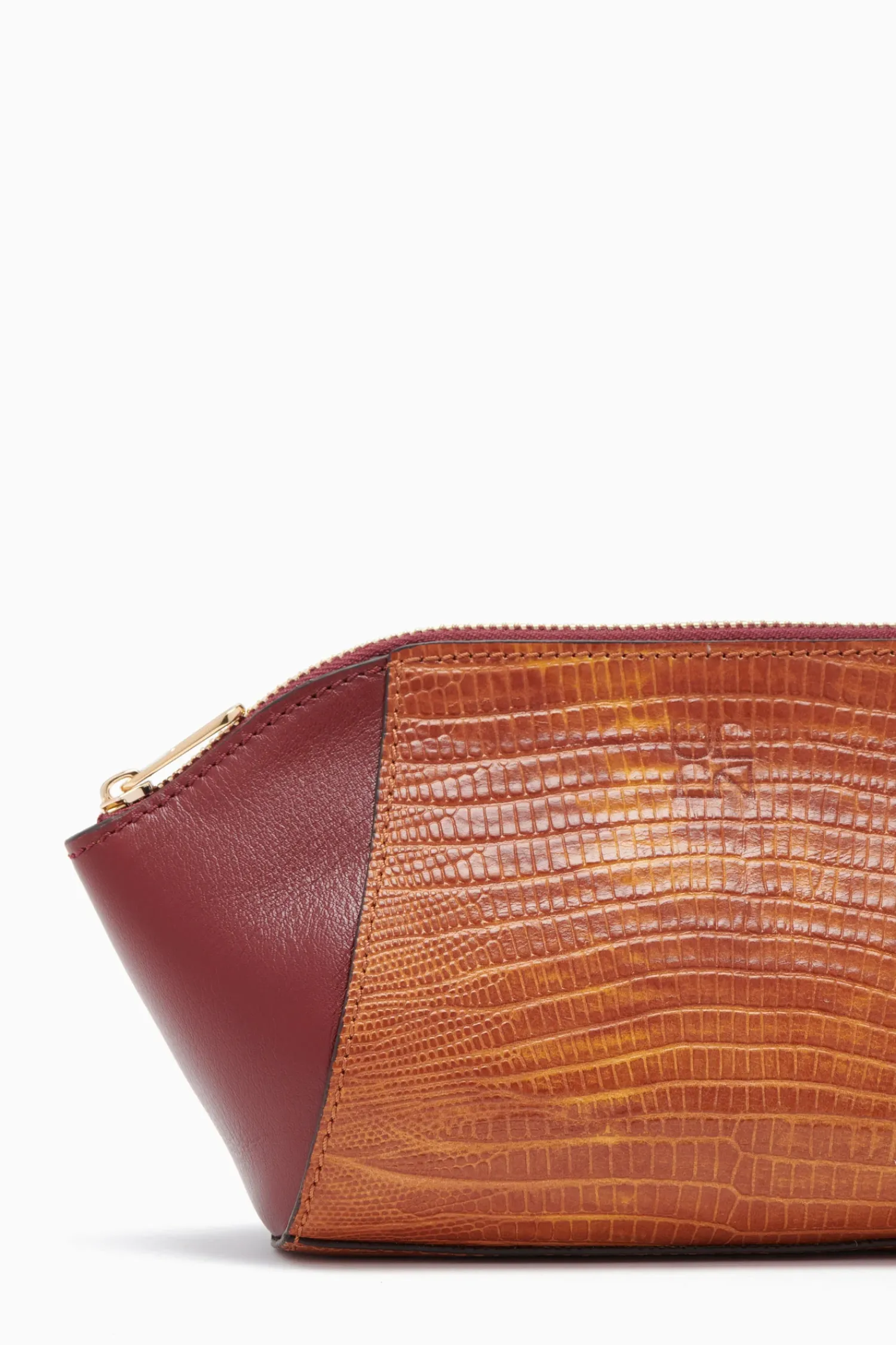The Imogen Large Makeup Pouch Is Crafted From Sumptuous Lizard-Embossed And Smooth Leather. This Elegant Brown And Red Silhouette Features A Removable And Adjustable Strap That Attaches At The Back. It Is Finished With A Gleaming Brass Zipper Closure.