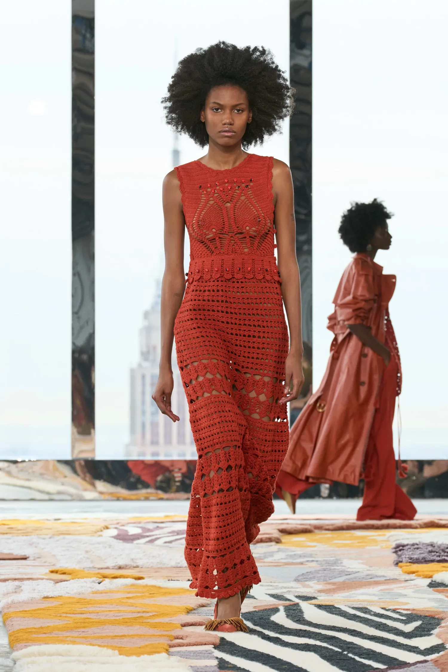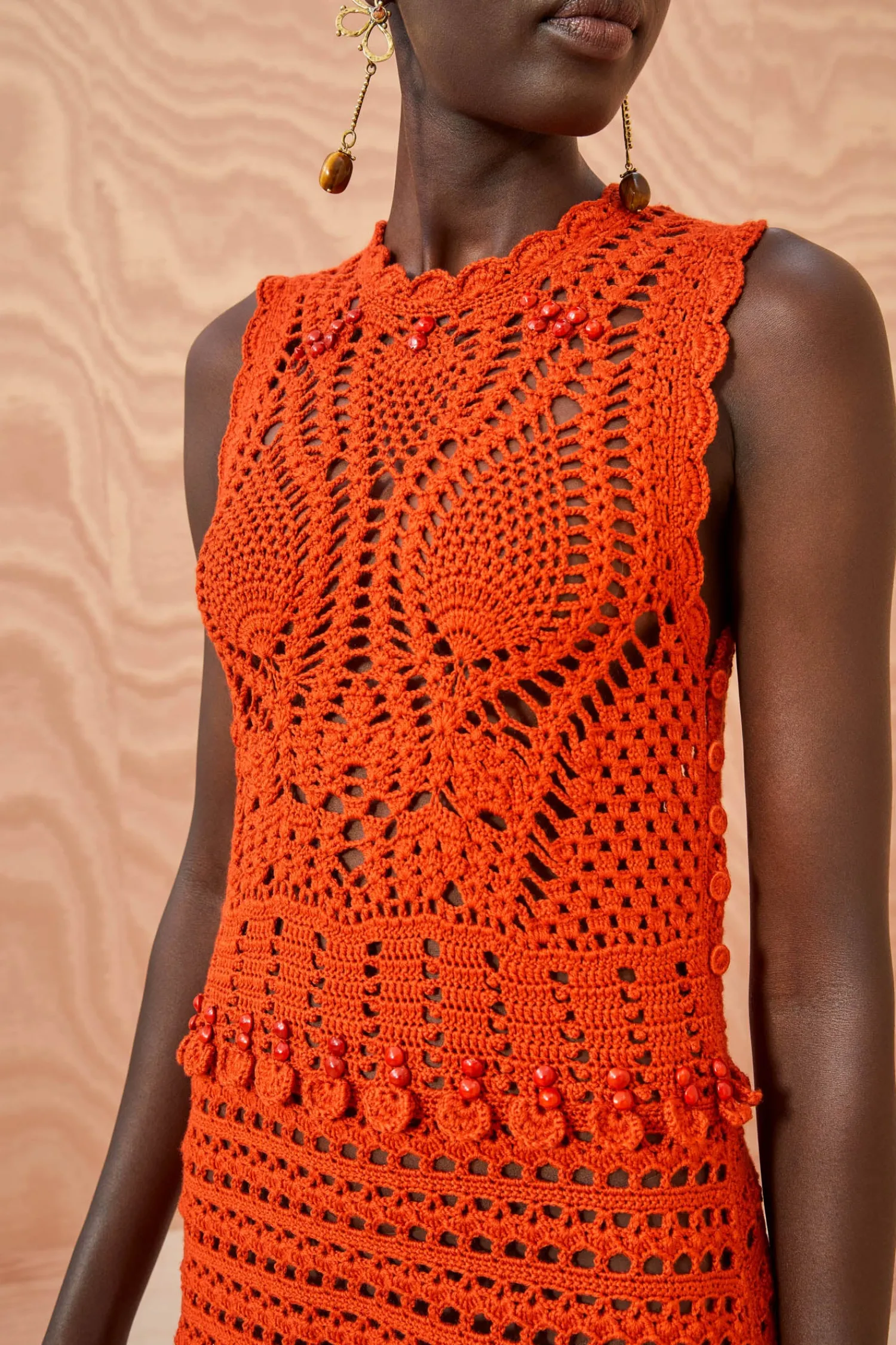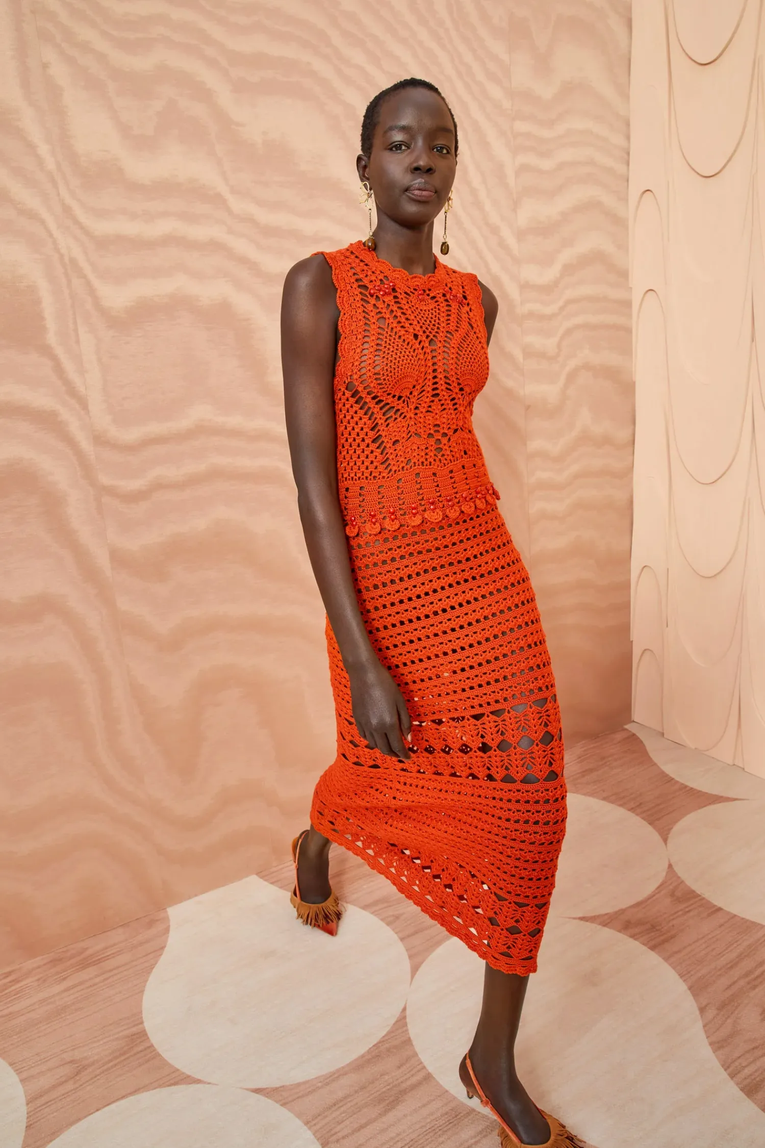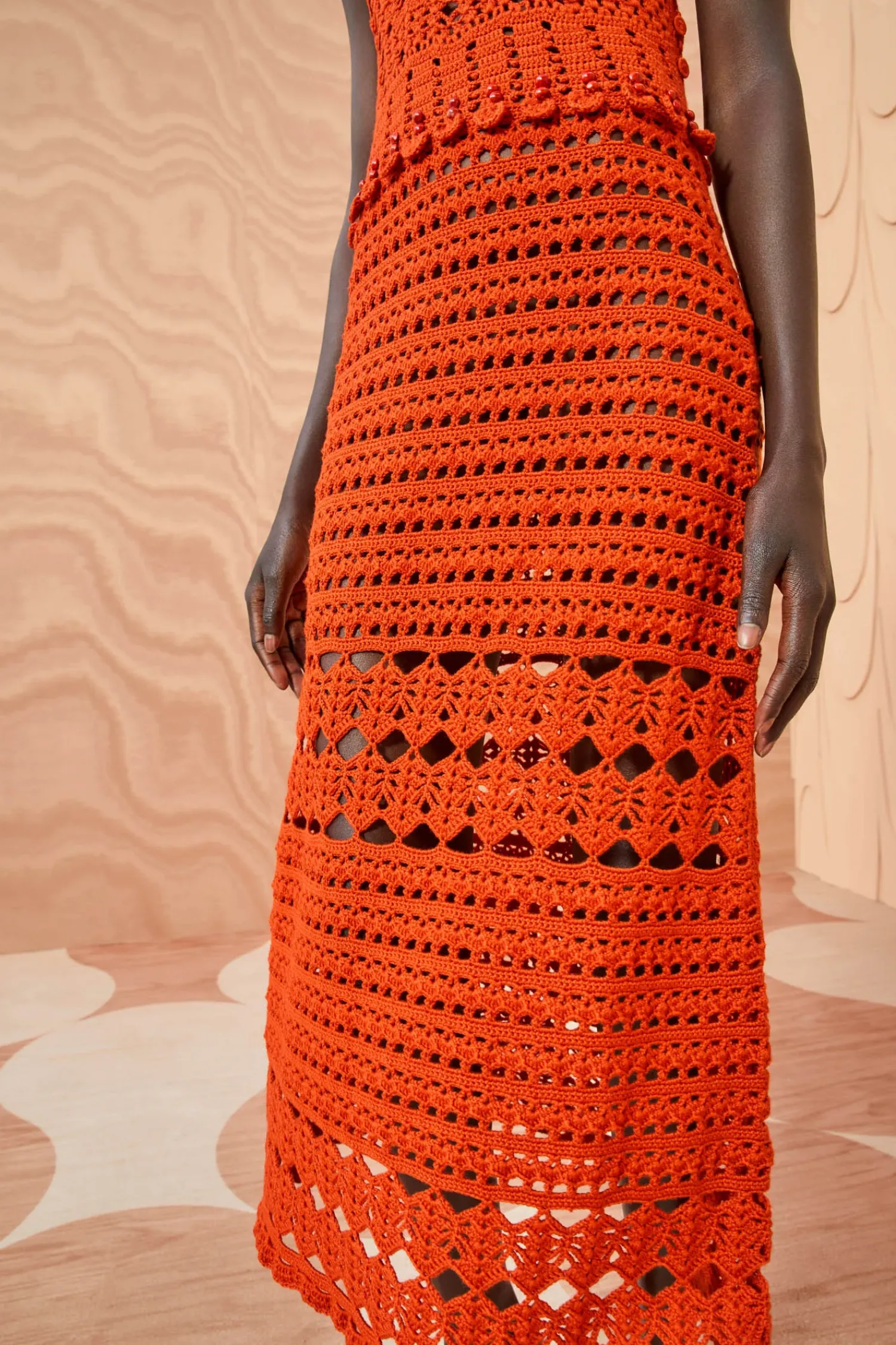 As Featured In Look 10 Of Our Autumn/Winter ’23 Lookbook, The Innika Dress Is Made From Italian-Spun Merino Wool That Is Hand-Crocheted Into Lattice-Like Stitches, Alternating Patterns Along Its Length. This Sleeveless Column Dress Is A Gorgeous Earthy Orange And Is Adorned With Small Wooden Beads.