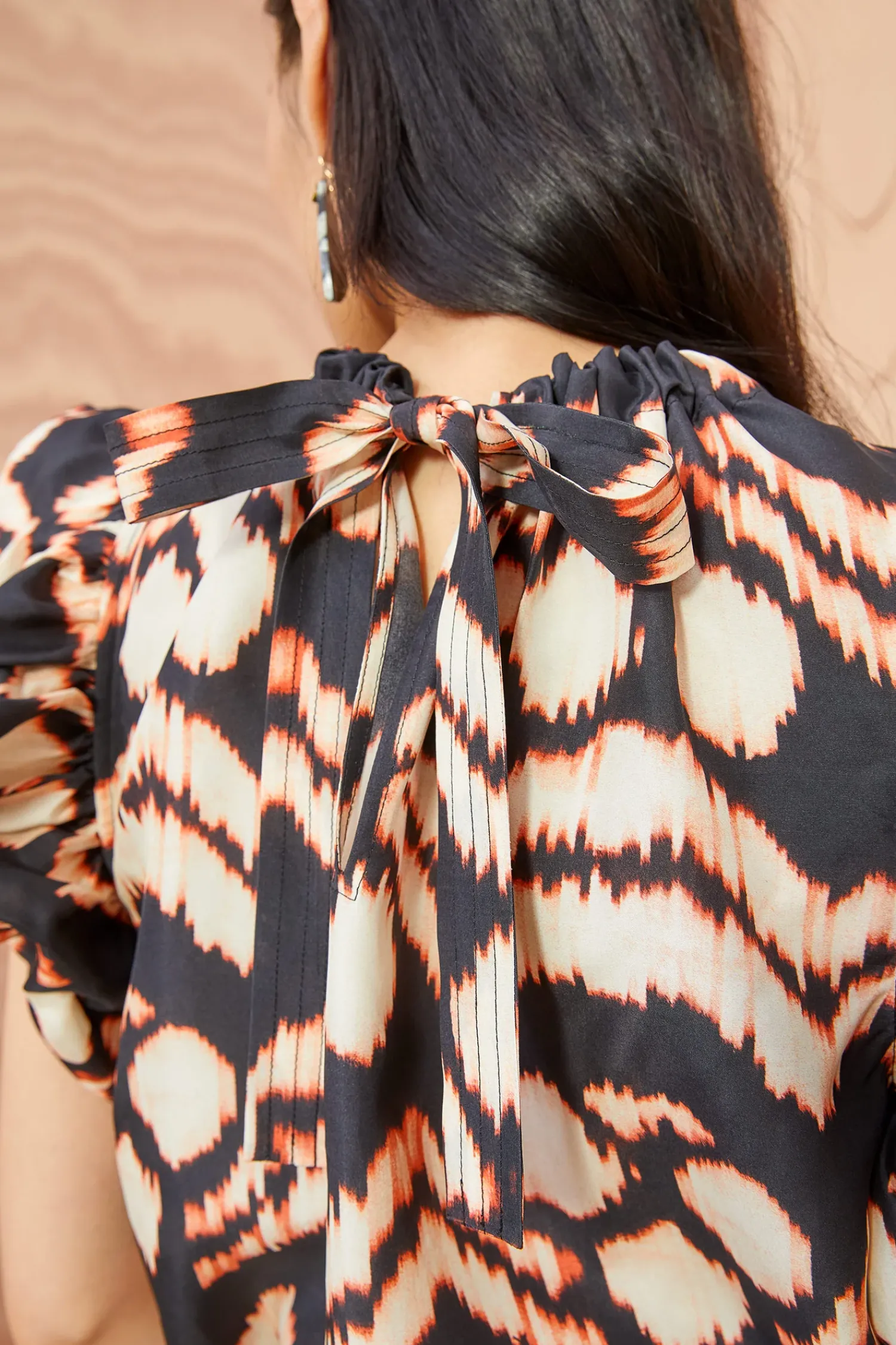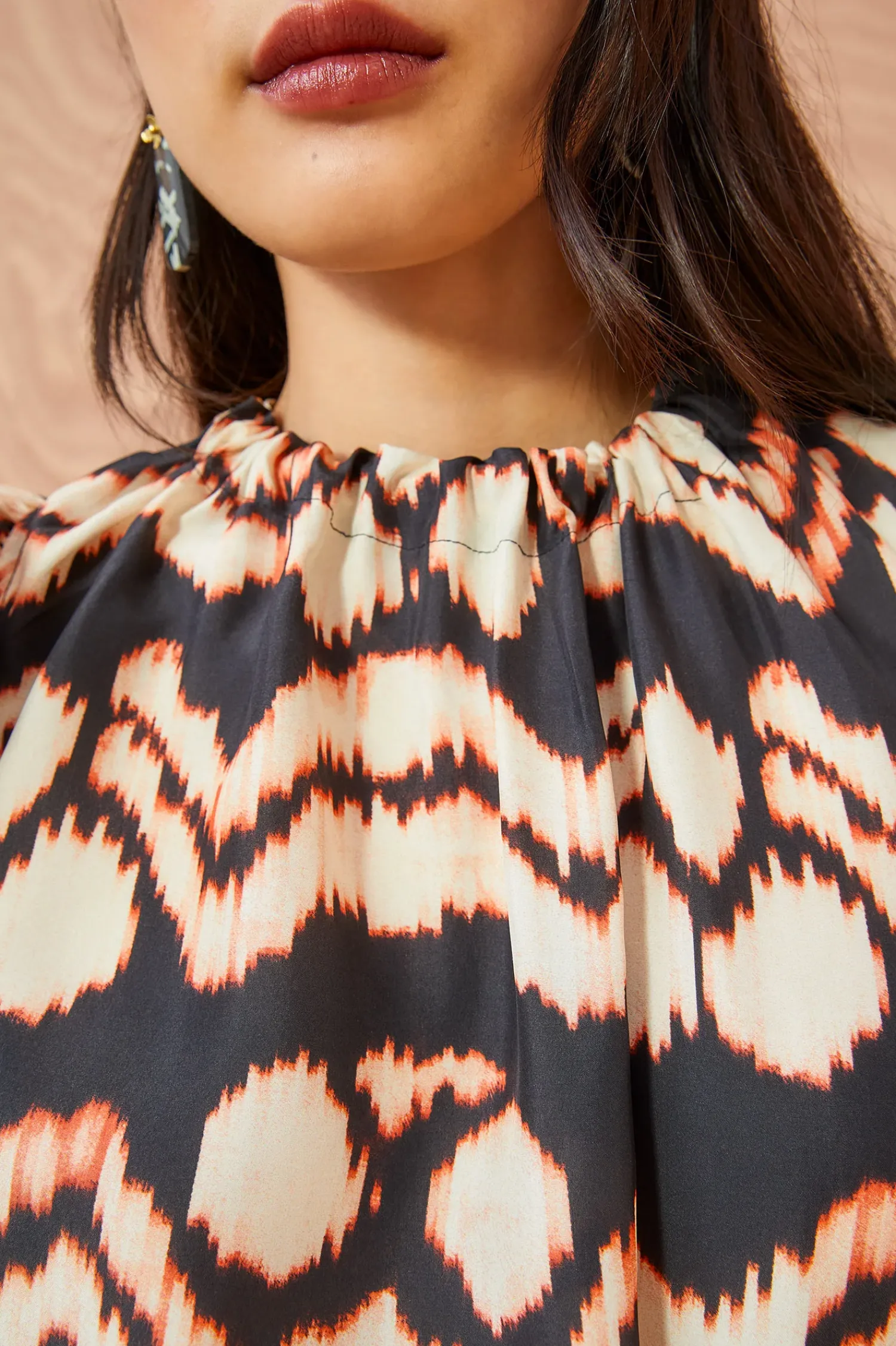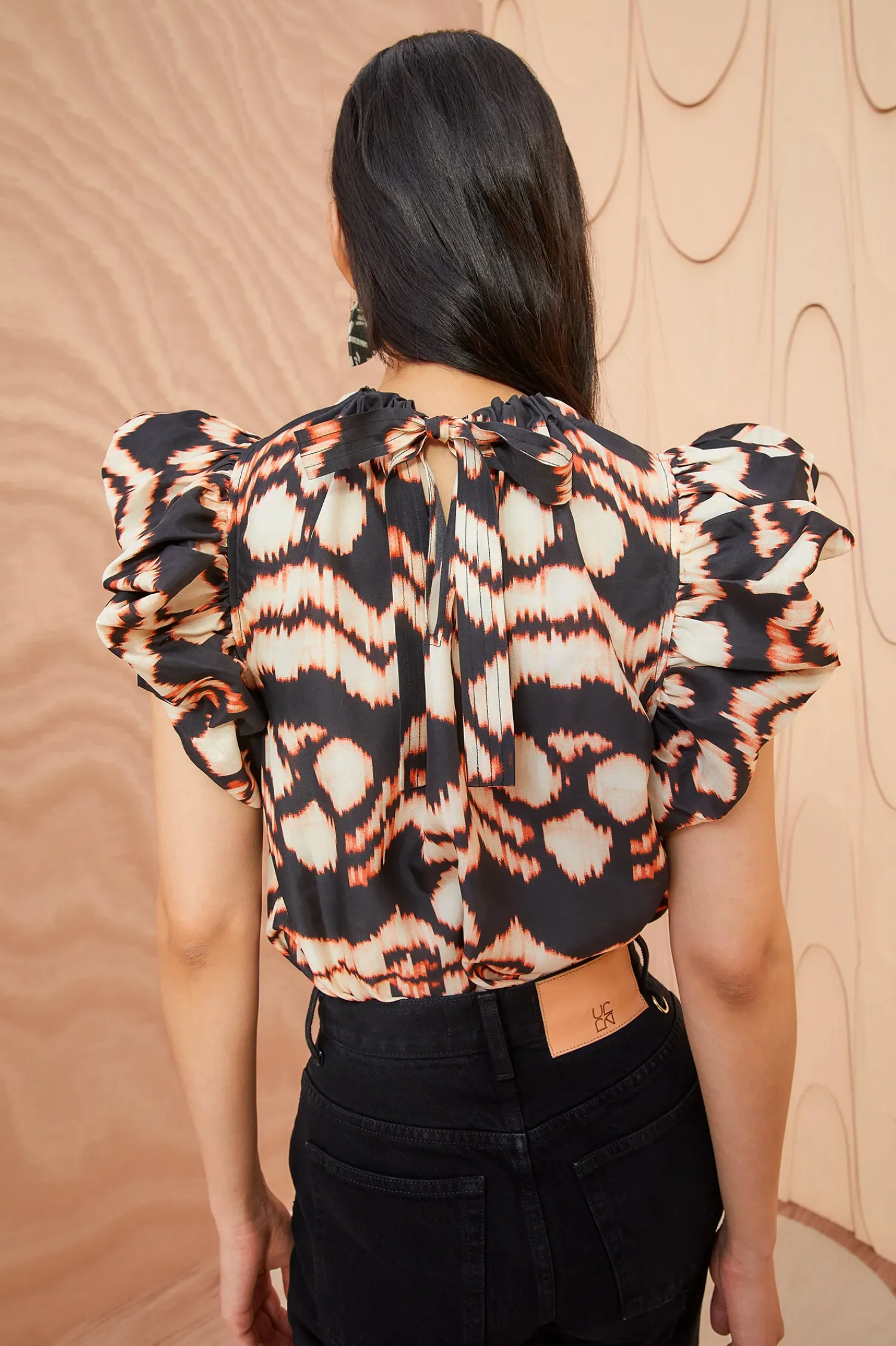 A Standout Print From Our Autumn/Winter ’23 Collection, The Iren Top Is Saturated In Our Painted Ikat Motif With Cream Graphics Against A Black Backdrop. It Is Framed By Voluminous Flutter Sleeves, Has A Loose Silhouette, And A Tie-Fastening Keyhole At The Back. Wear Yours With One Of Our Handmade Denim Styles.